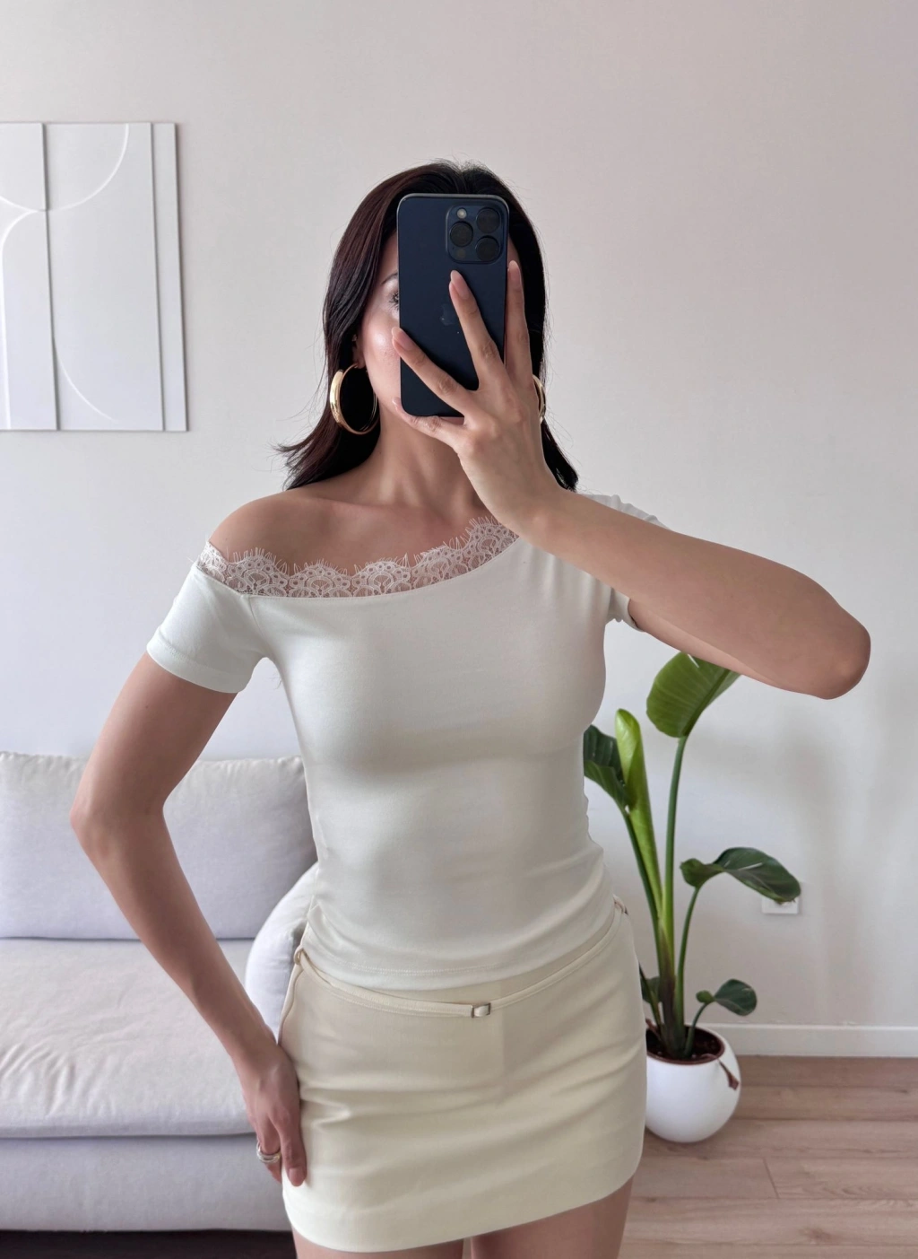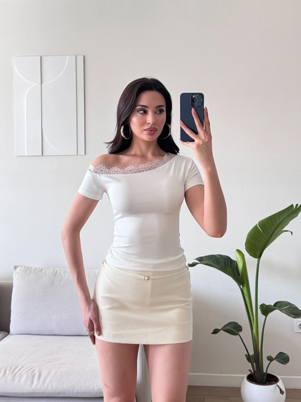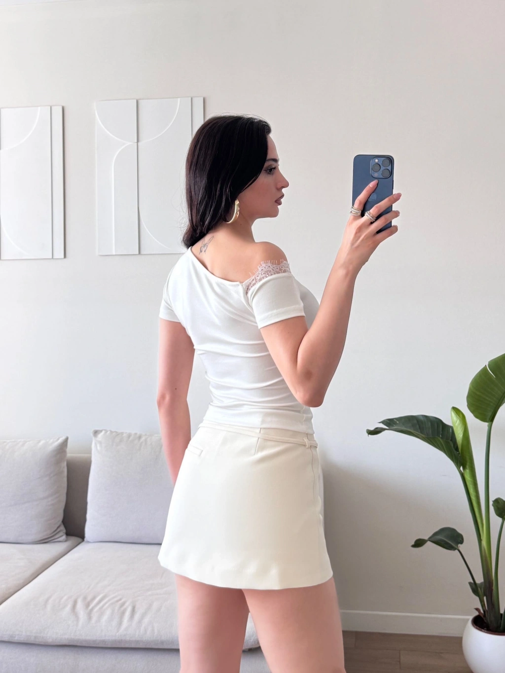 Kayık Yaka Dantel Detay Crop - BEYAZ