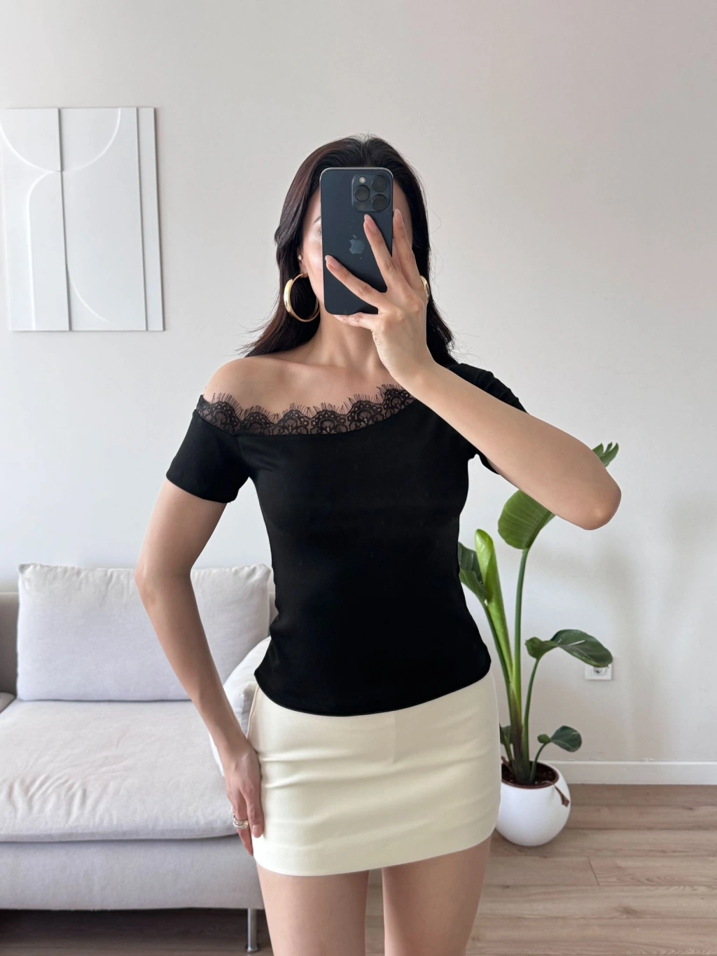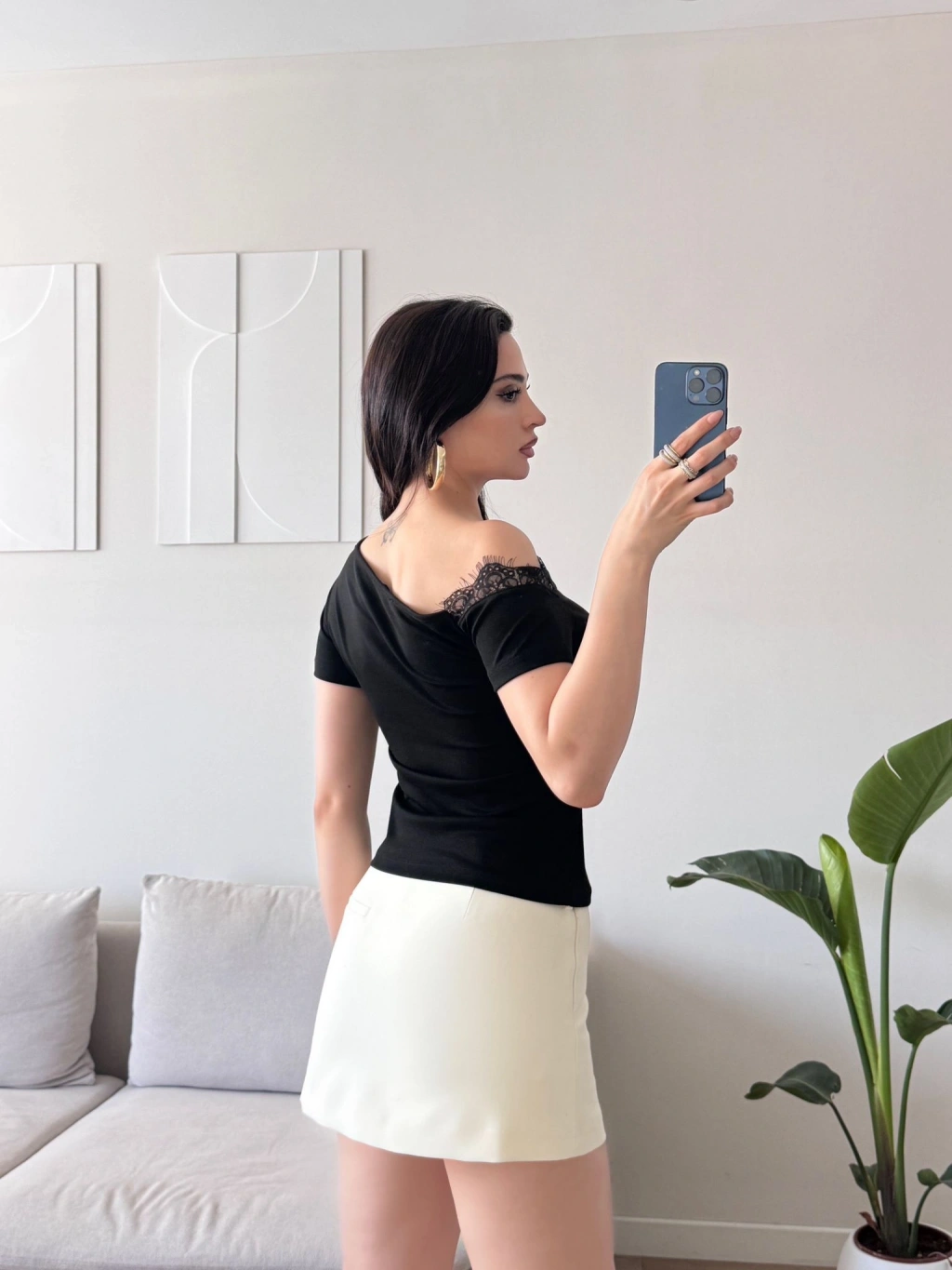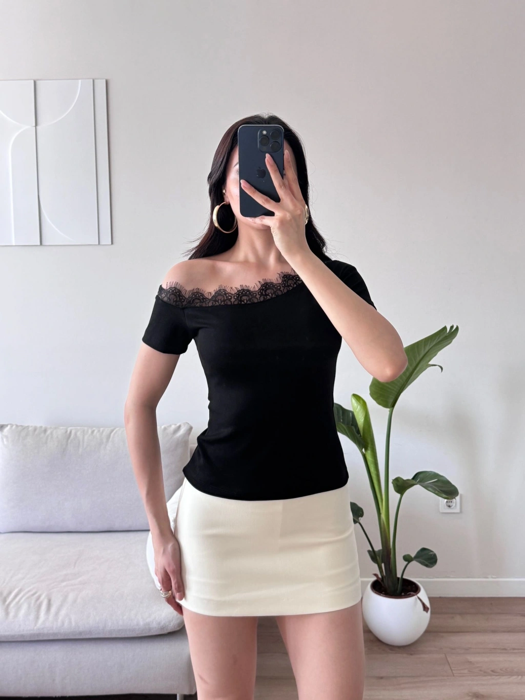 Kayık Yaka Dantel Detay Crop - SİYAH