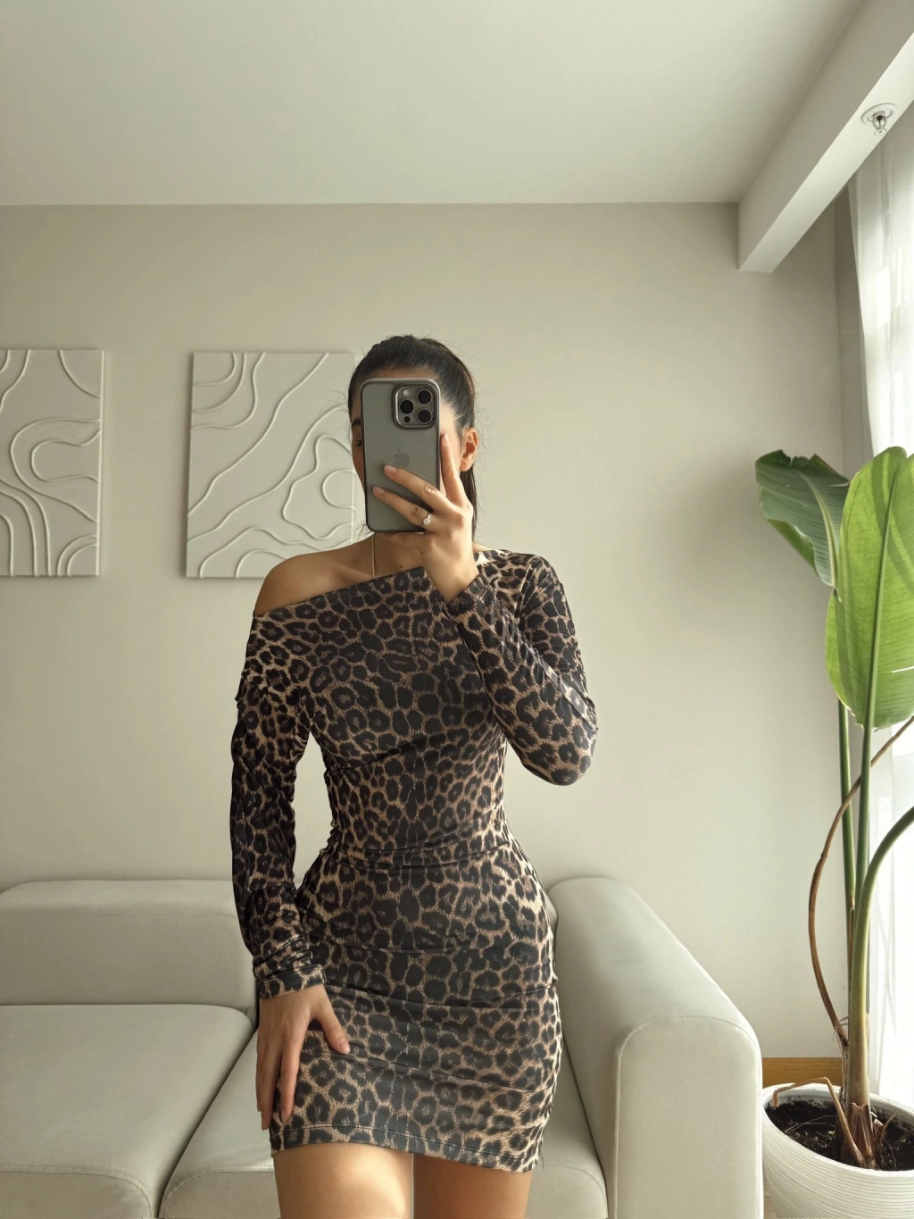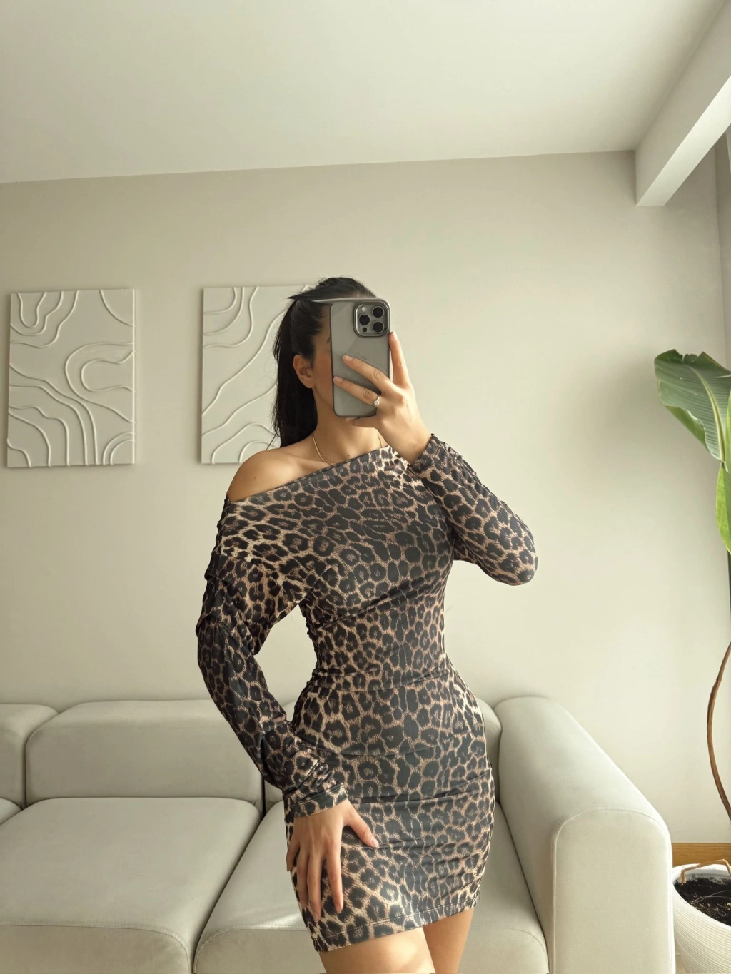 Kayık Yaka Kol Büzgülü Elbise - LEOPAR