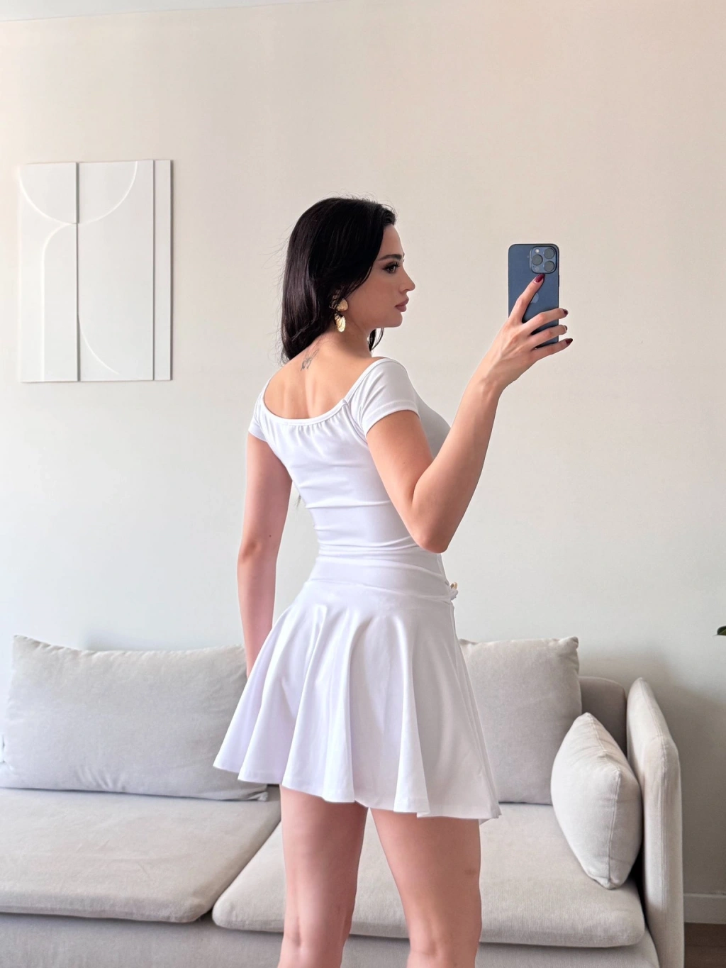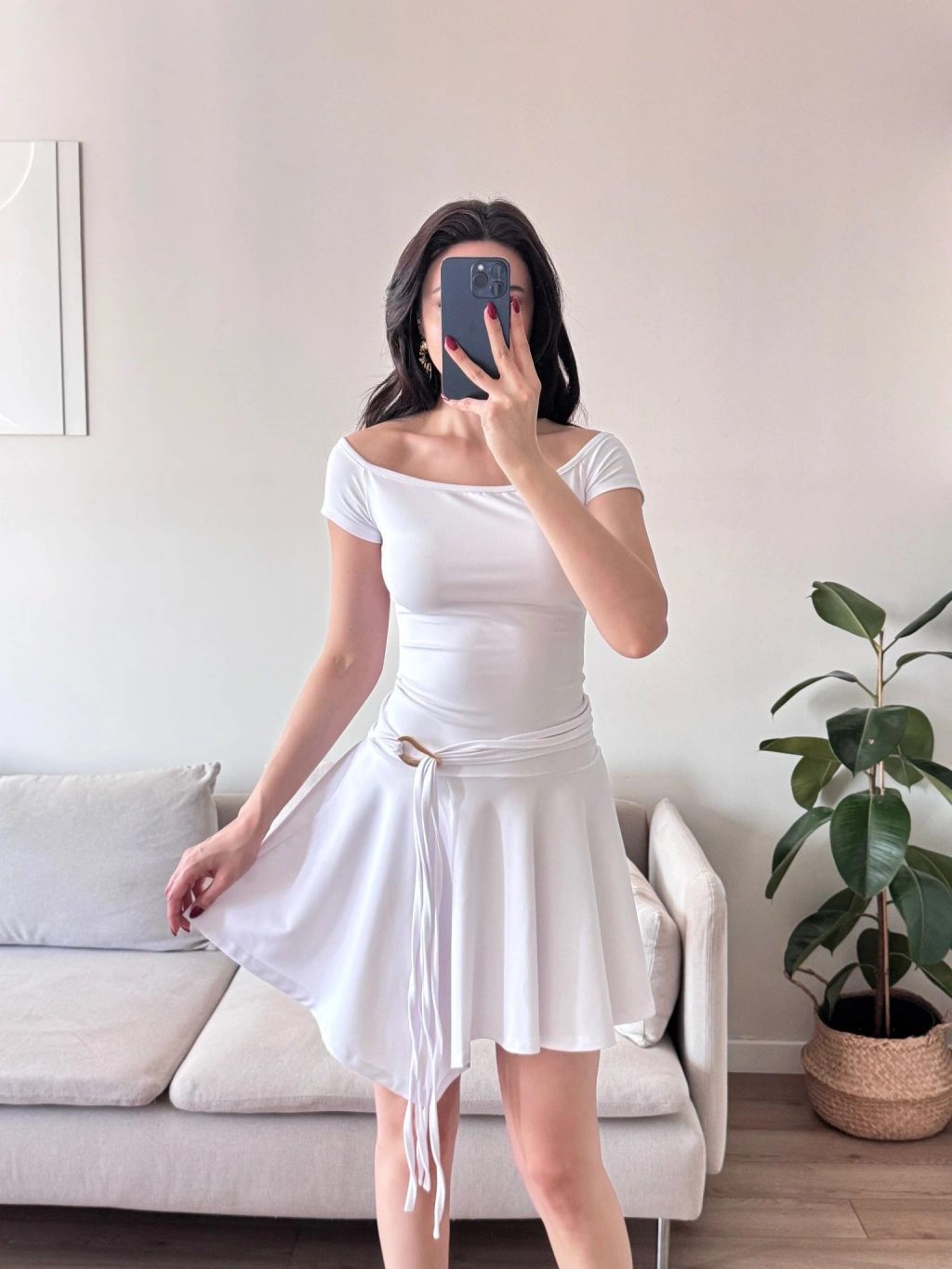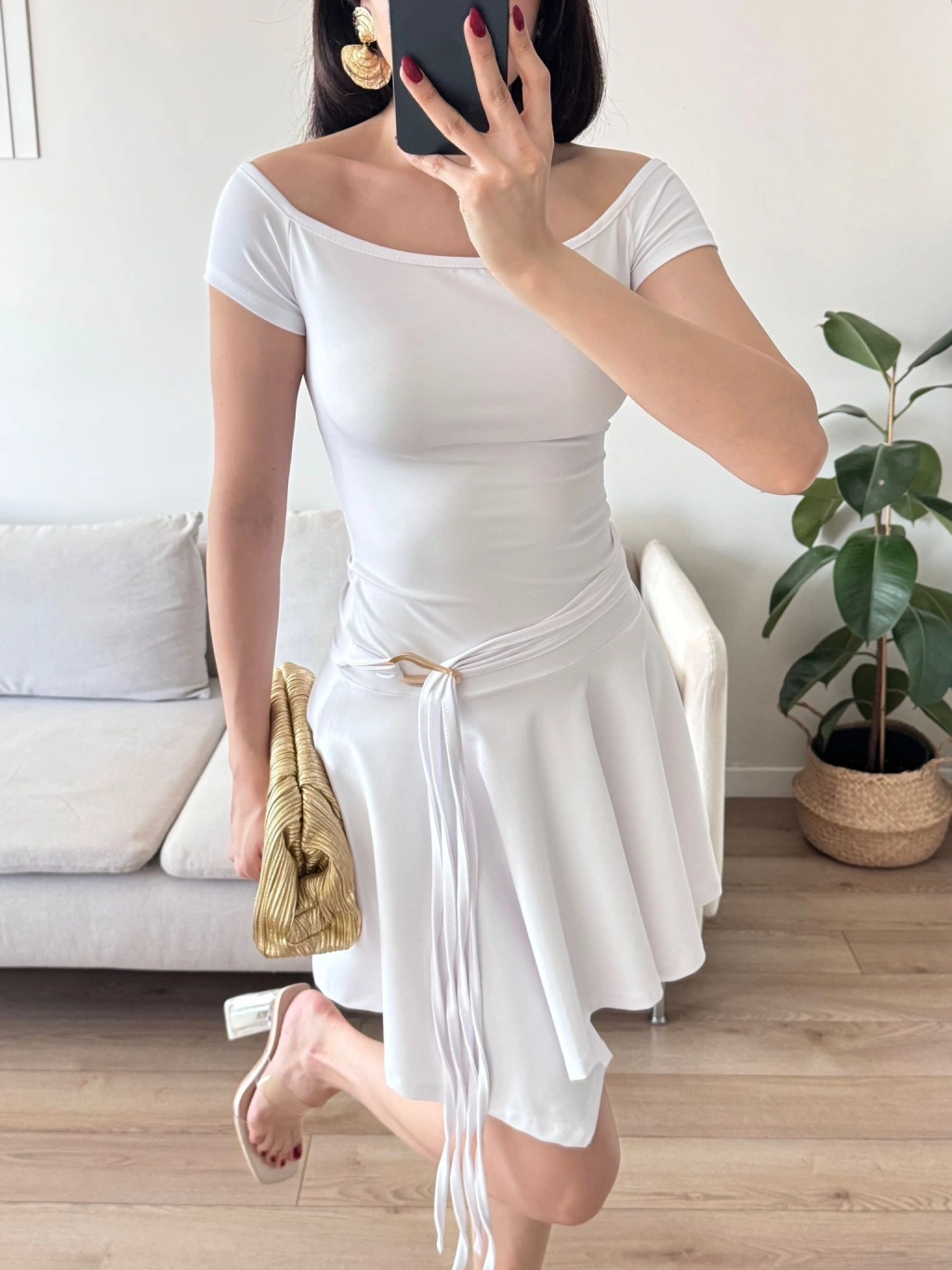 Kayık Yaka Kuşaklı Elbise - BEYAZ