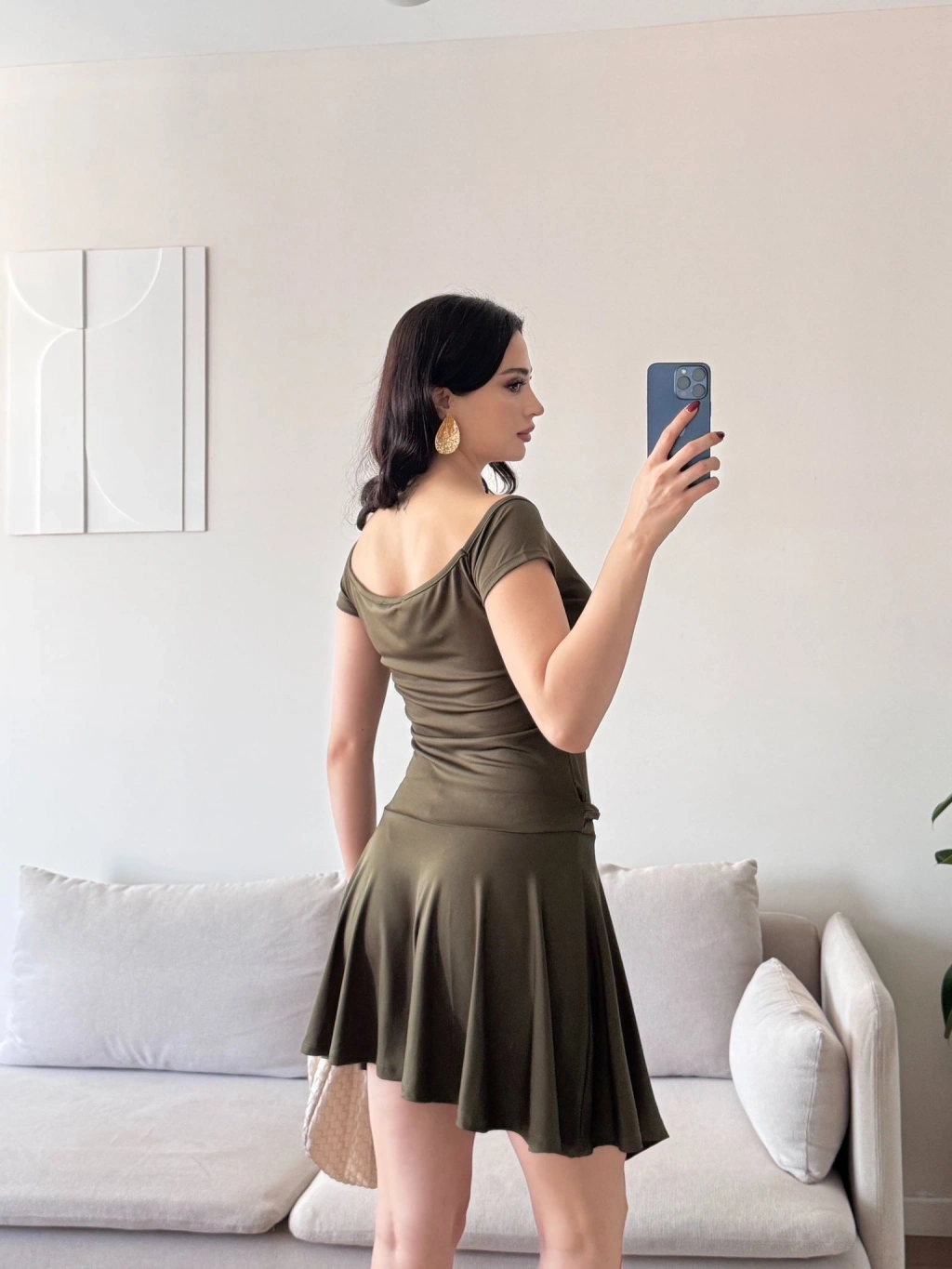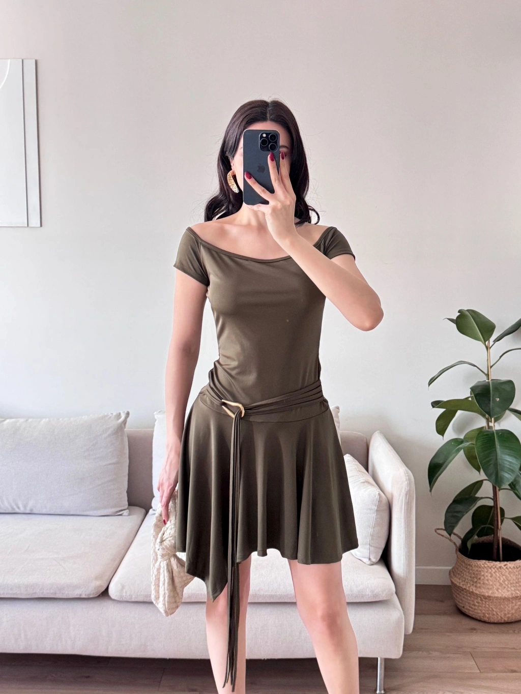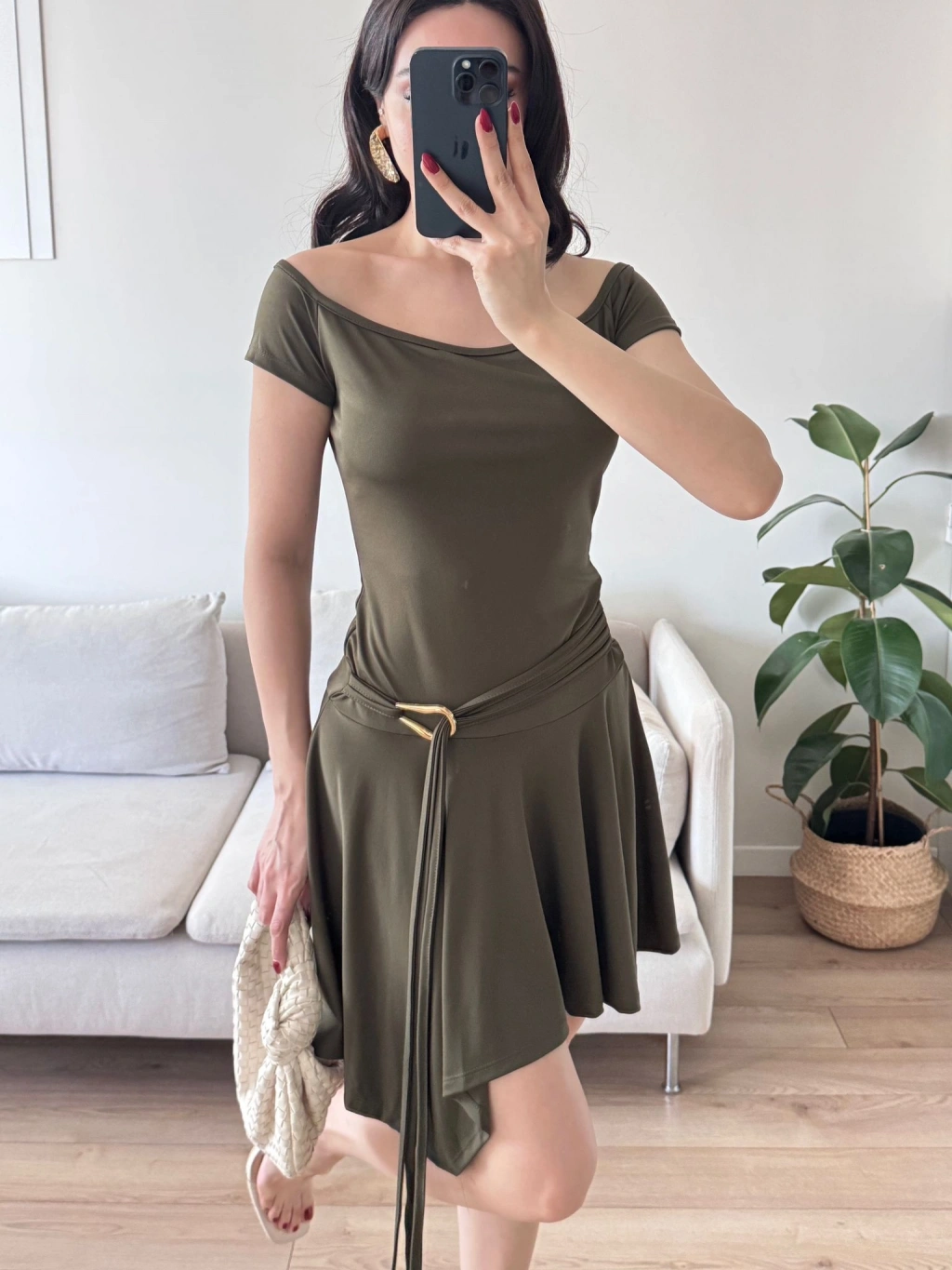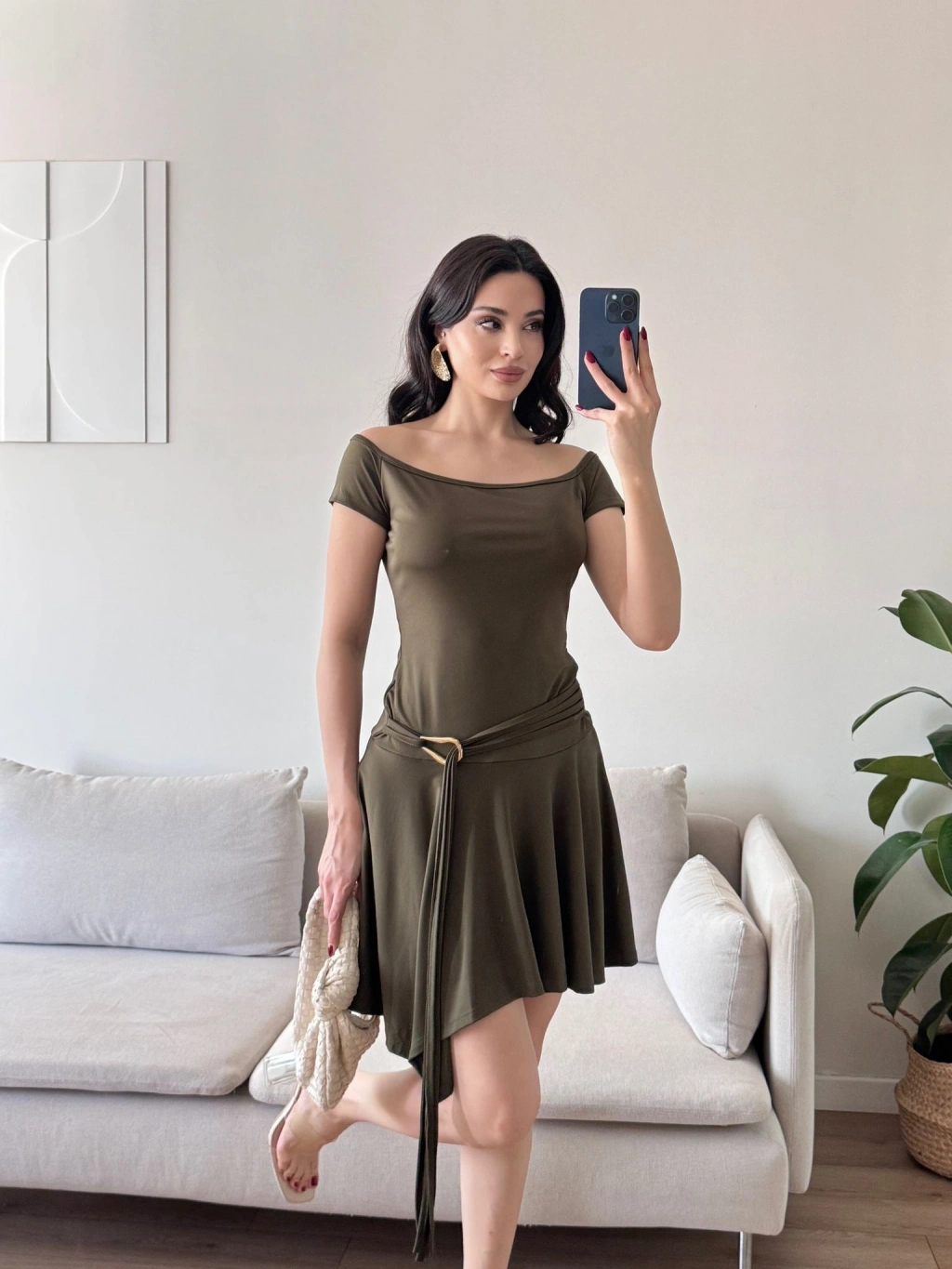 Kayık Yaka Kuşaklı Elbise - HAKİ