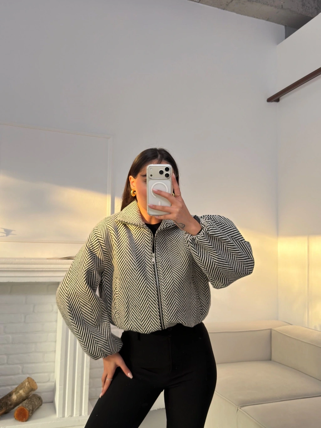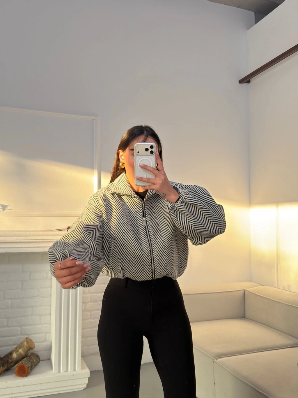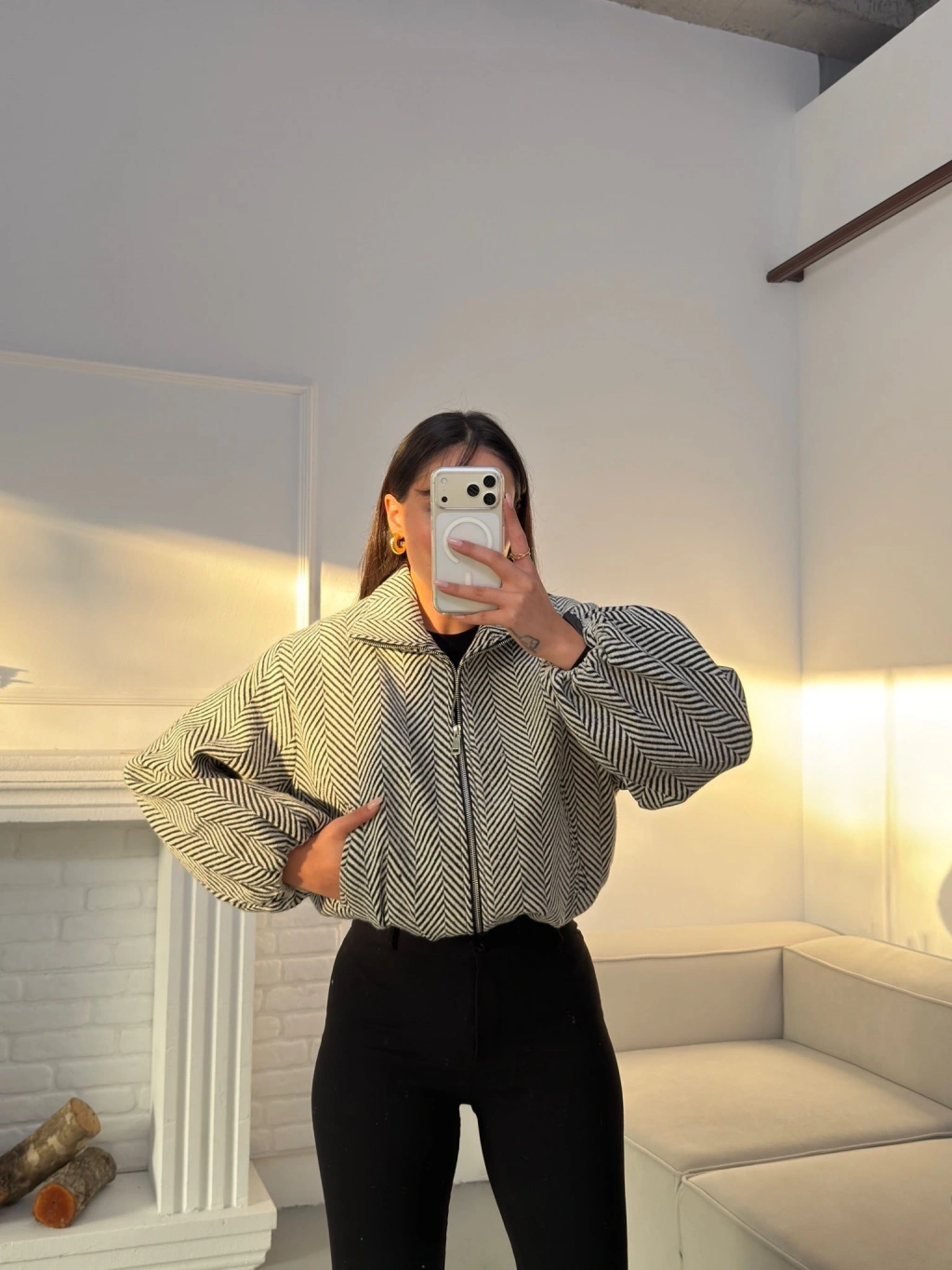 Kırçıllı Fermuar Ceket - BEYAZ