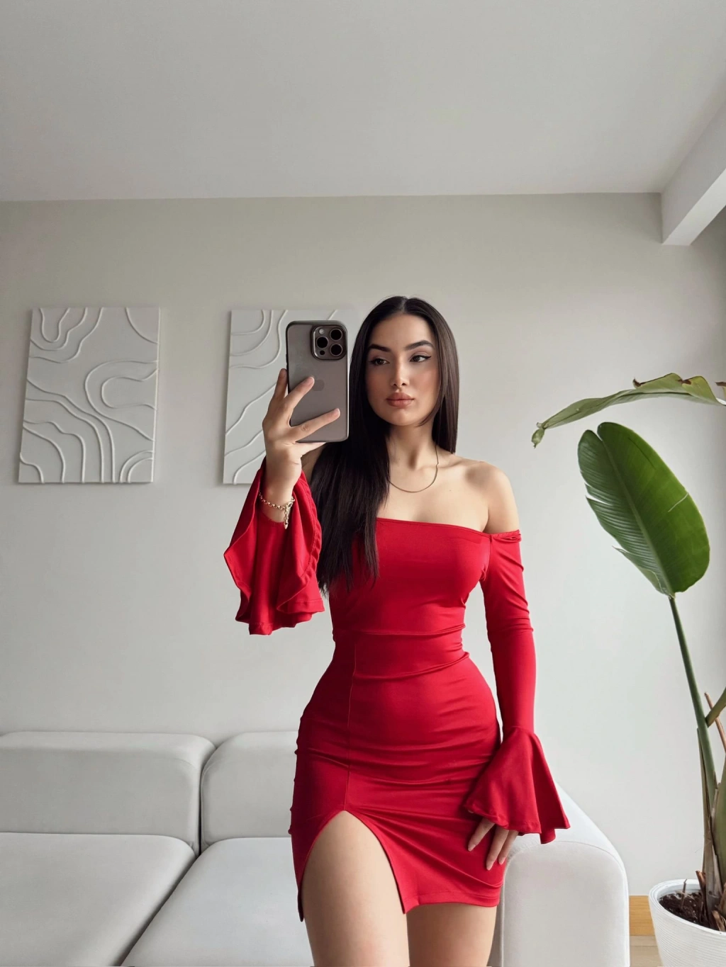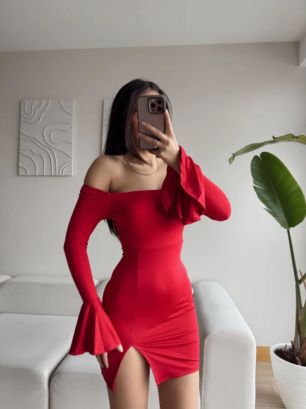 Kol İspanyol Yırtmaç Detay Elbise - KIRMIZI