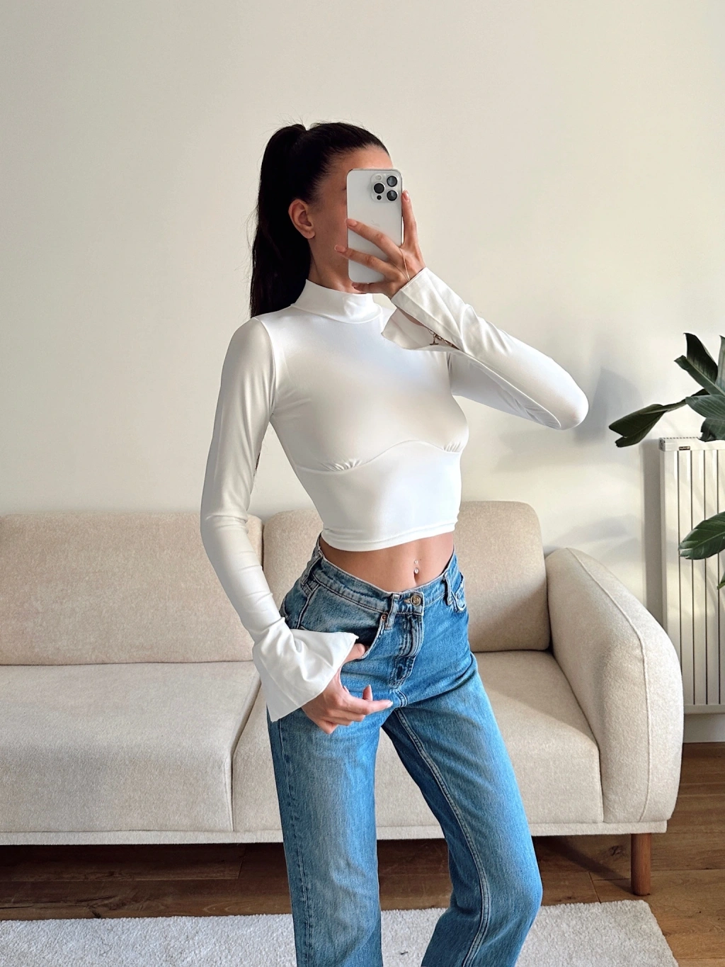 Kol Yırtmaç Yarım Balıkçı Crop - BEYAZ