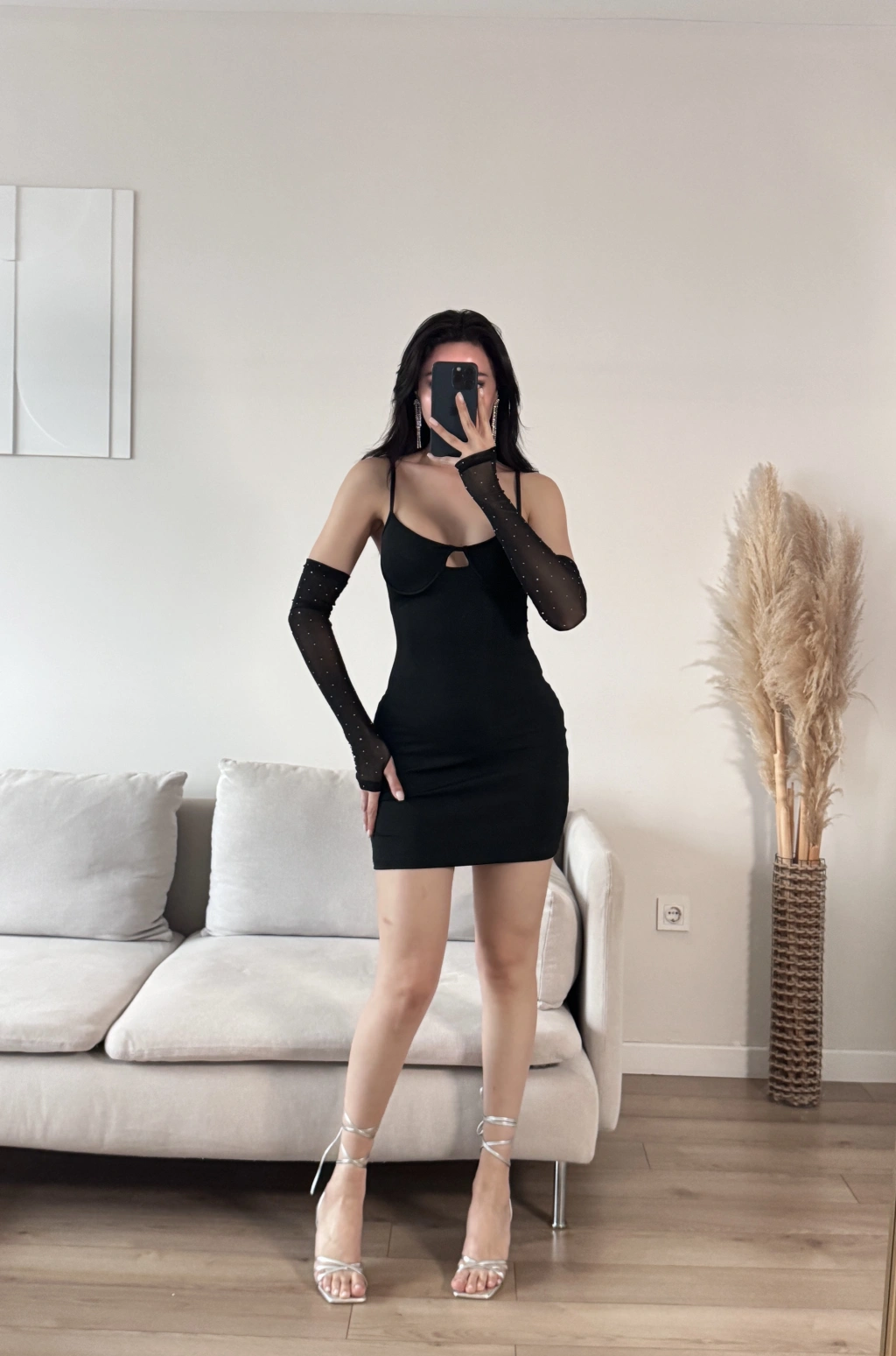 Kolu Taşlı Gloplu Elbise - SİYAH