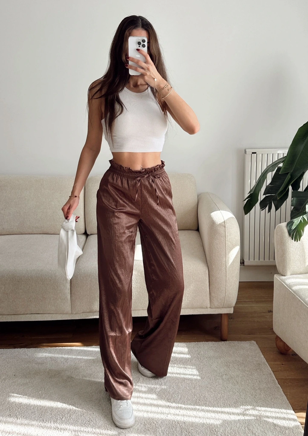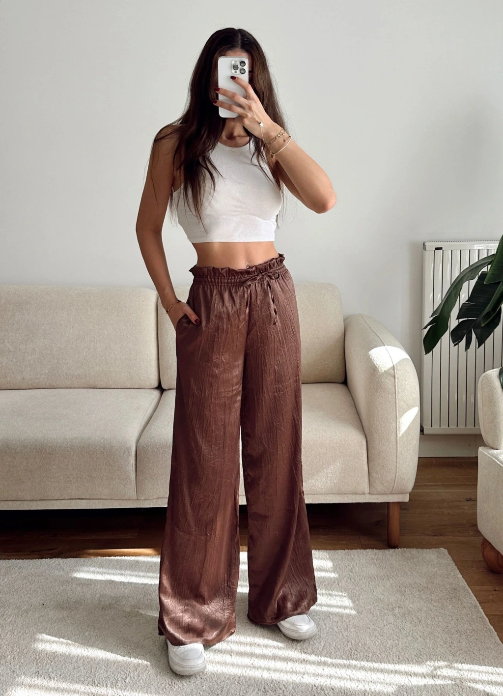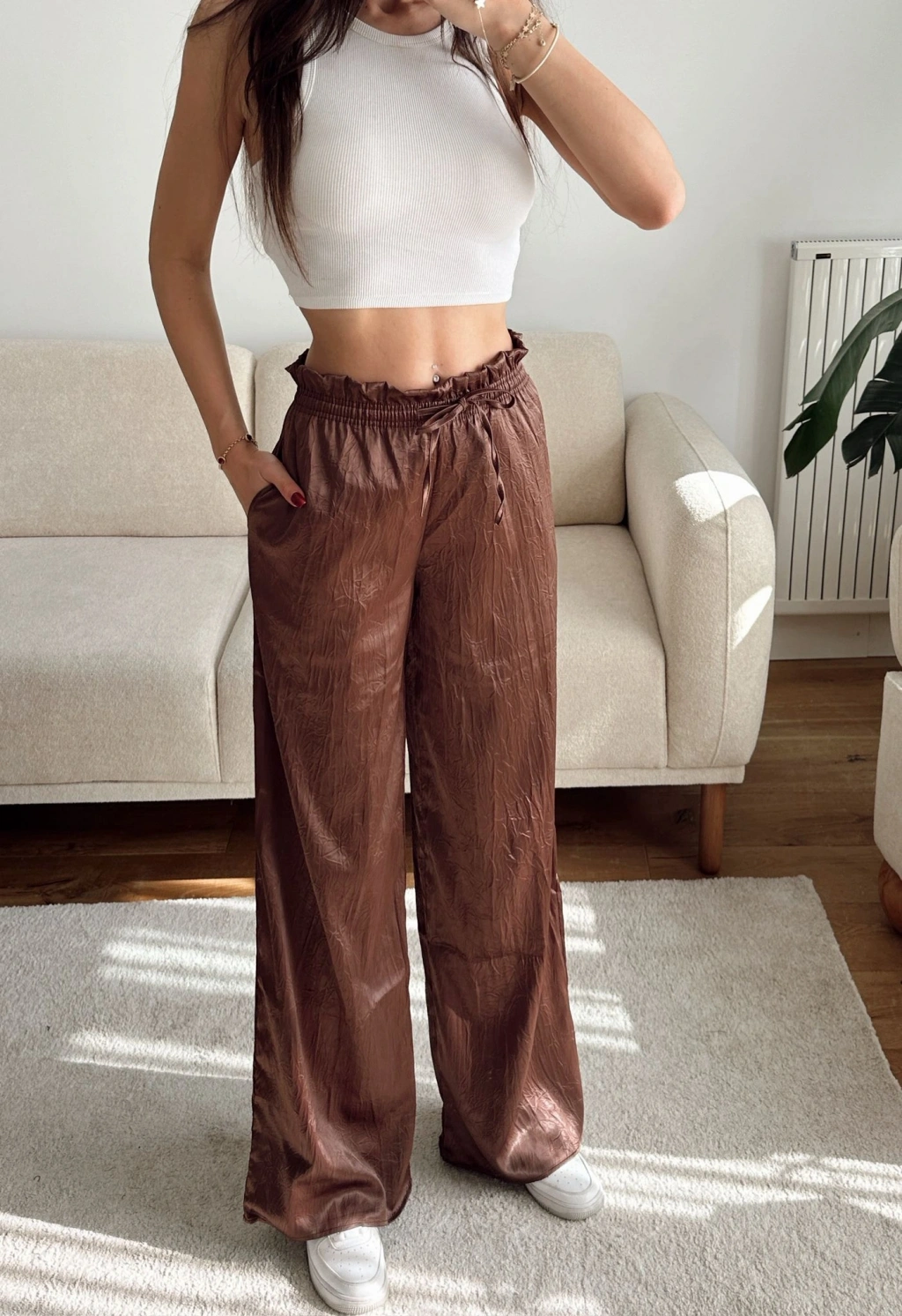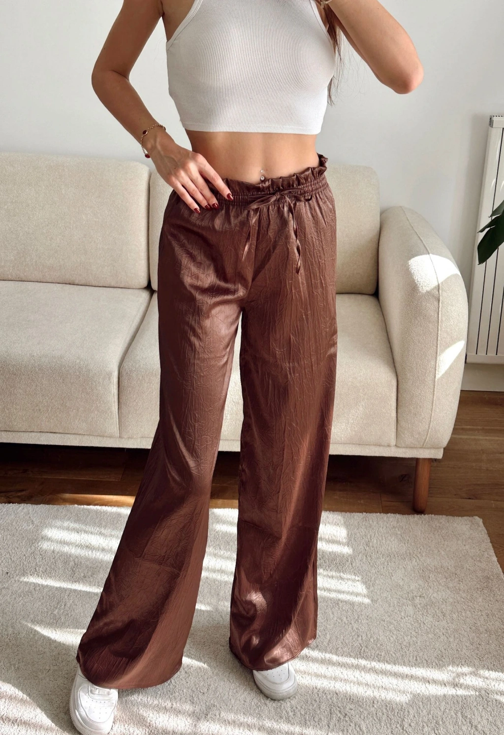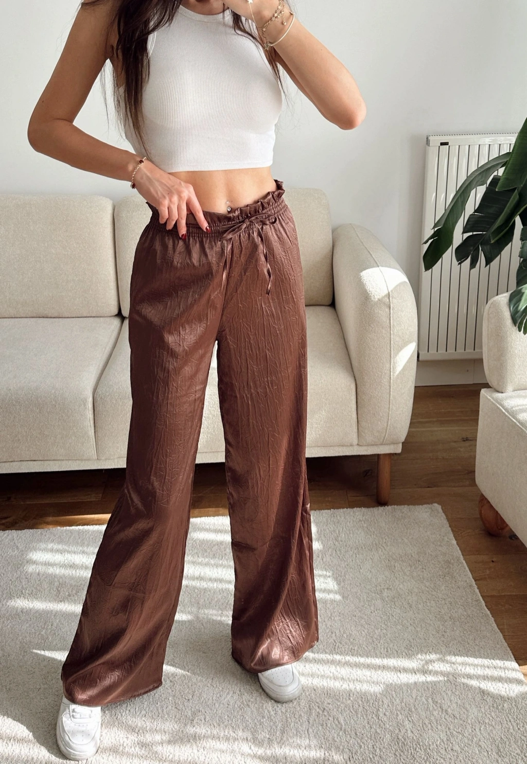 Kraşlı Bol Paça Pantolon - KAHVE