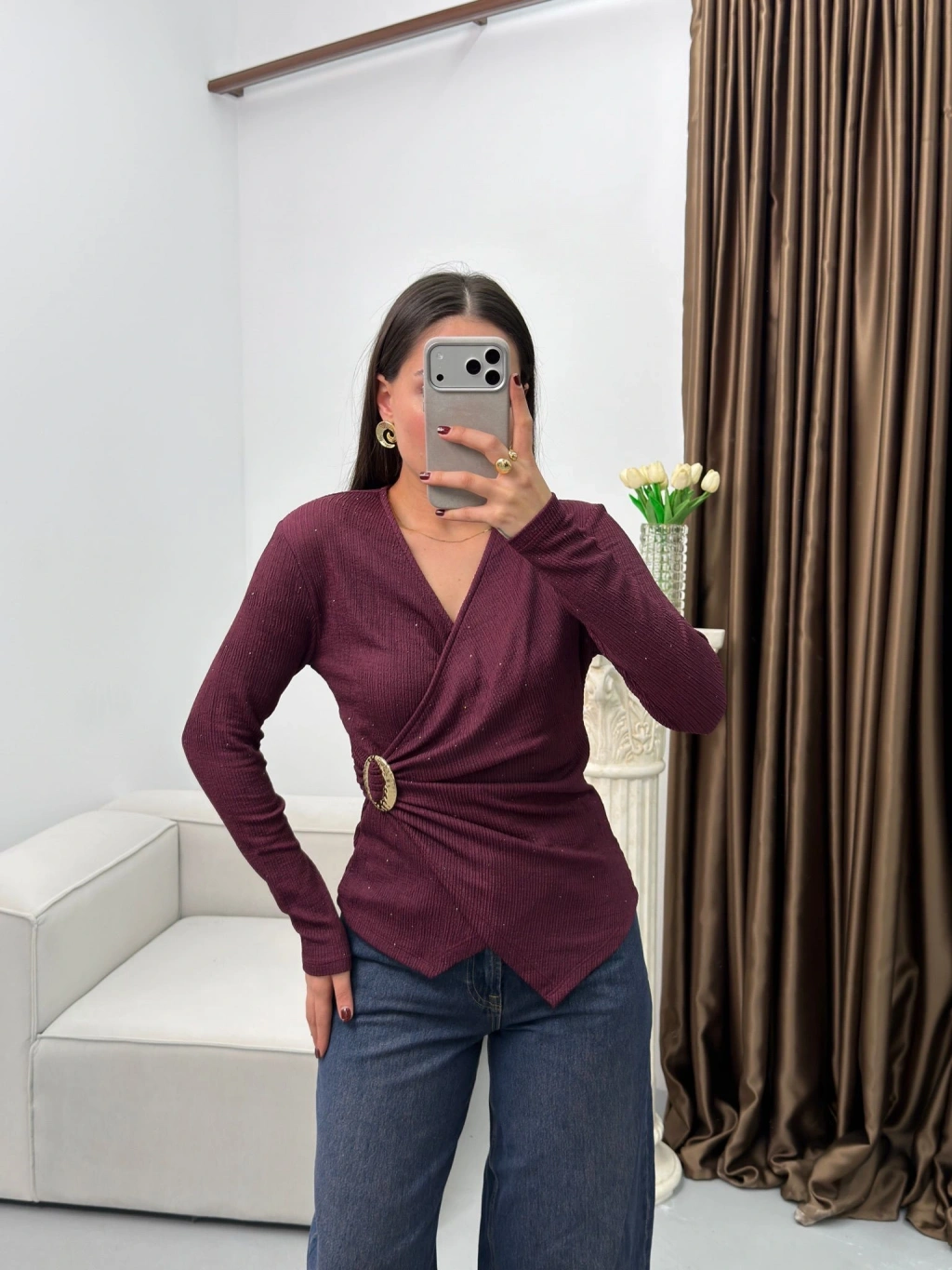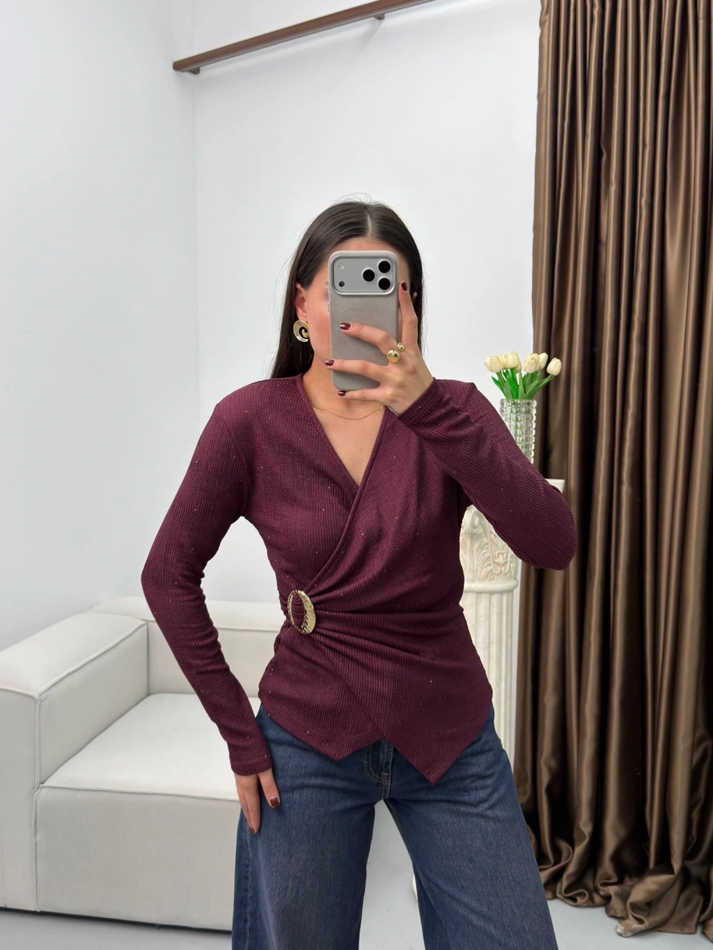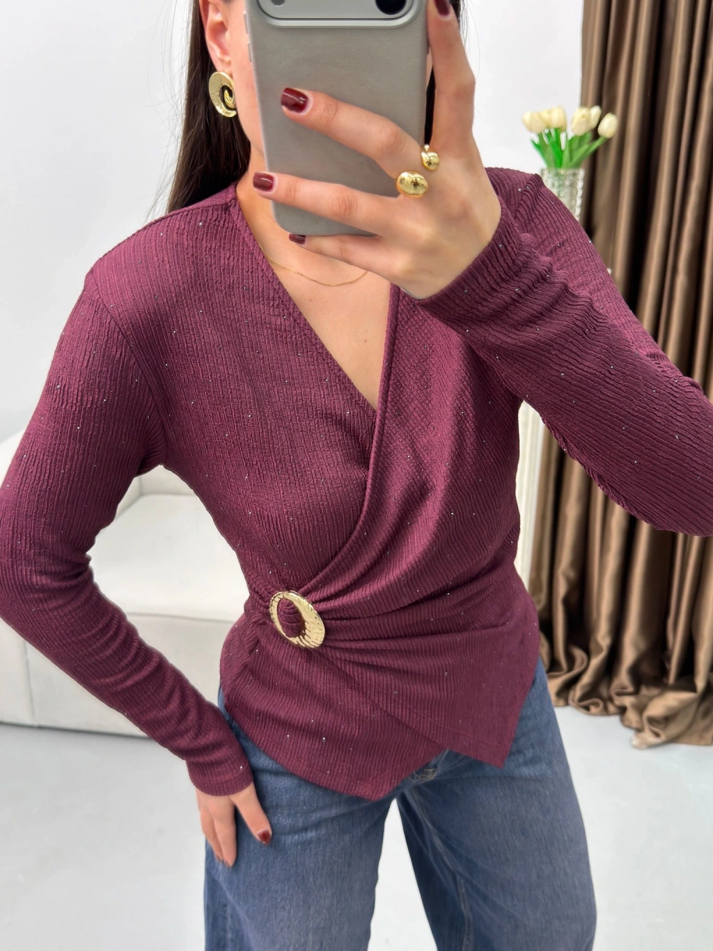 Kruvaze Aksesuarlı Taşlı Bluz - BORDO