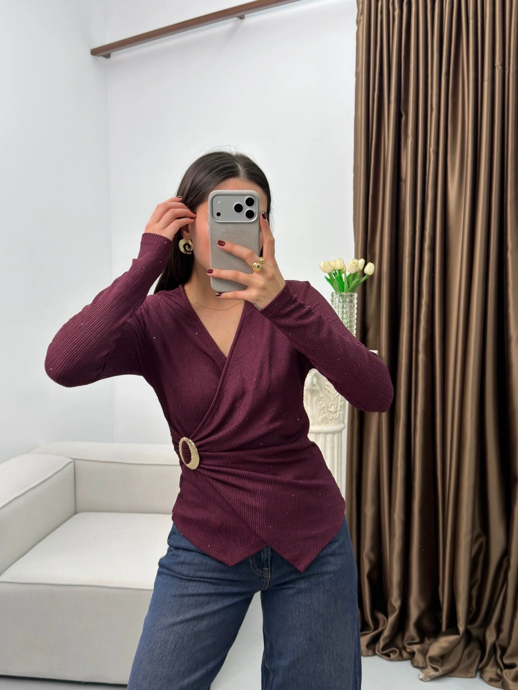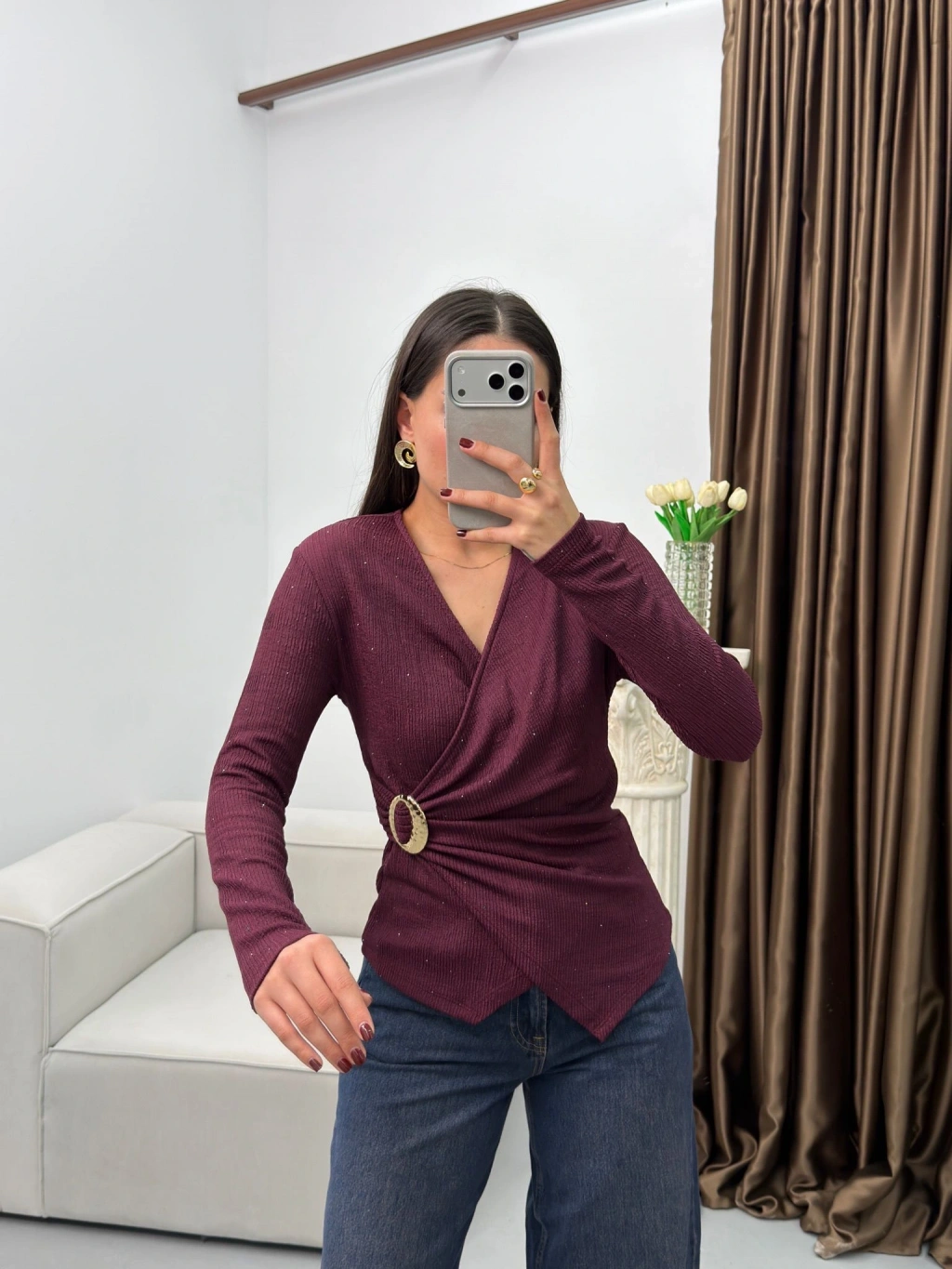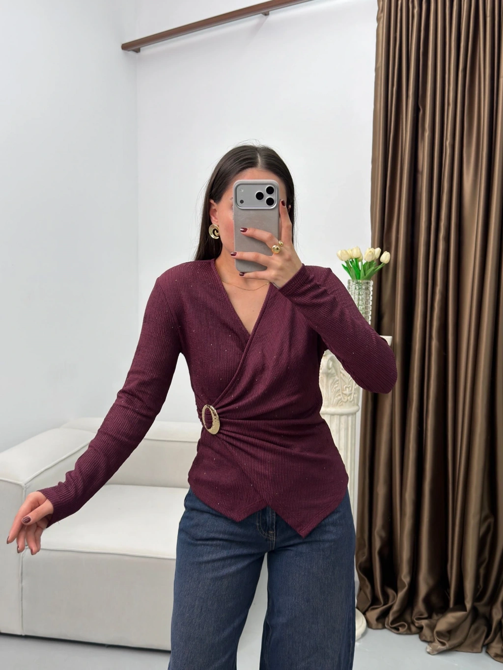 Kruvaze Aksesuarlı Taşlı Bluz - BORDO