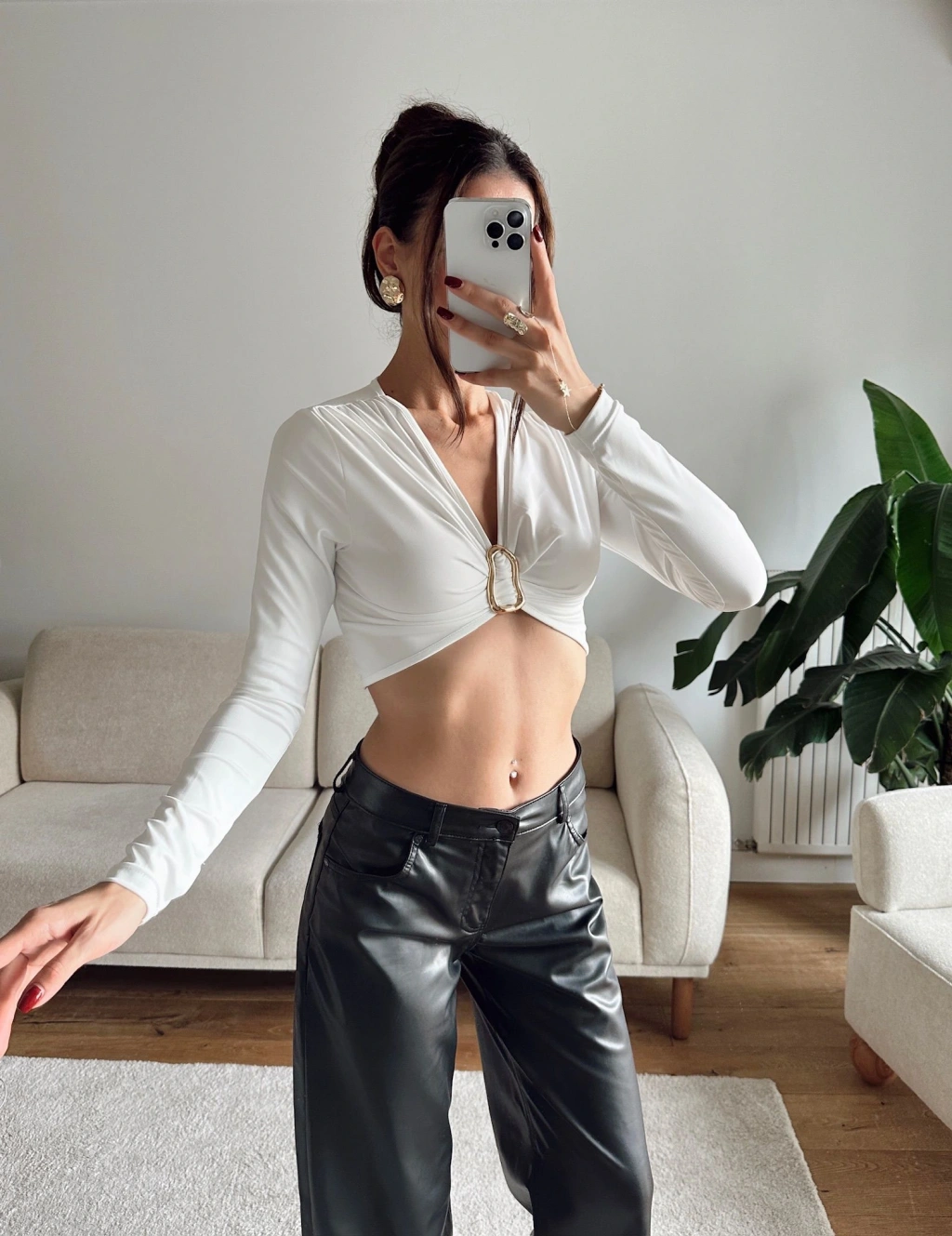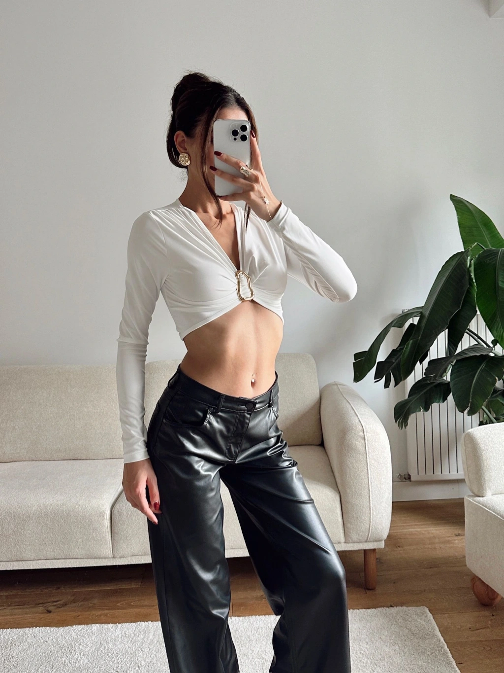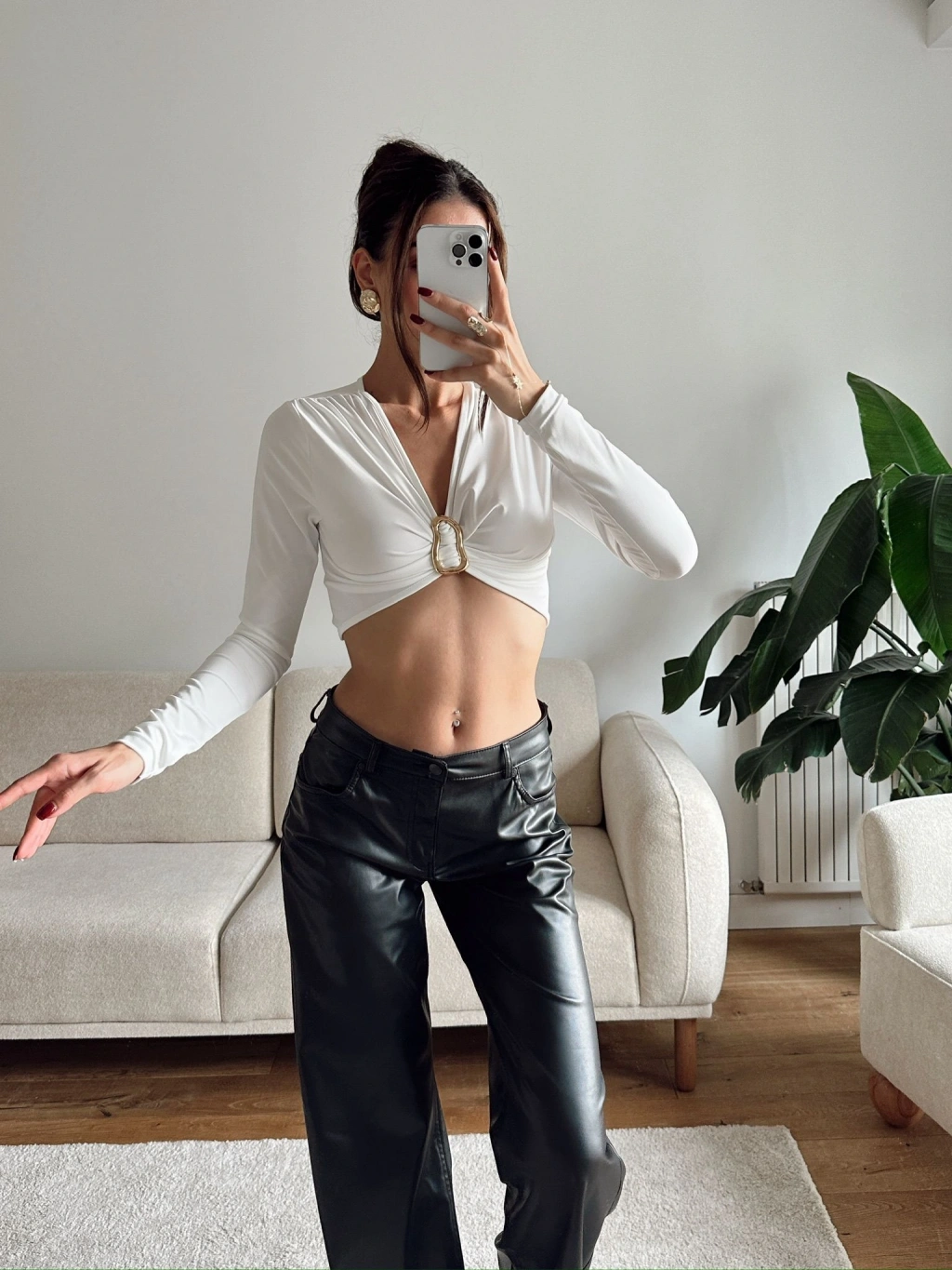 Kruvaze Ön Aksesuar Crop - BEYAZ