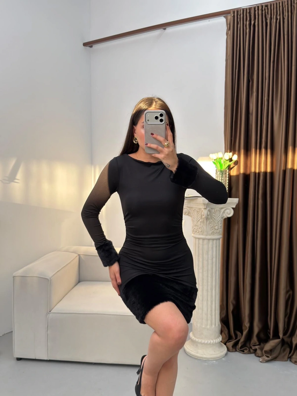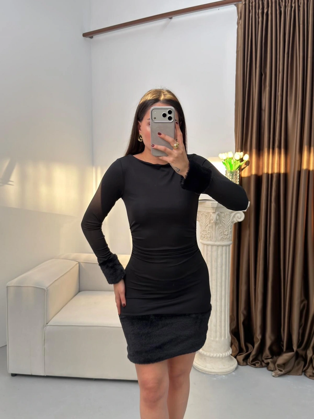 Kürk Detay Elbise - SİYAH
