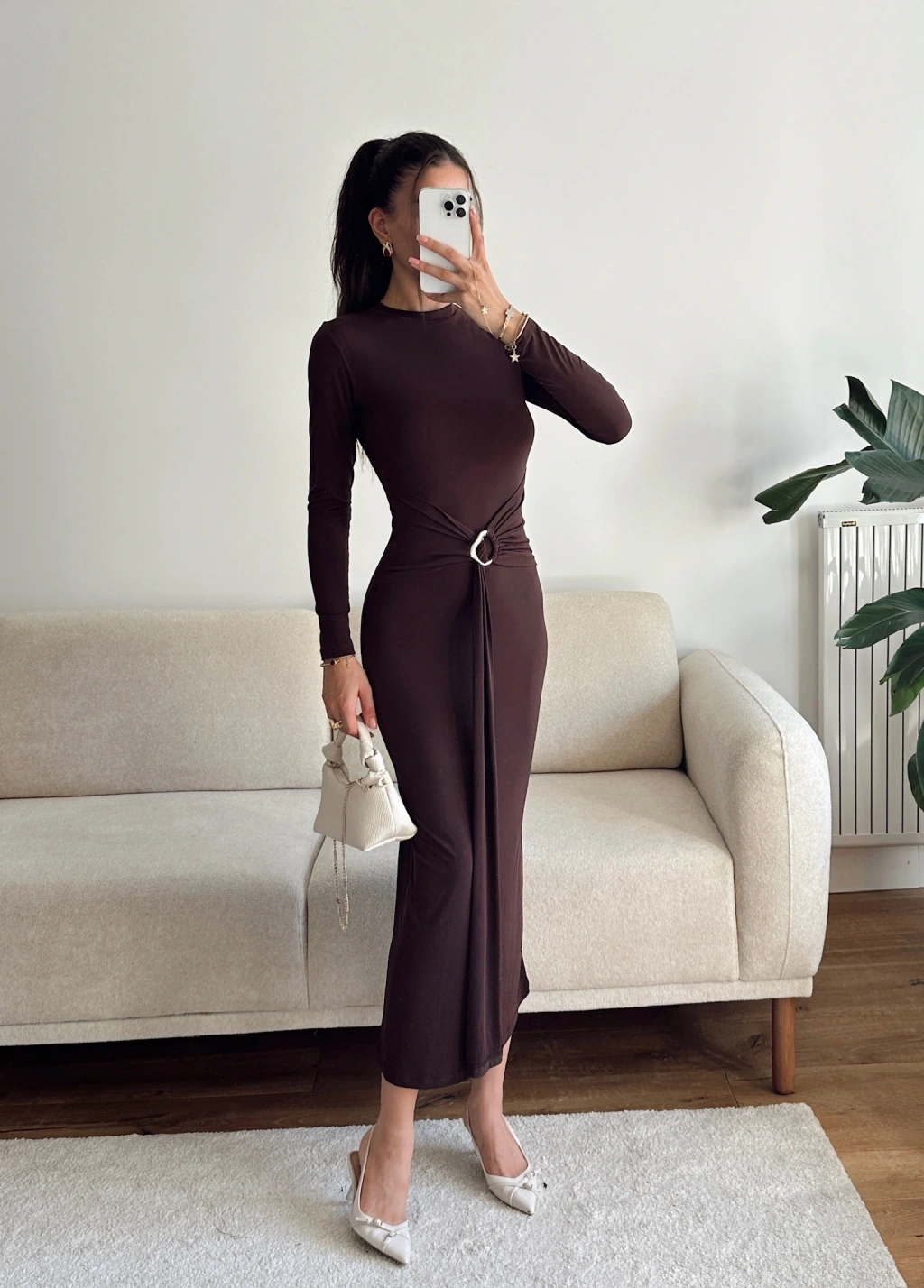 Kuşaklı Toka Detay Elbise - KAHVE