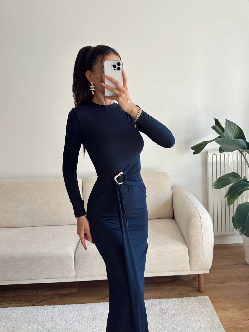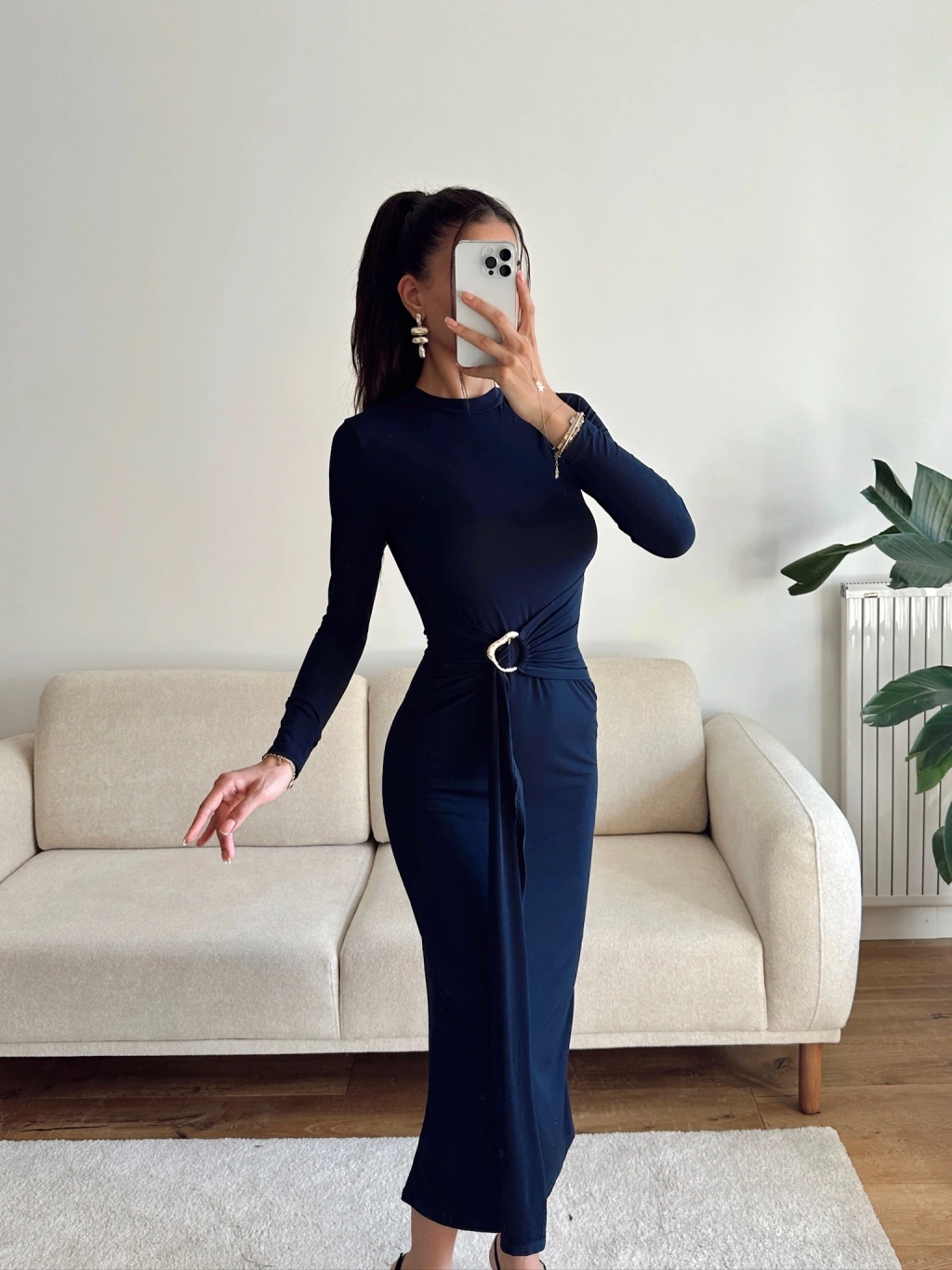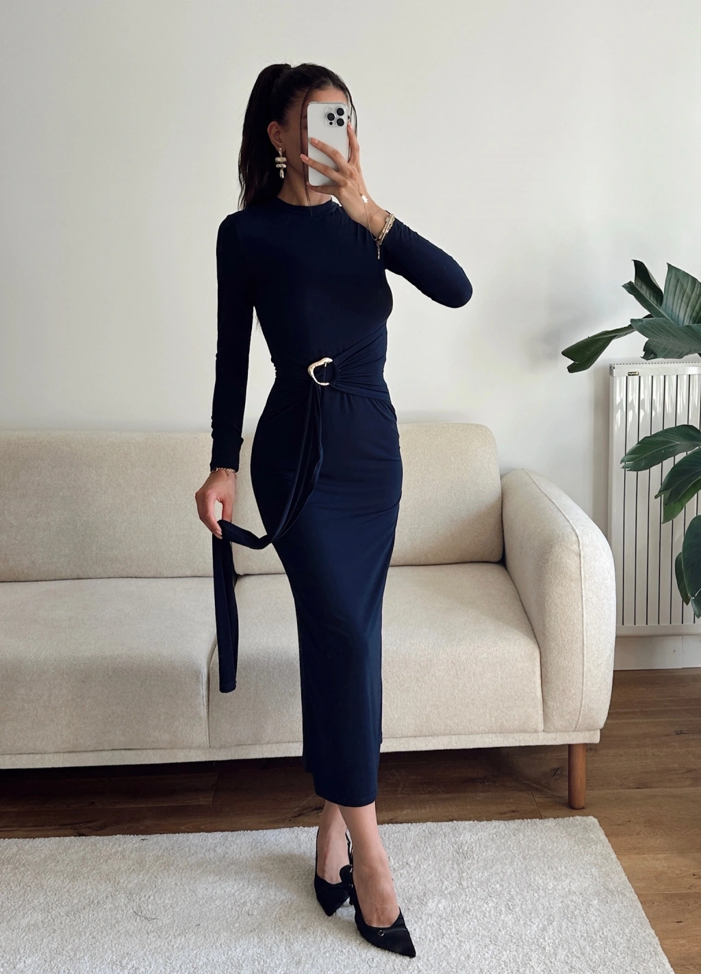 Kuşaklı Toka Detay Elbise - LACİVERT