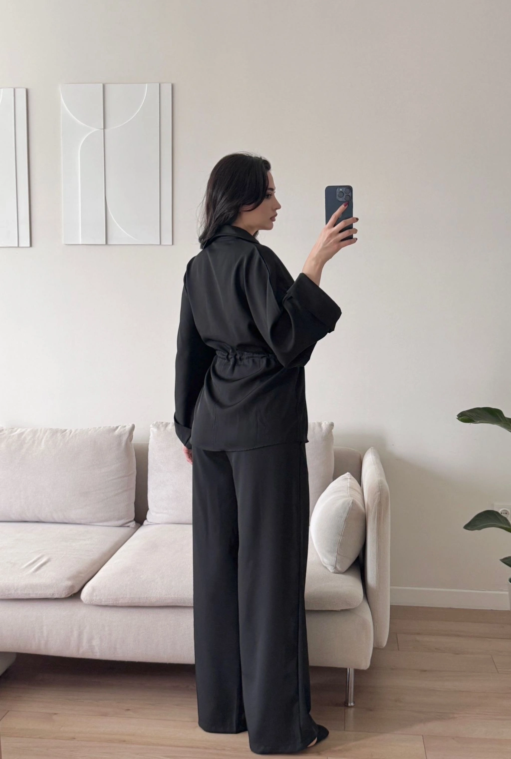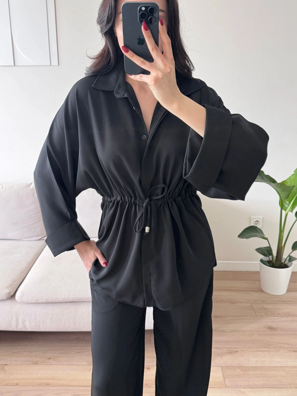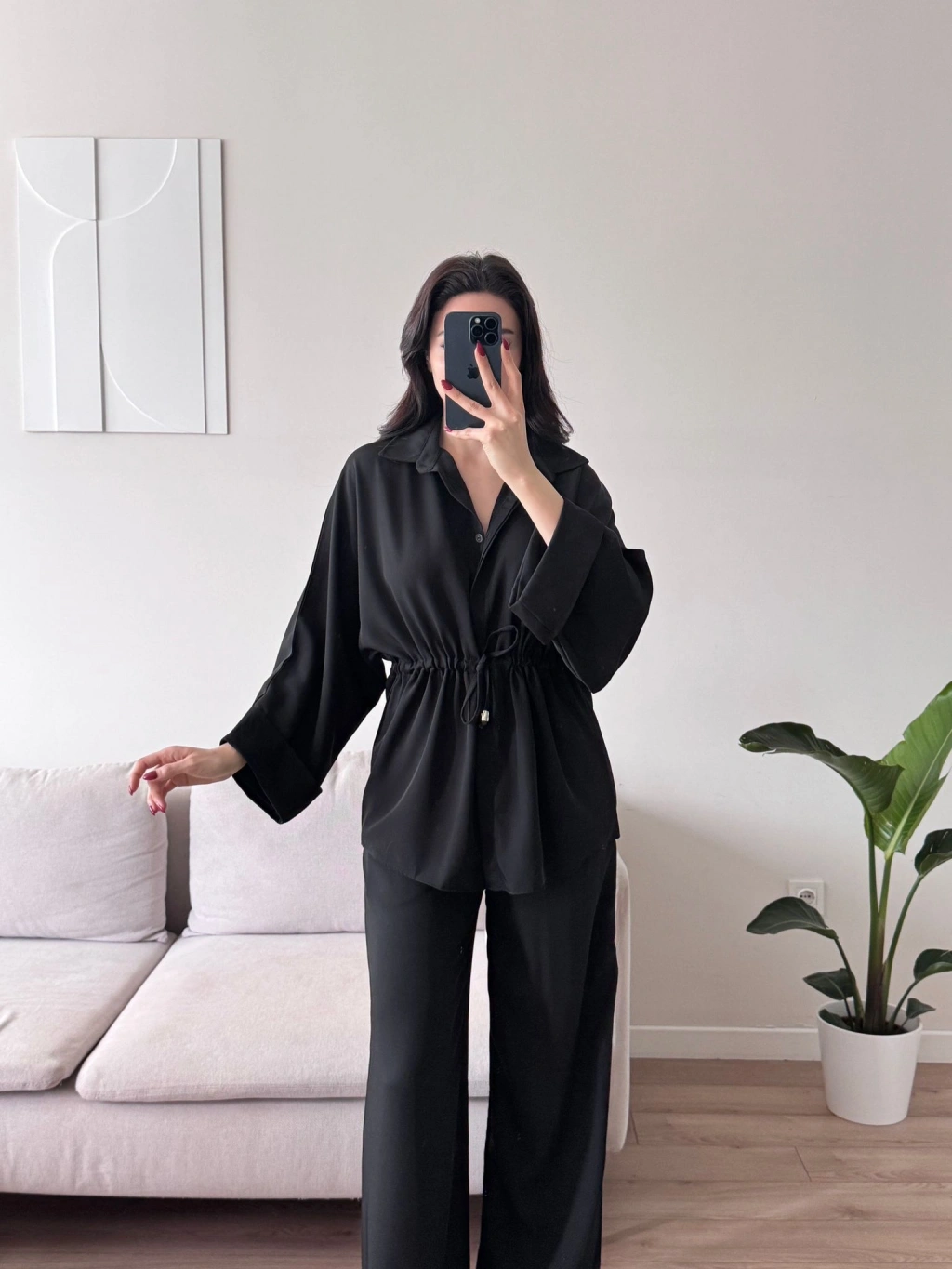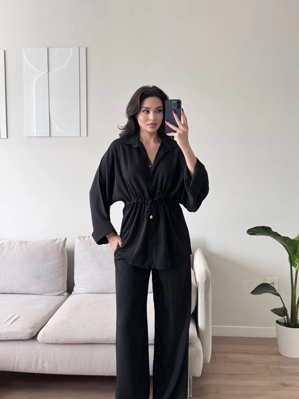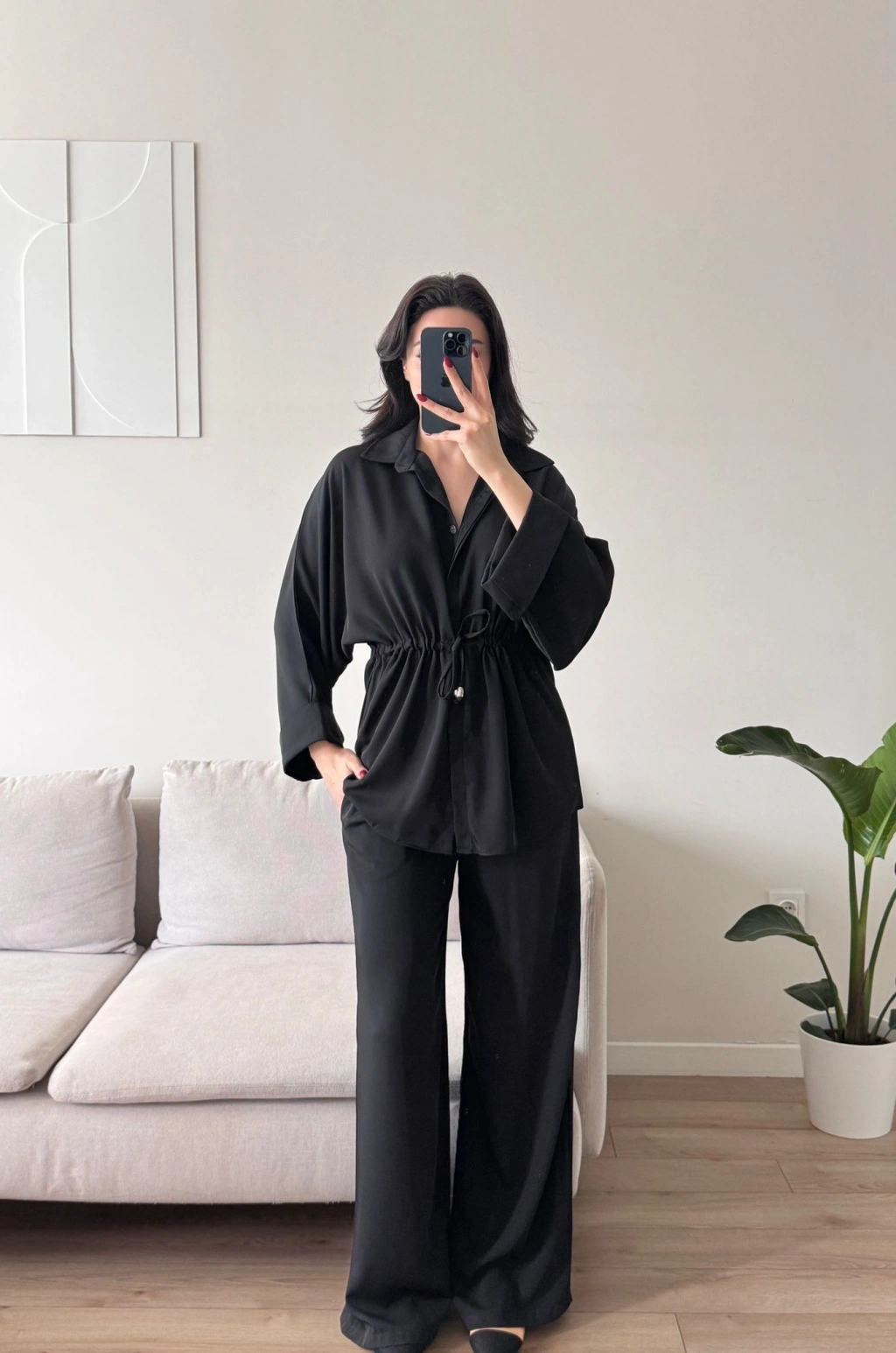 Luna Beli Büzgülü Rahat Kesim İkili Takım - SİYAH