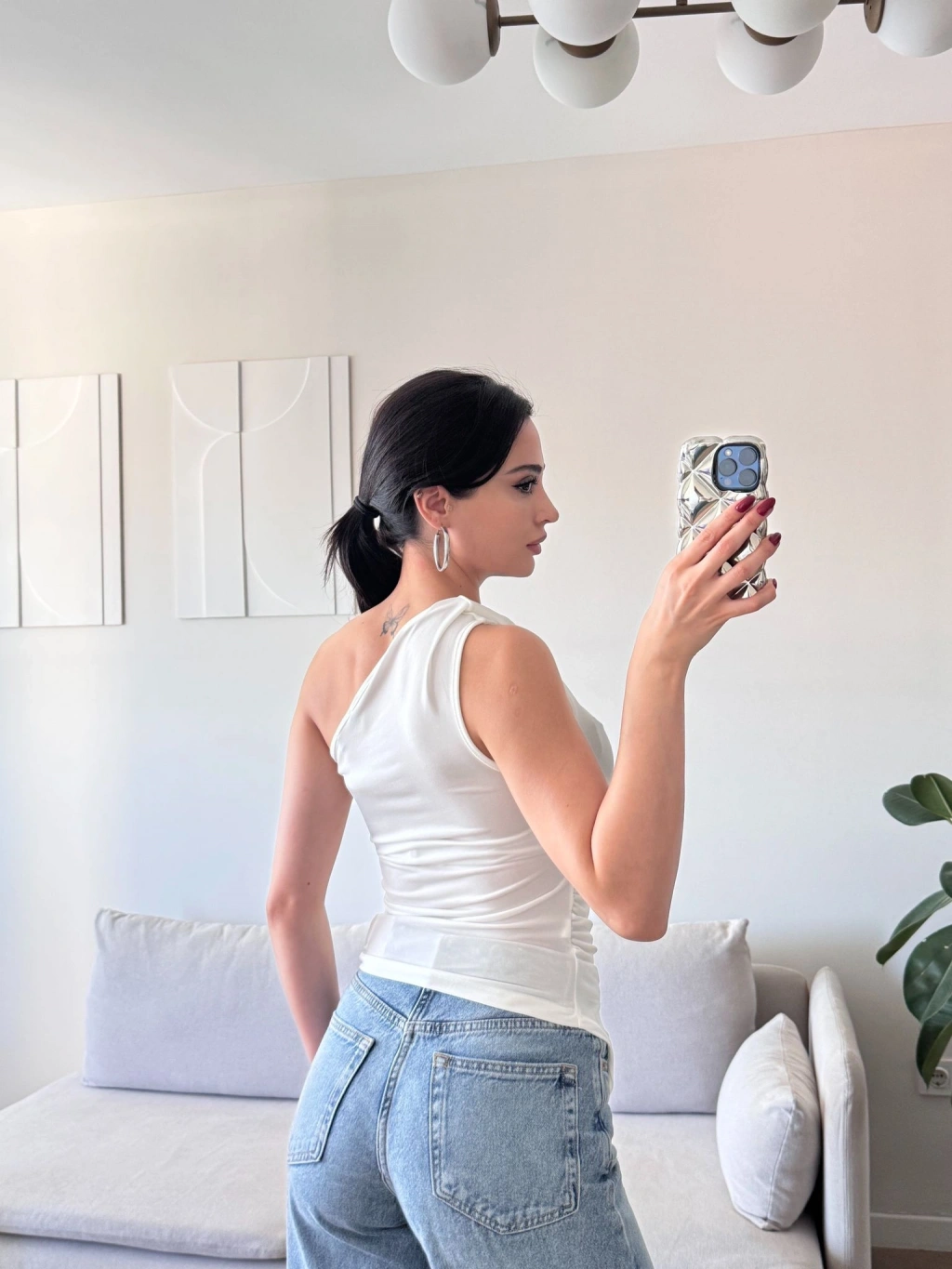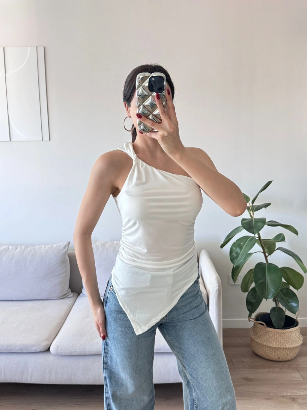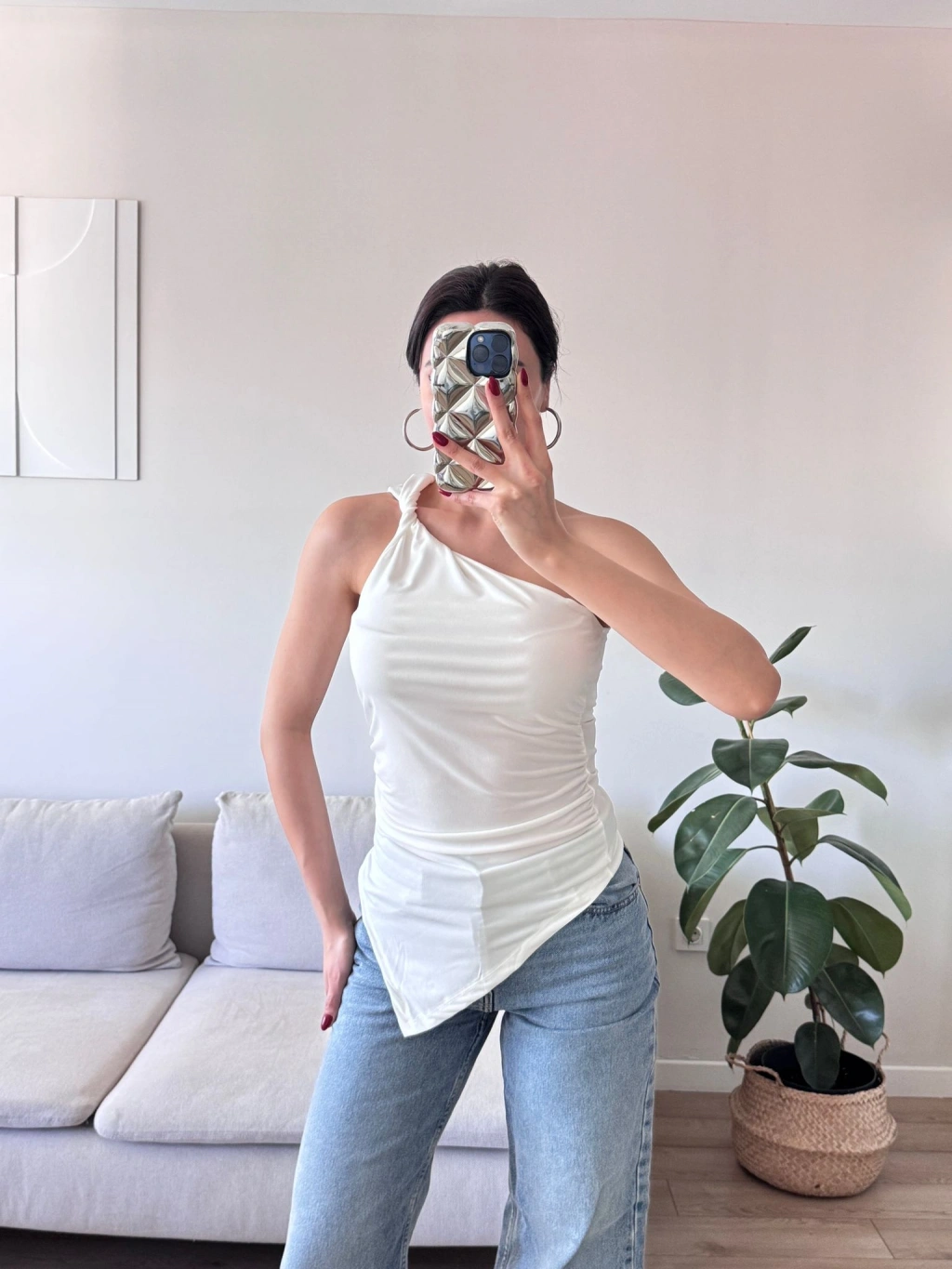 Omuz Dekolte Asimetrik Bluz - BEYAZ