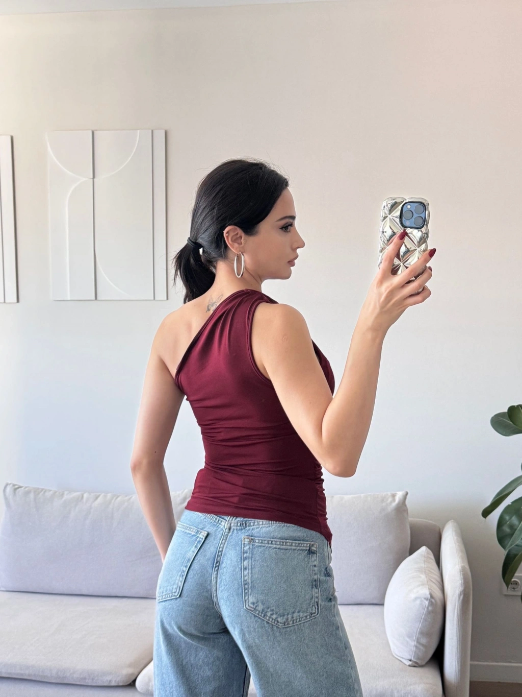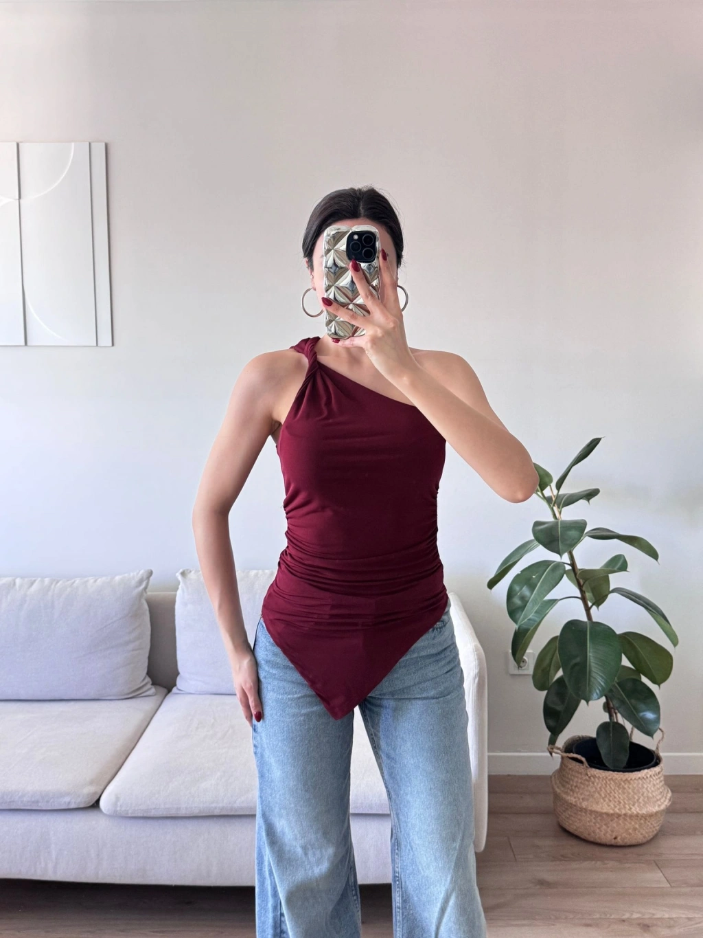 Omuz Dekolte Asimetrik Bluz - BORDO