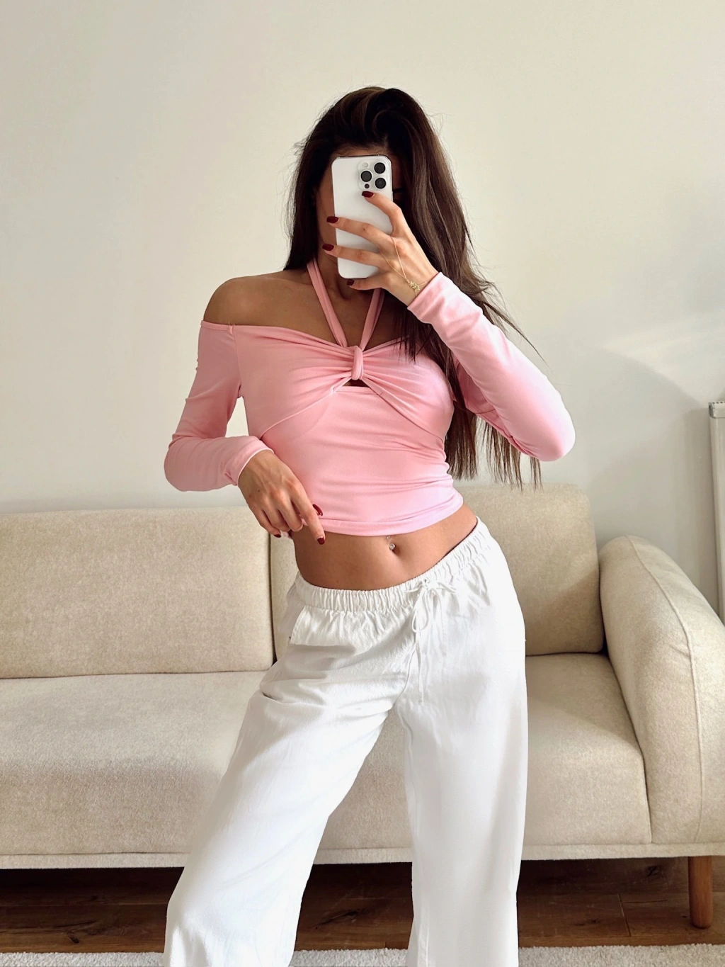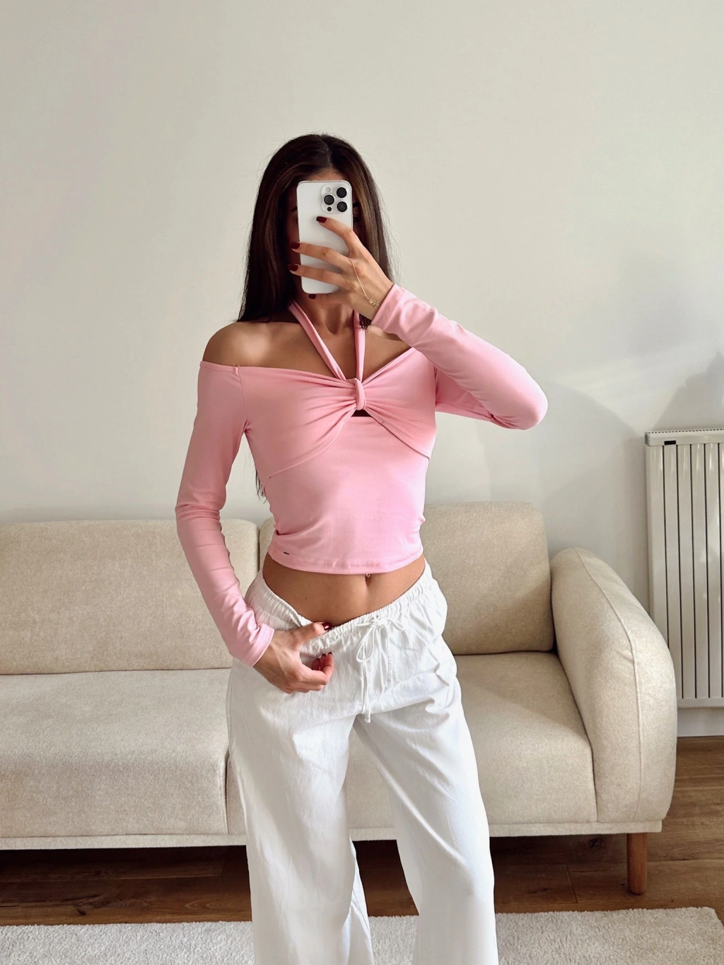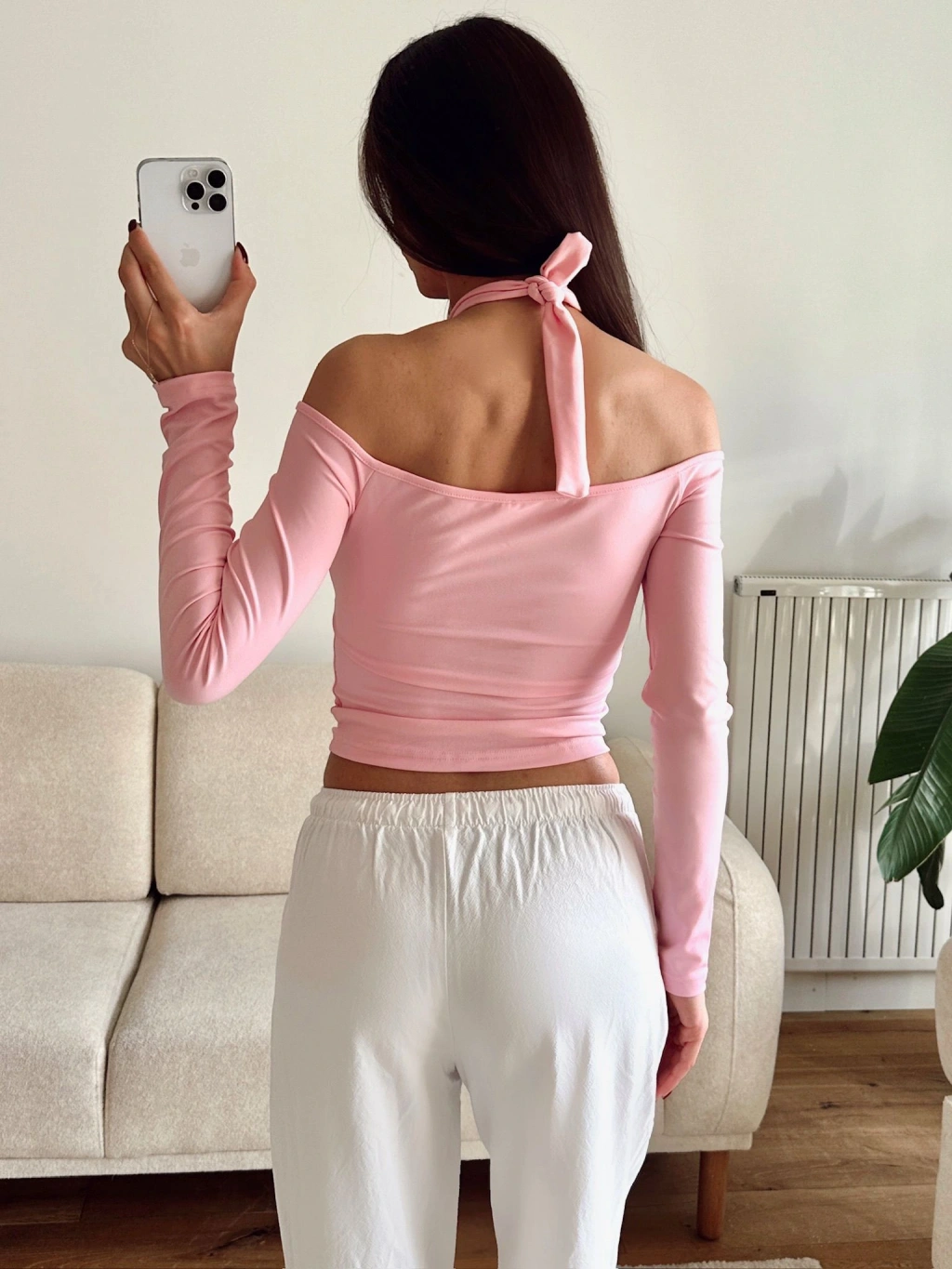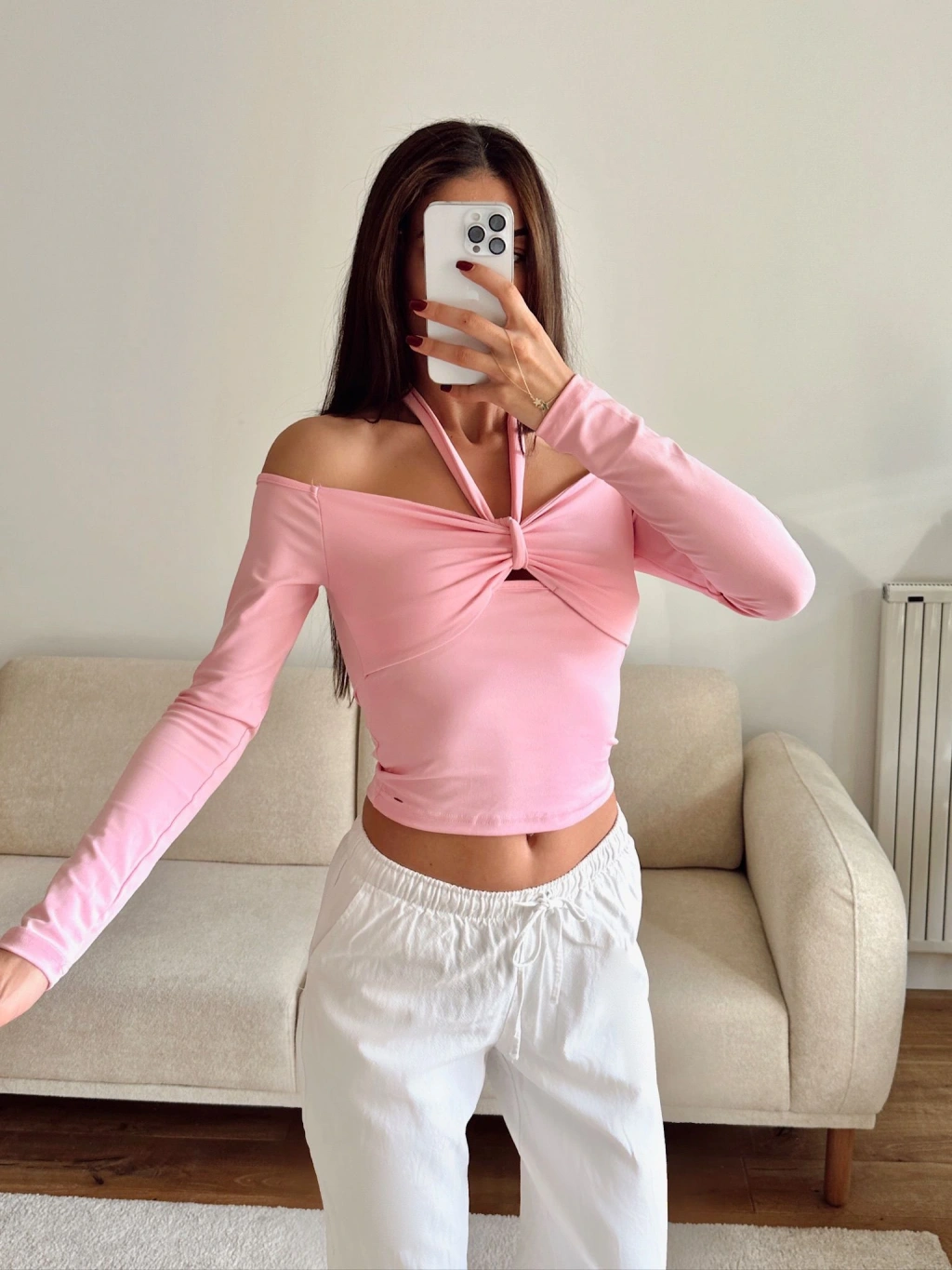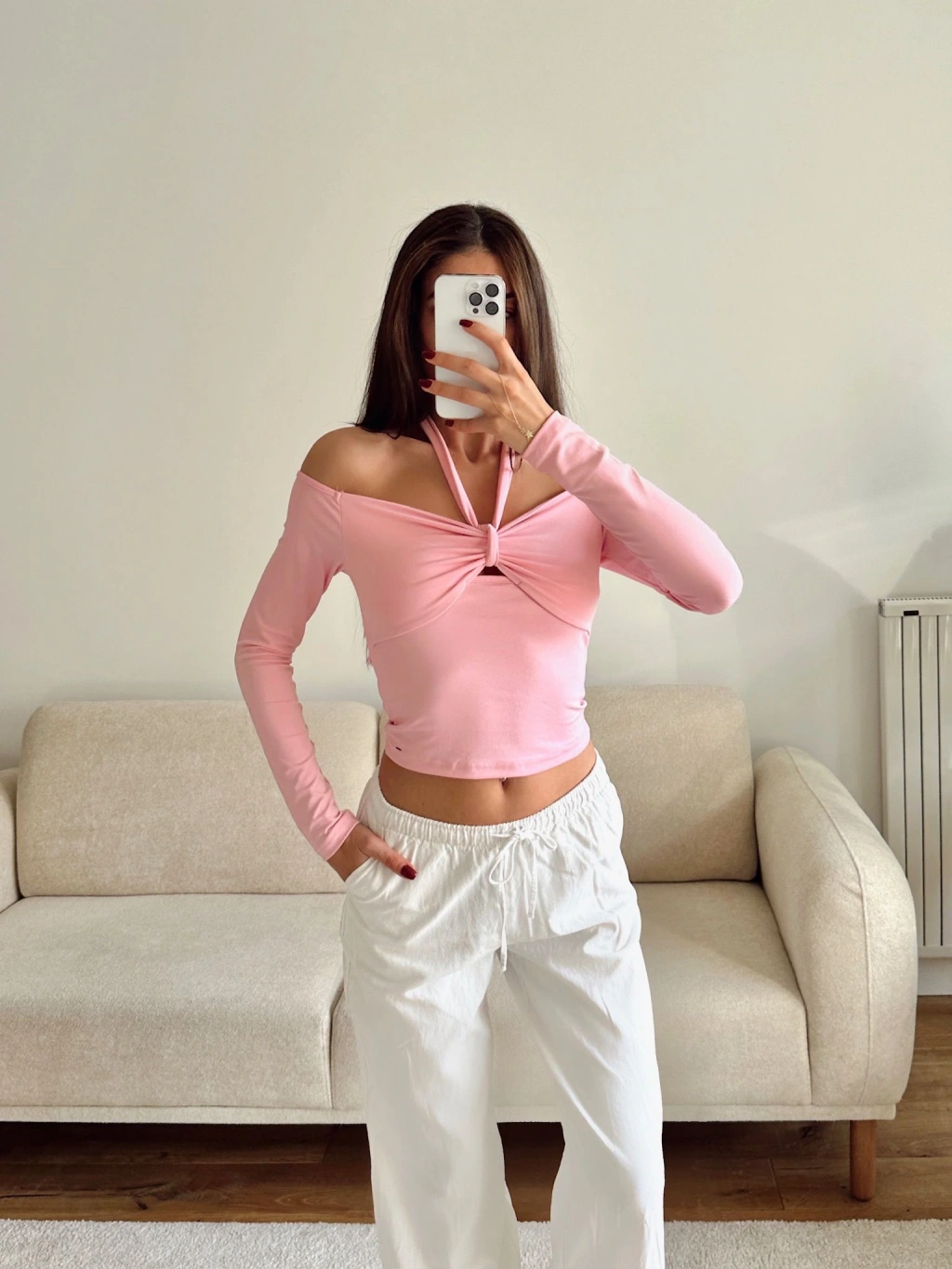 Ön Büzgü Boyun Bağlamalı Crop - PEMBE