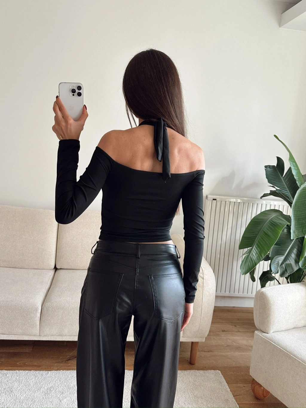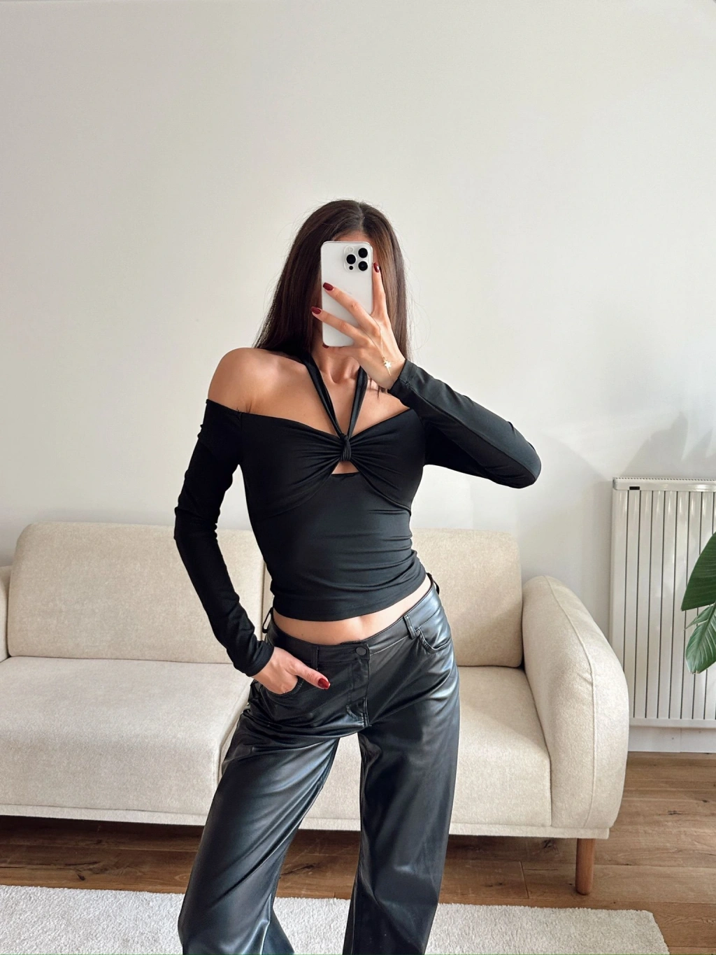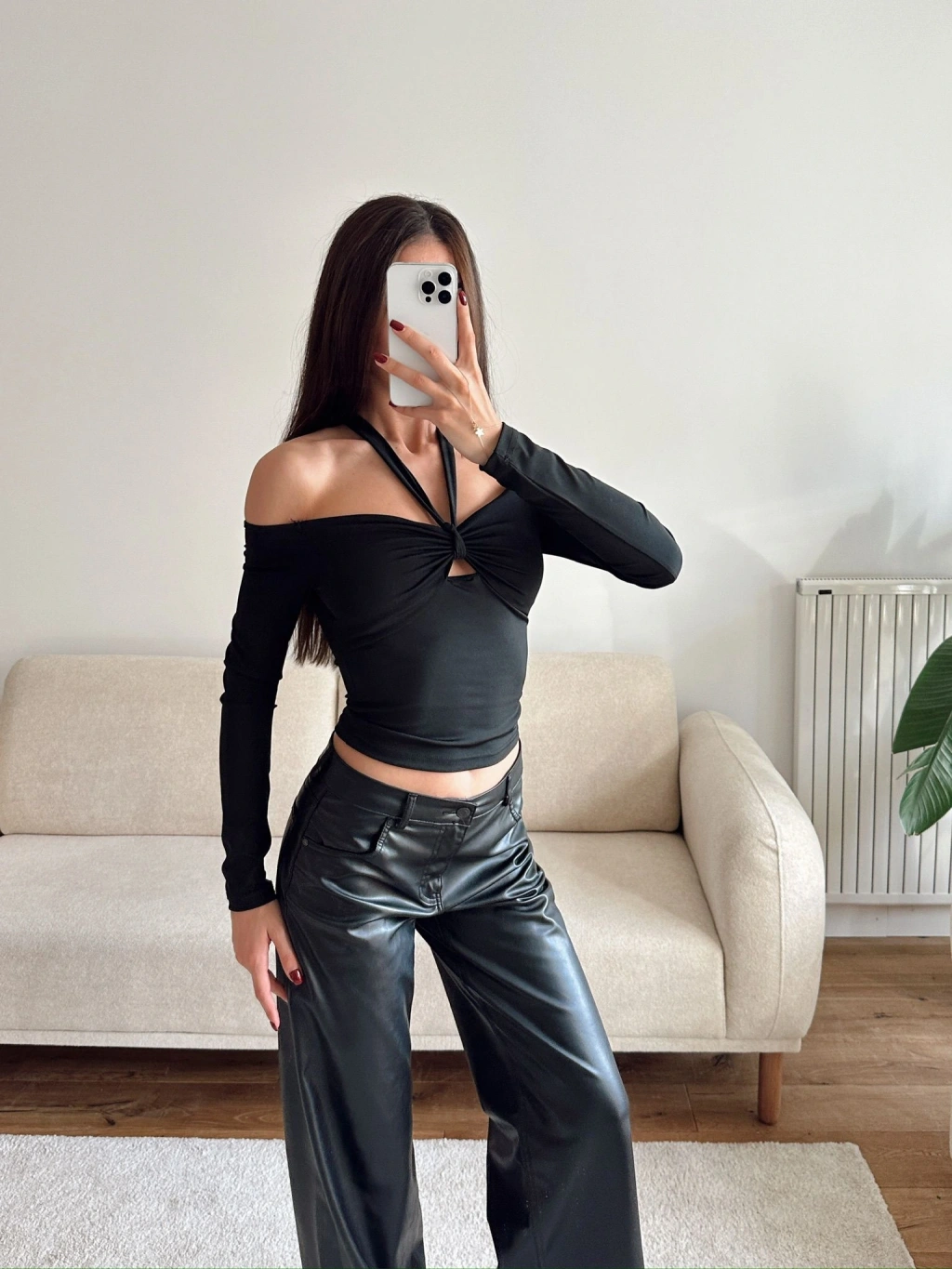 Ön Büzgü Boyun Bağlamalı Crop - SİYAH