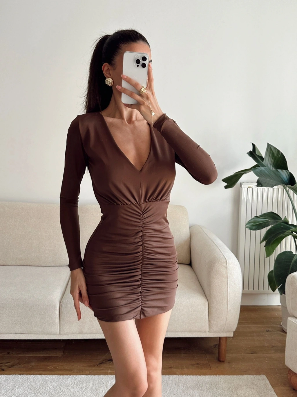 Ön Büzgülü V Yaka Elbise - KAHVE