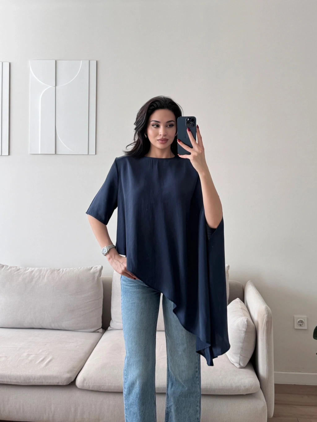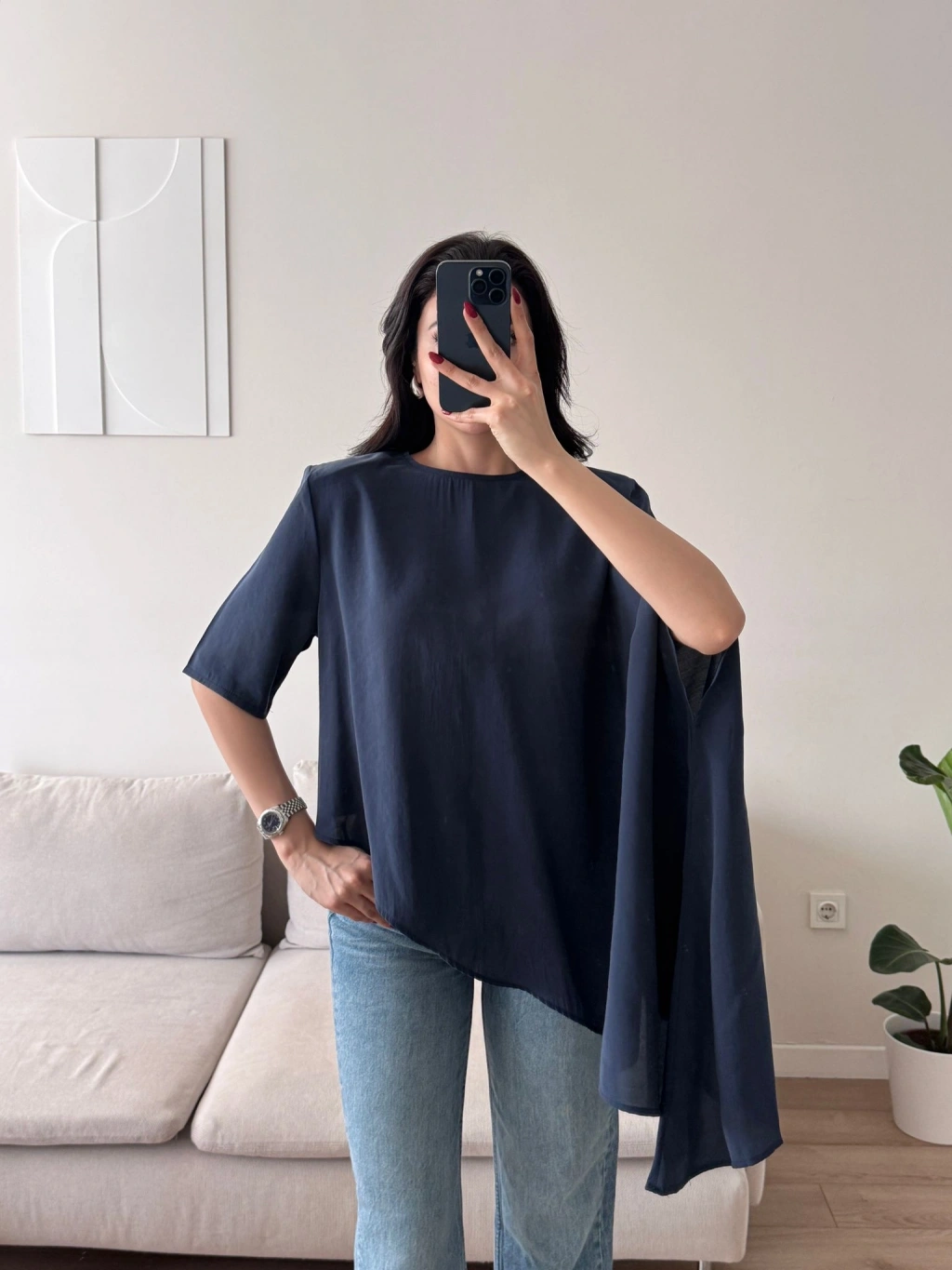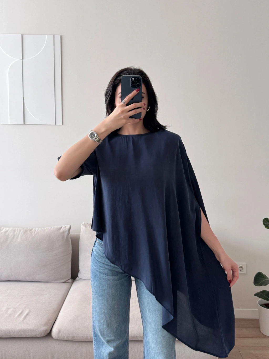 Oversize Asimetrik Yazlık Panço Bluz- LACİVERT