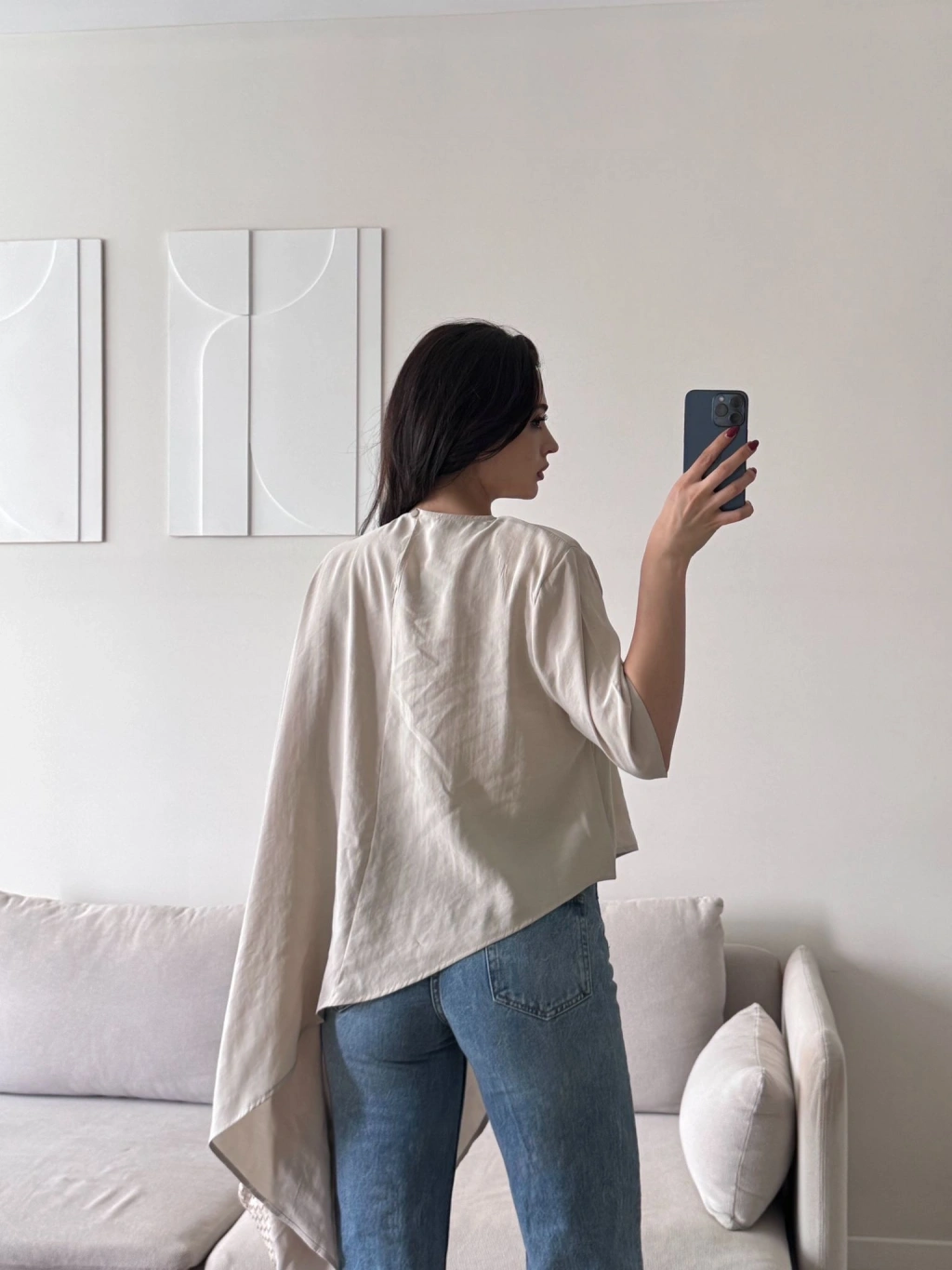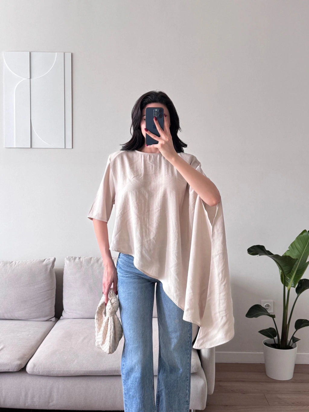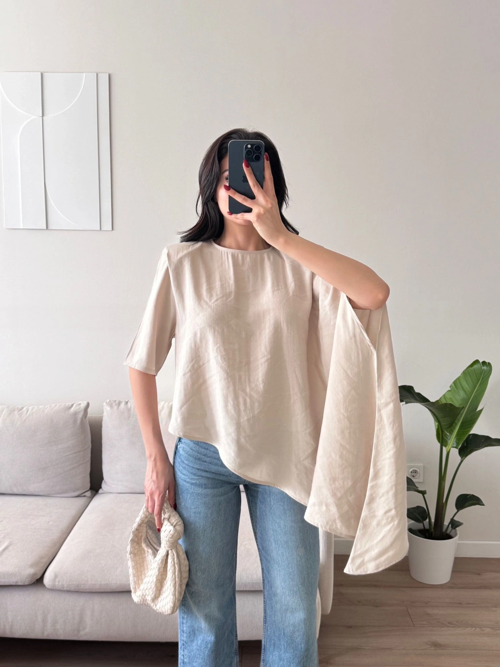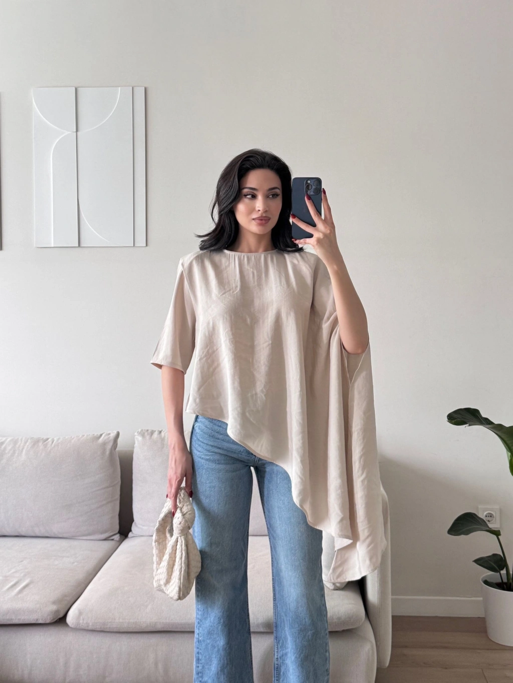 Oversize Asimetrik Yazlık Panço Bluz - BEJ