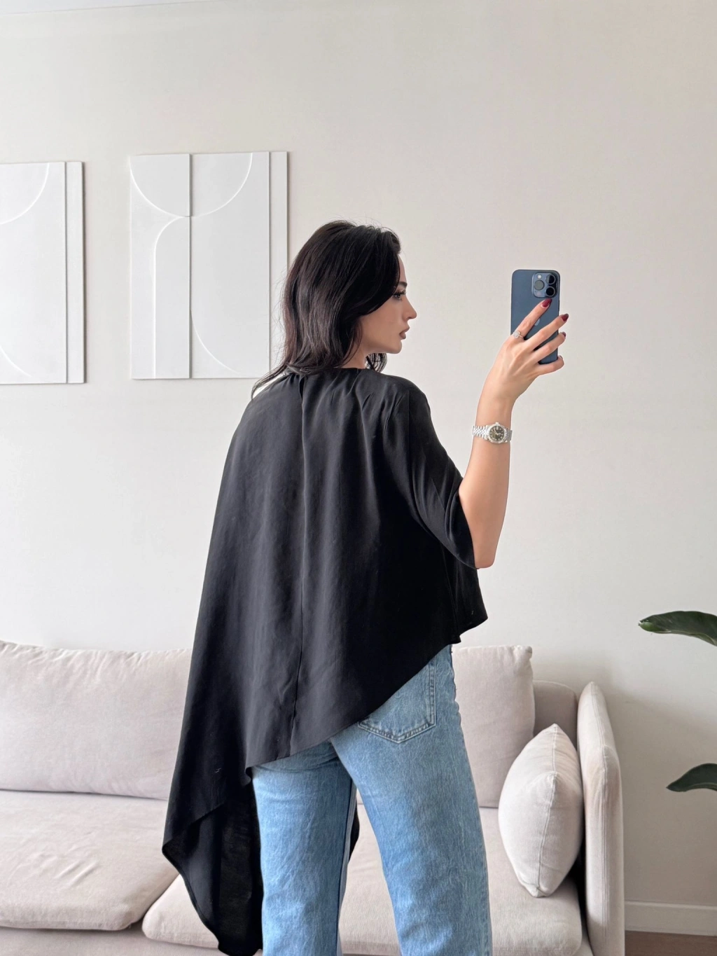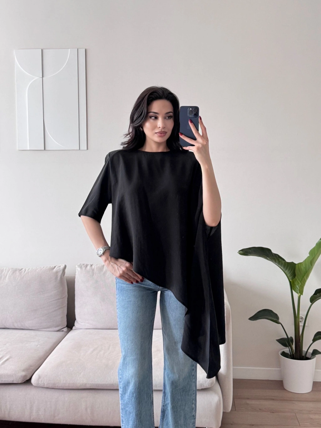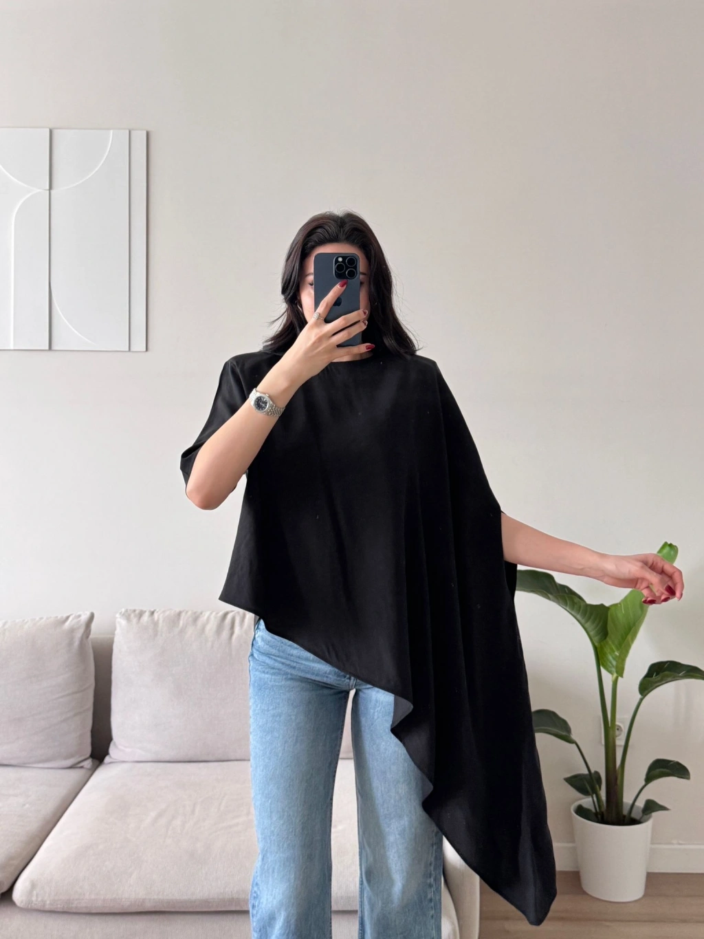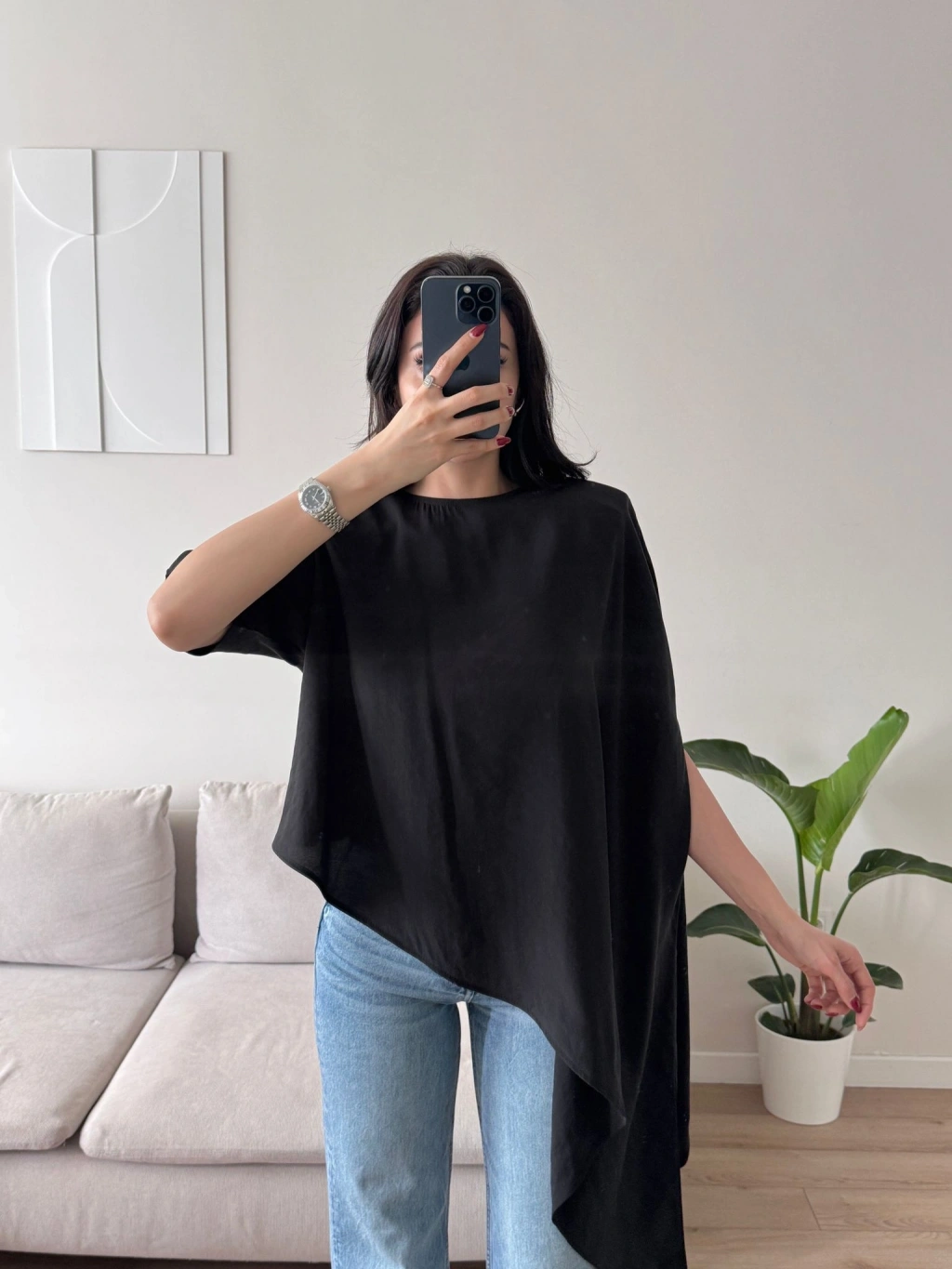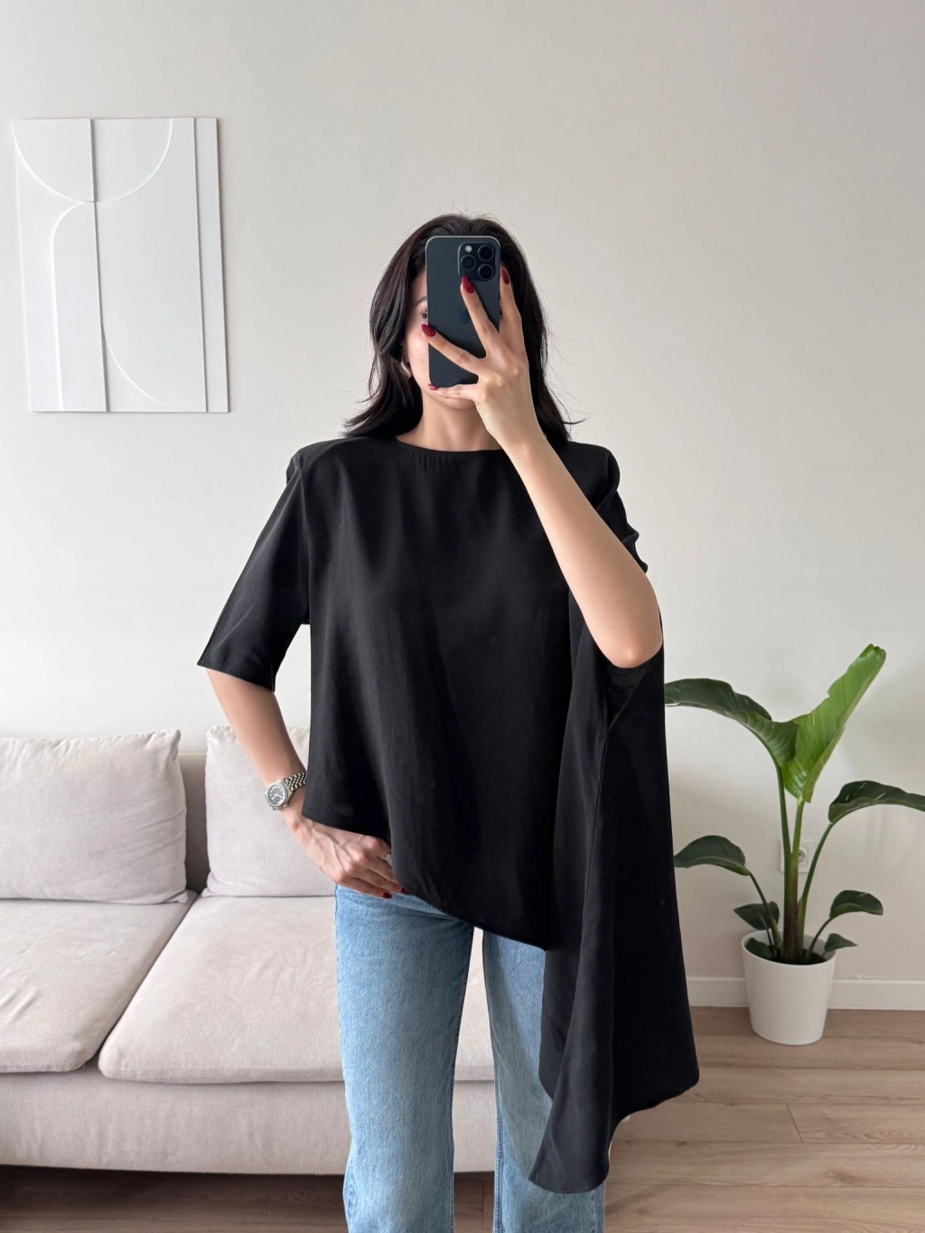 Oversize Asimetrik Yazlık Panço Bluz - SİYAH