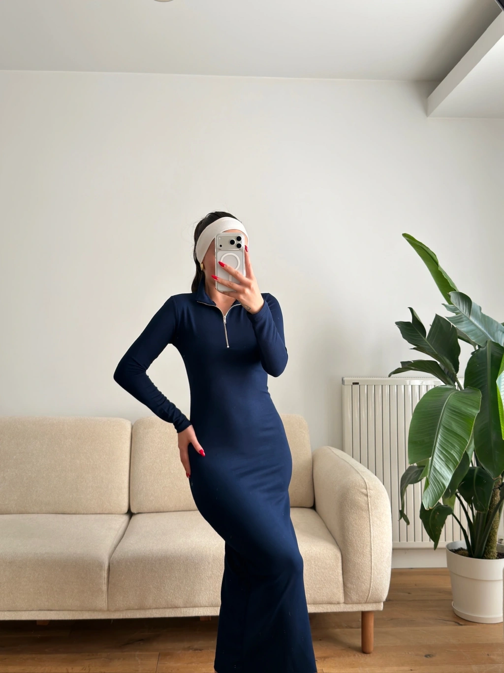 Oys Kumaş Fermuar Detay Elbise - LACİVERT