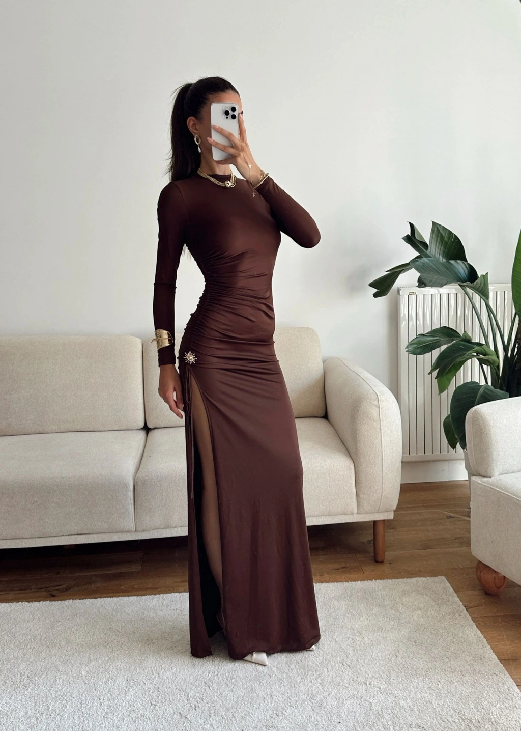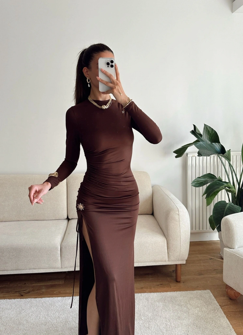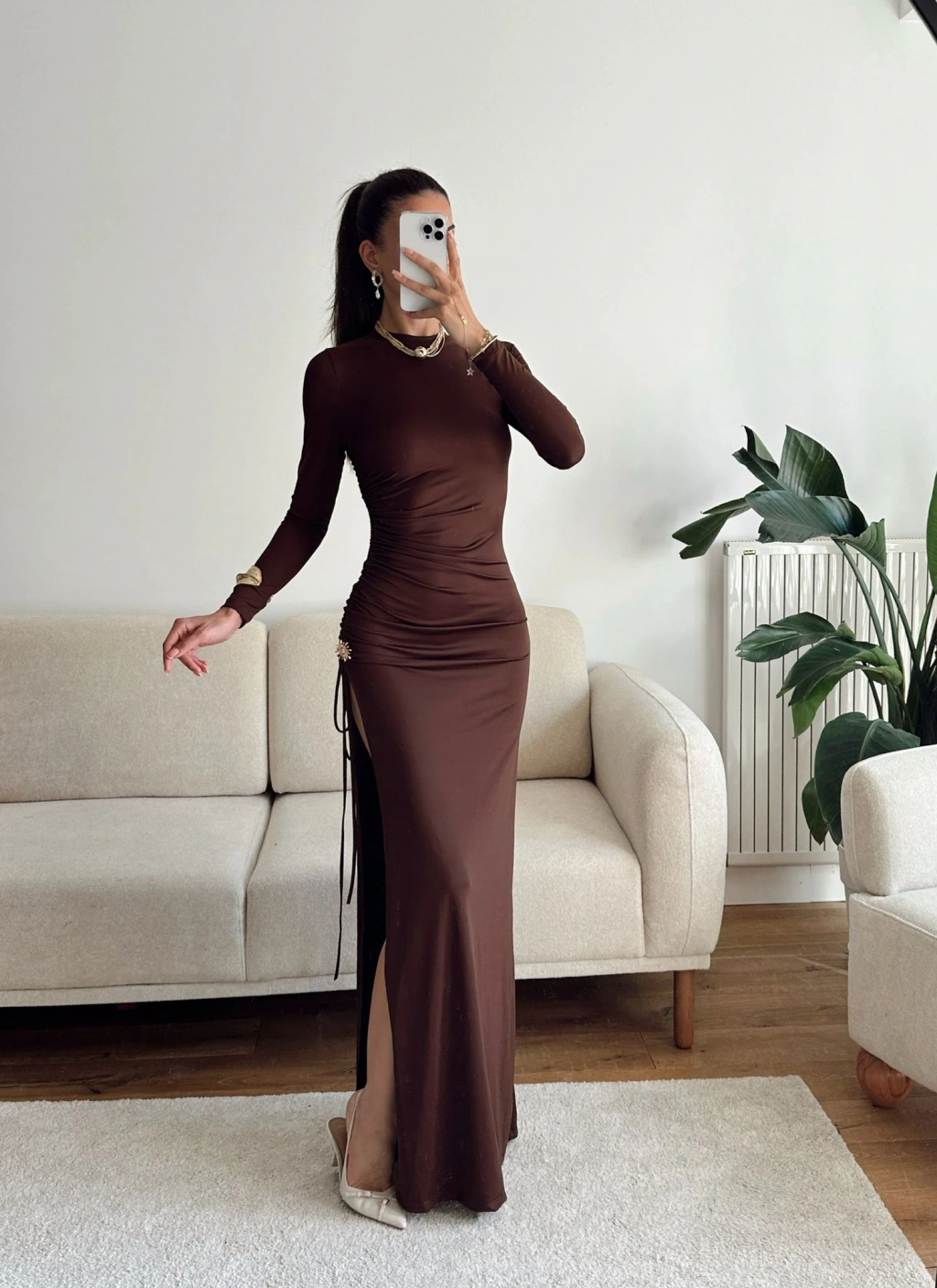 Yan Büzgü Derin Yırtmaç Elbise - KAHVE
