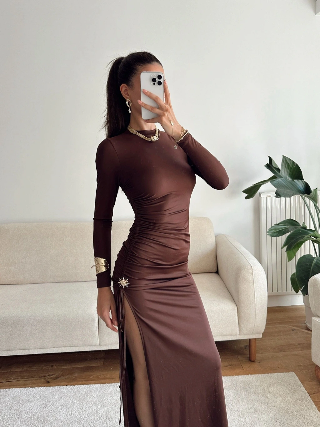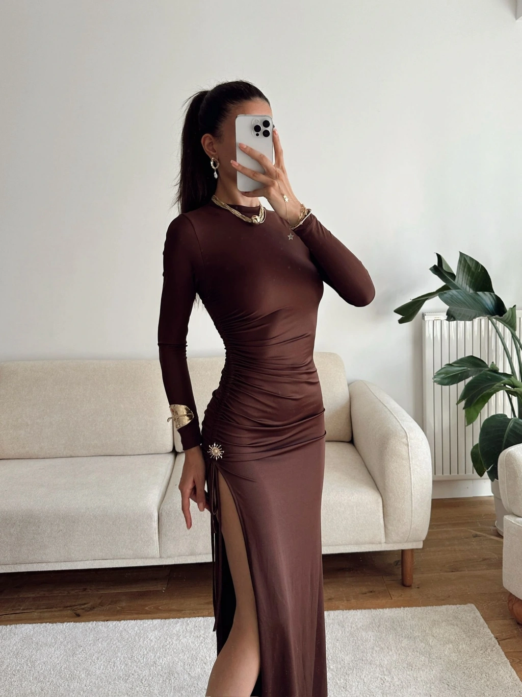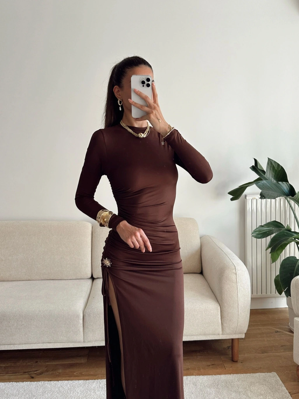 Yan Büzgü Derin Yırtmaç Elbise - KAHVE