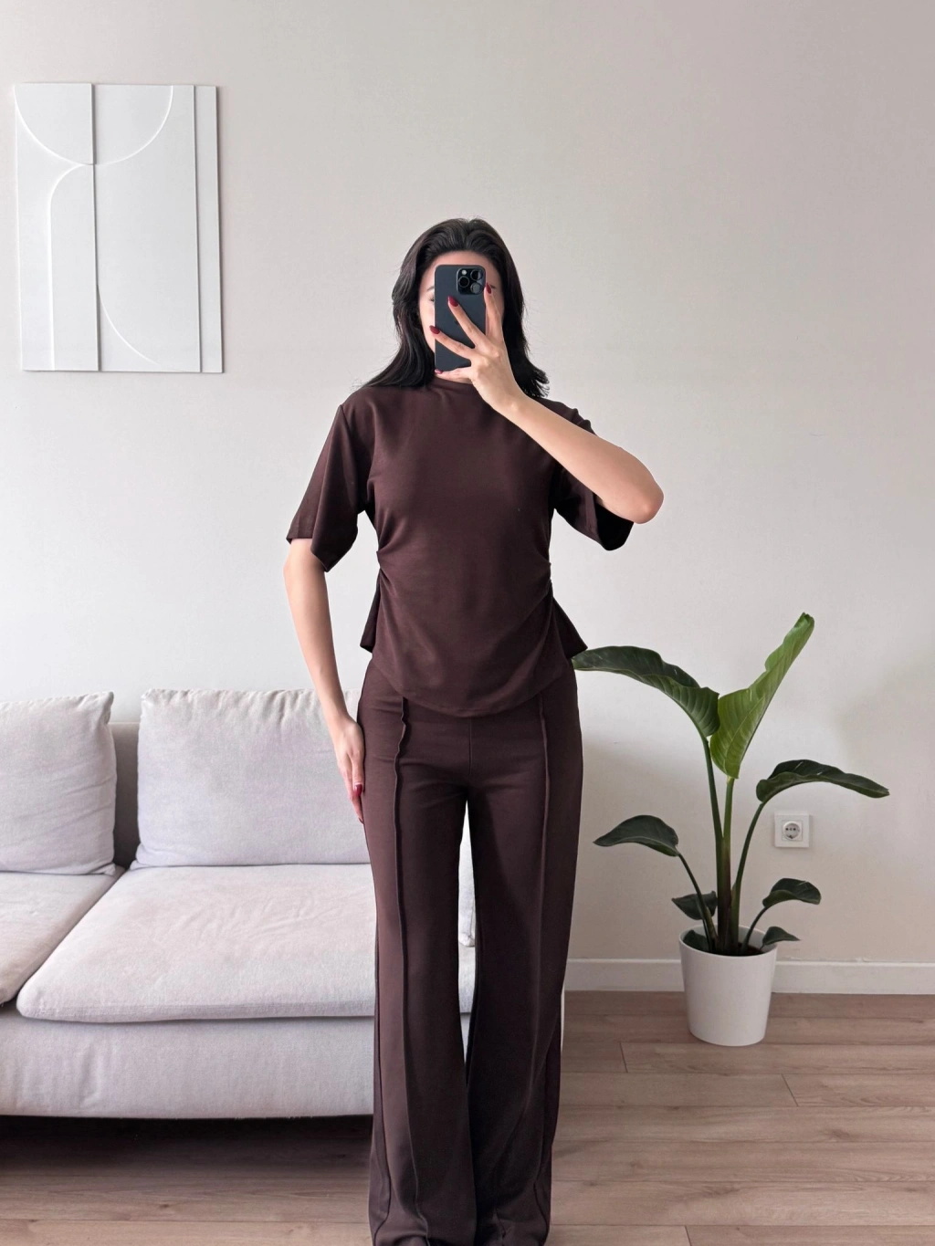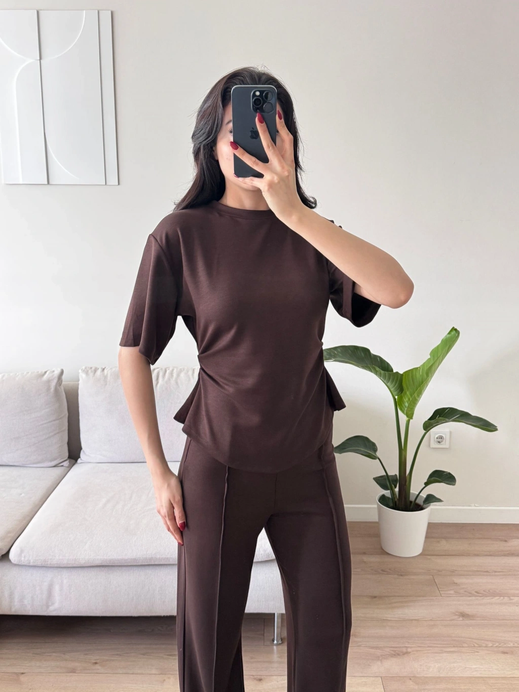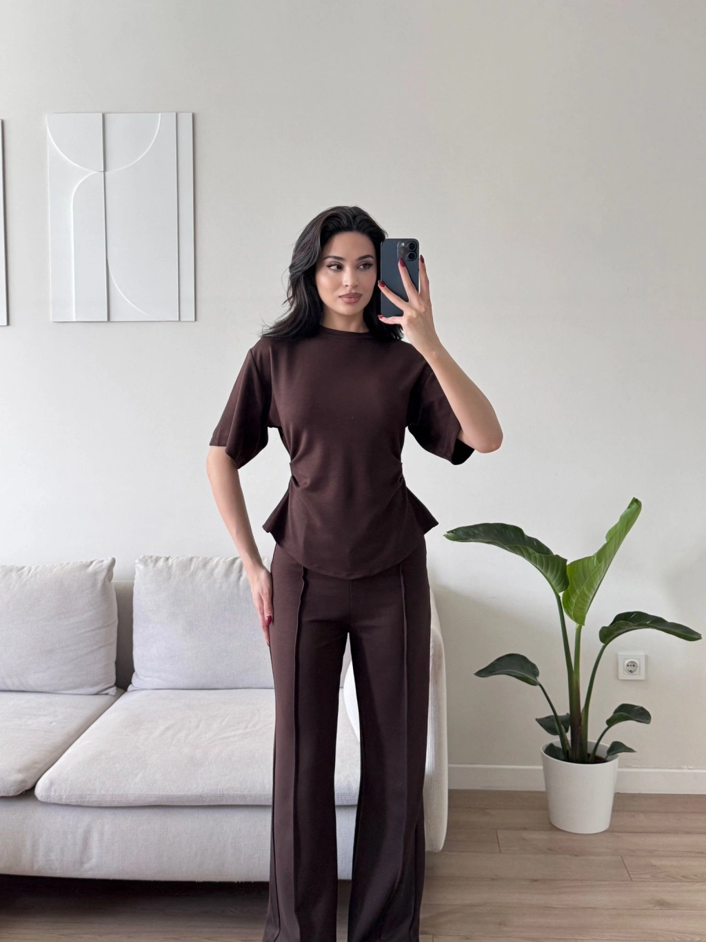 Peplum Kesim Üst Bol Paça Pantolon İkili Takım - KAHVE