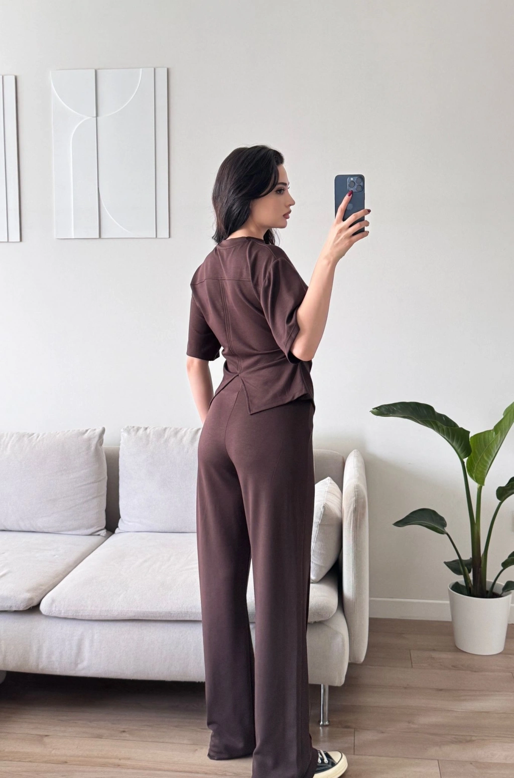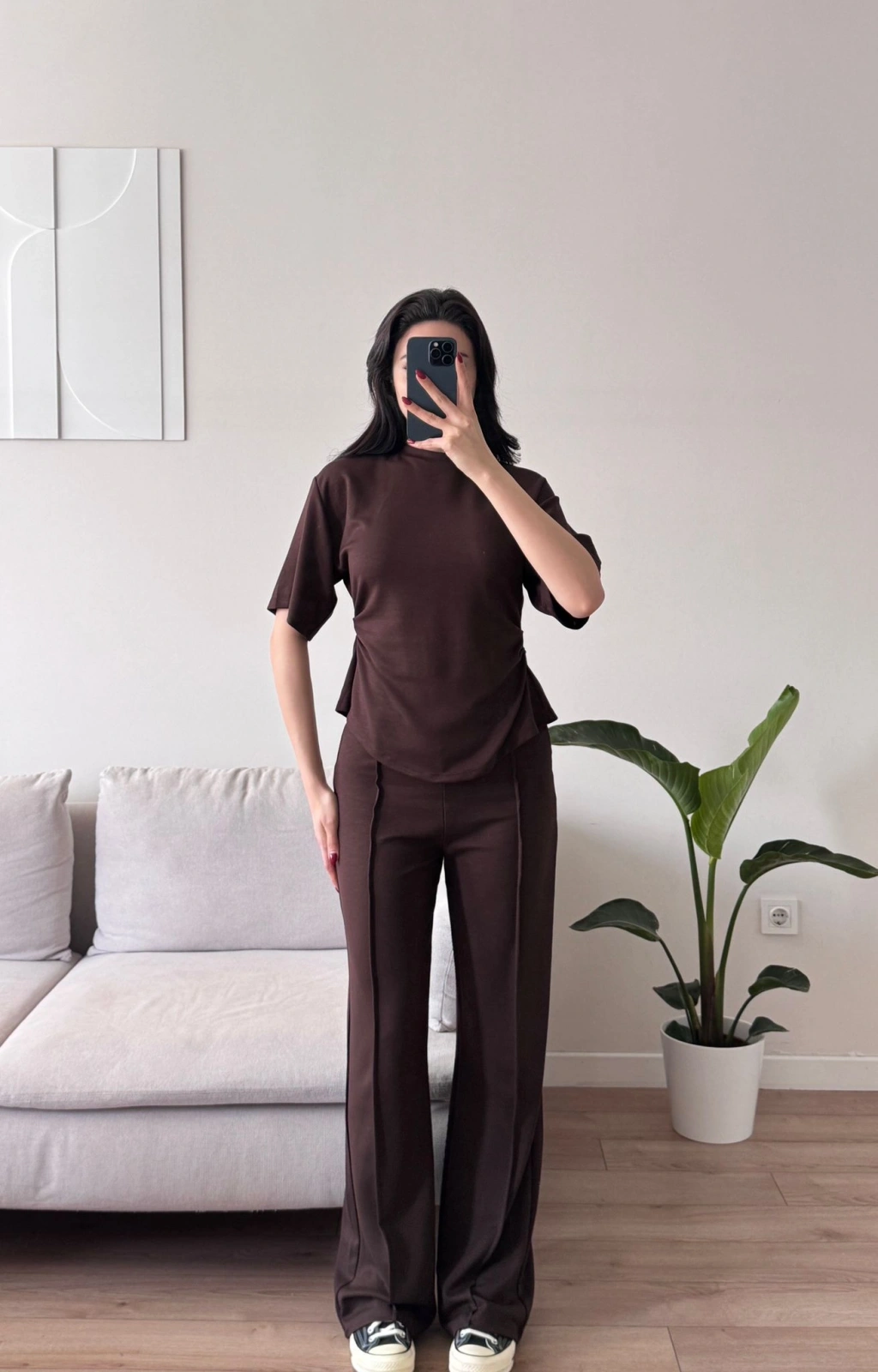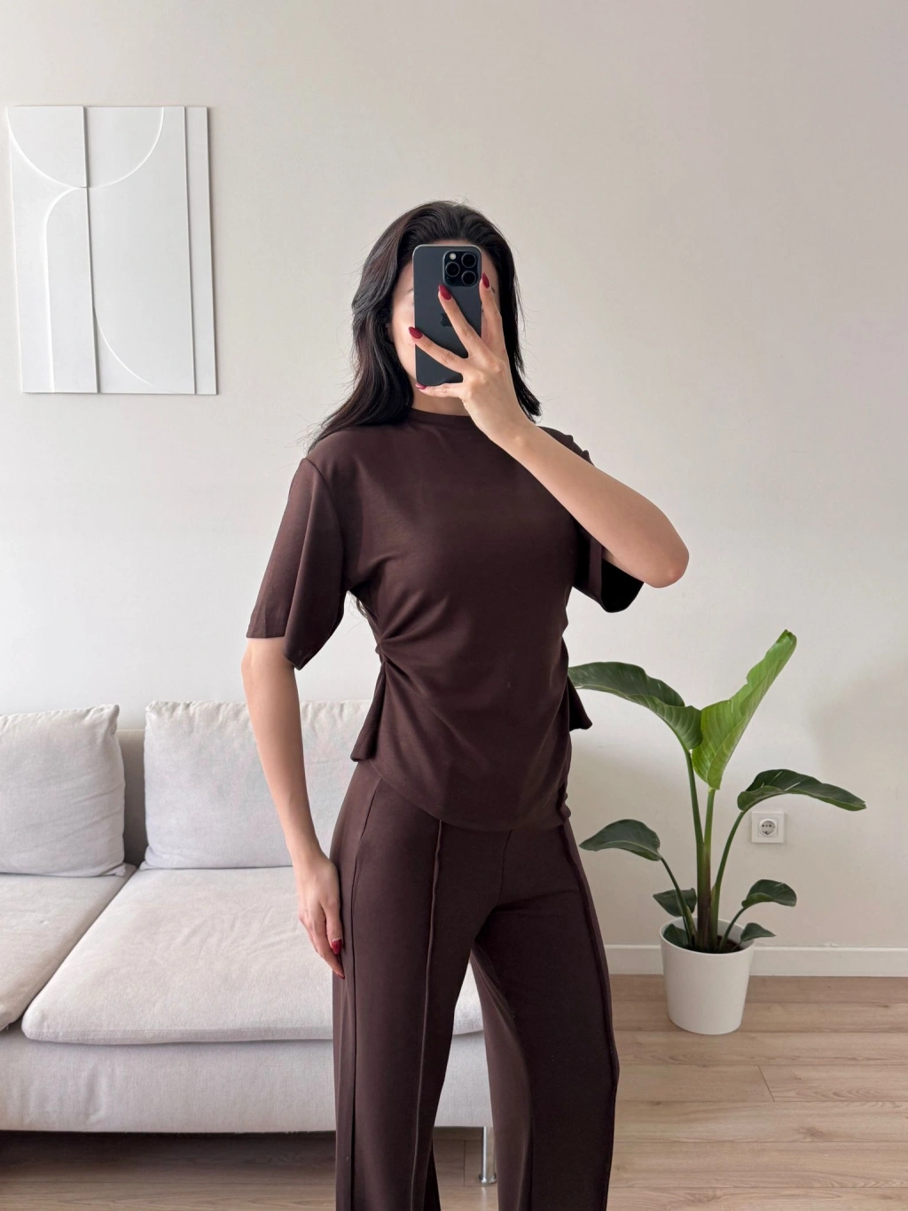 Peplum Kesim Üst Bol Paça Pantolon İkili Takım - KAHVE