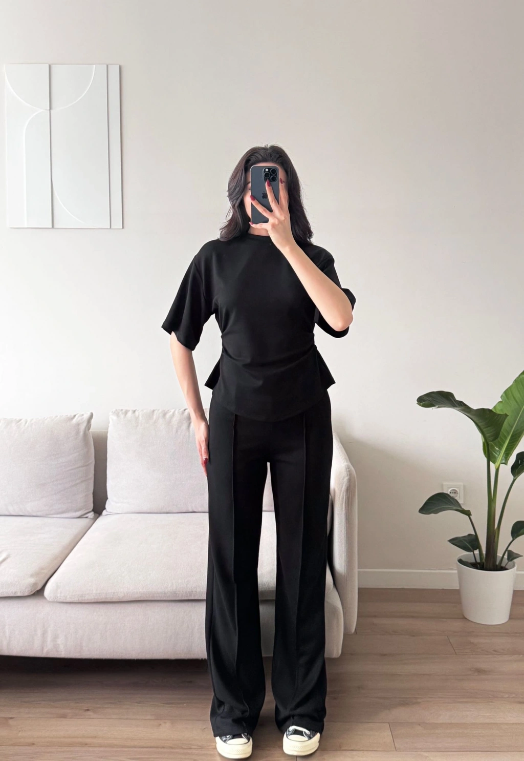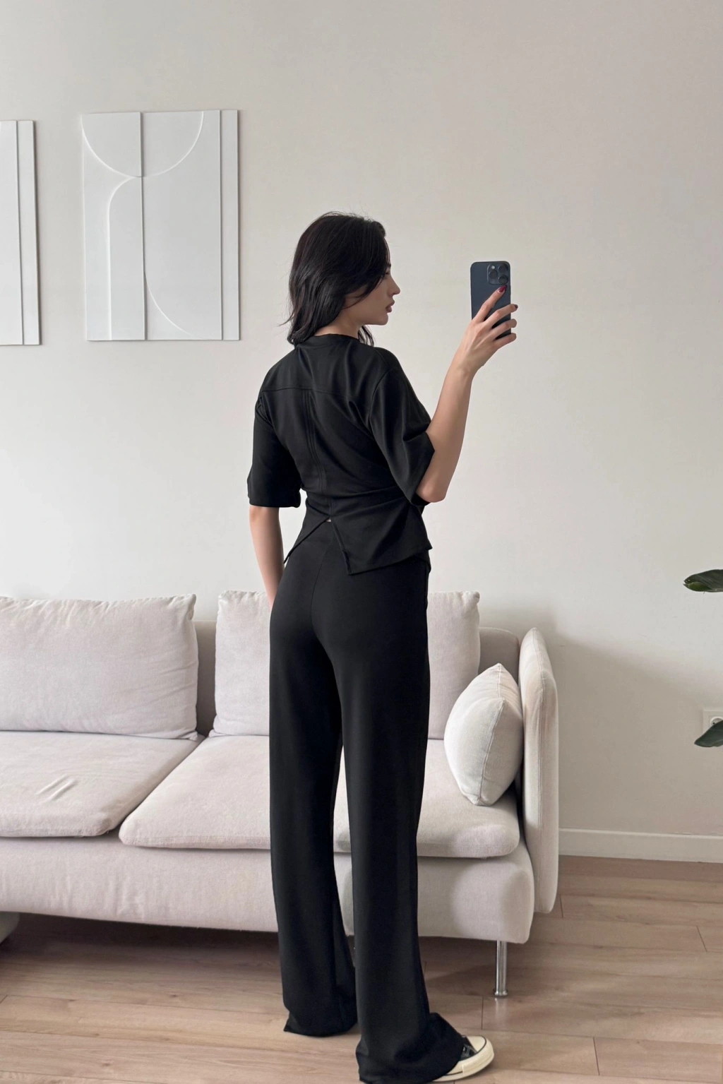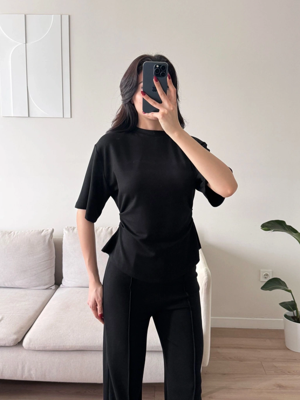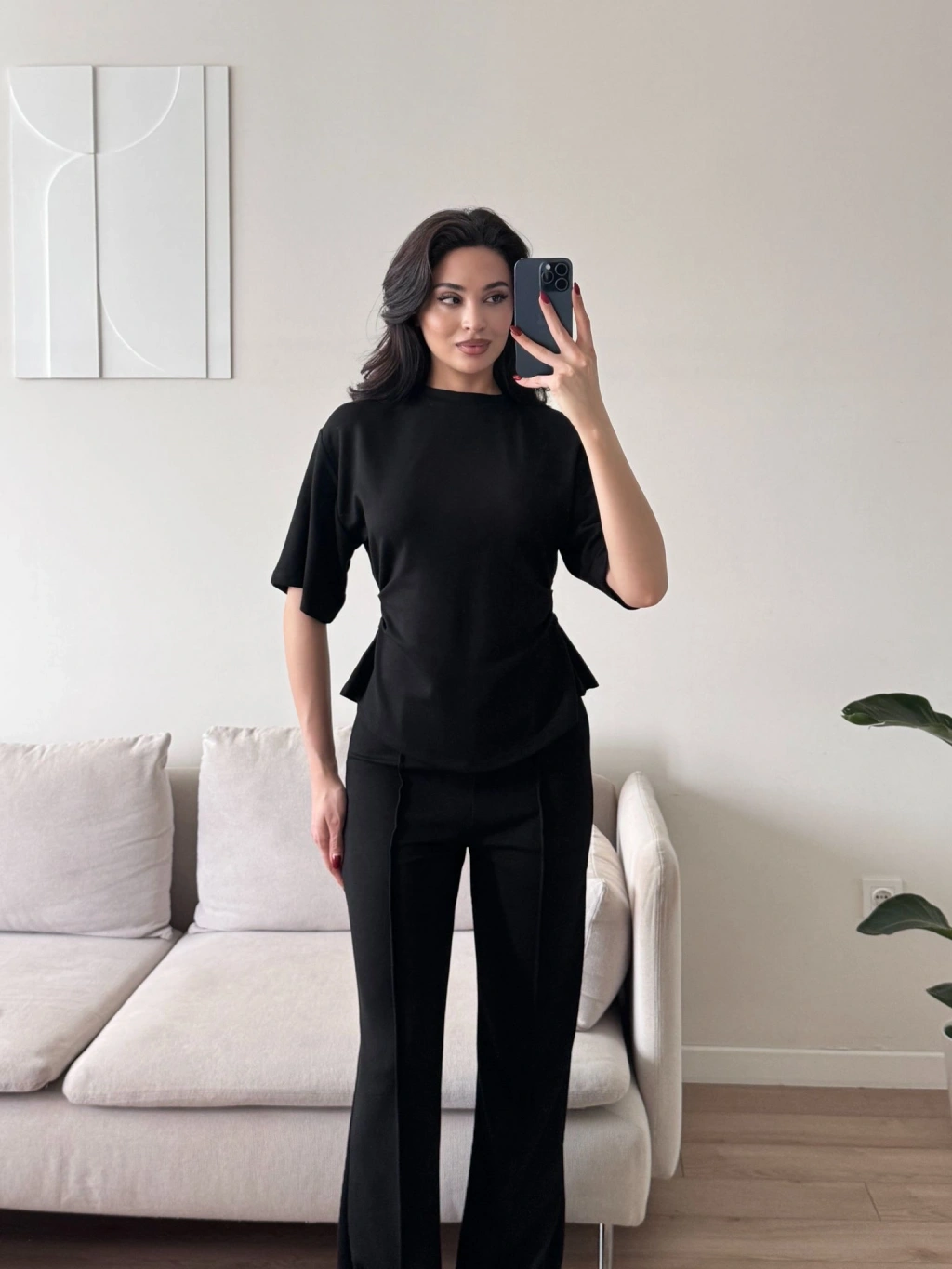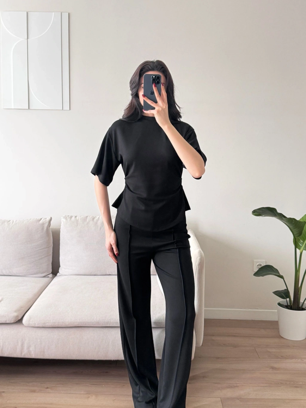 Peplum Kesim Üst Bol Paça Pantolon İkili Takım - SİYAH