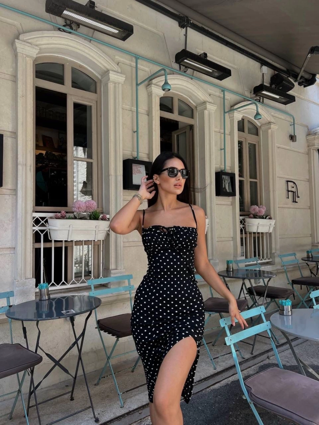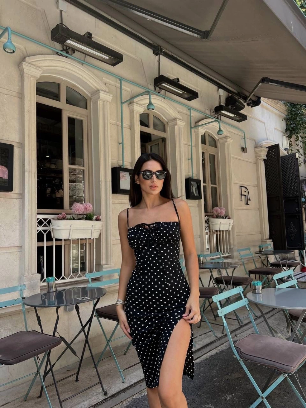 Puantiyeli Bürümcük Yırtmaçlı Elbise