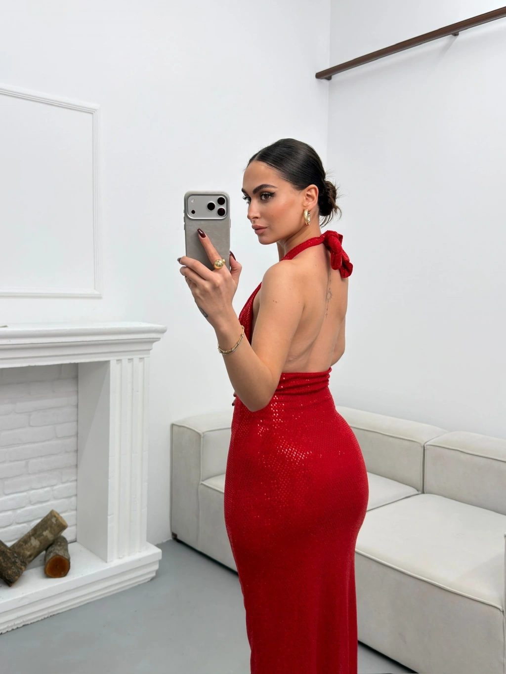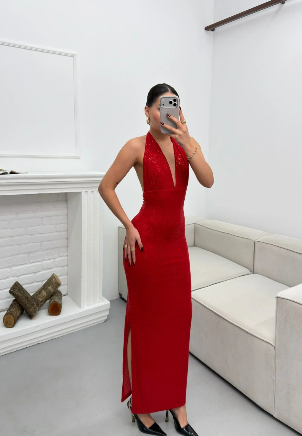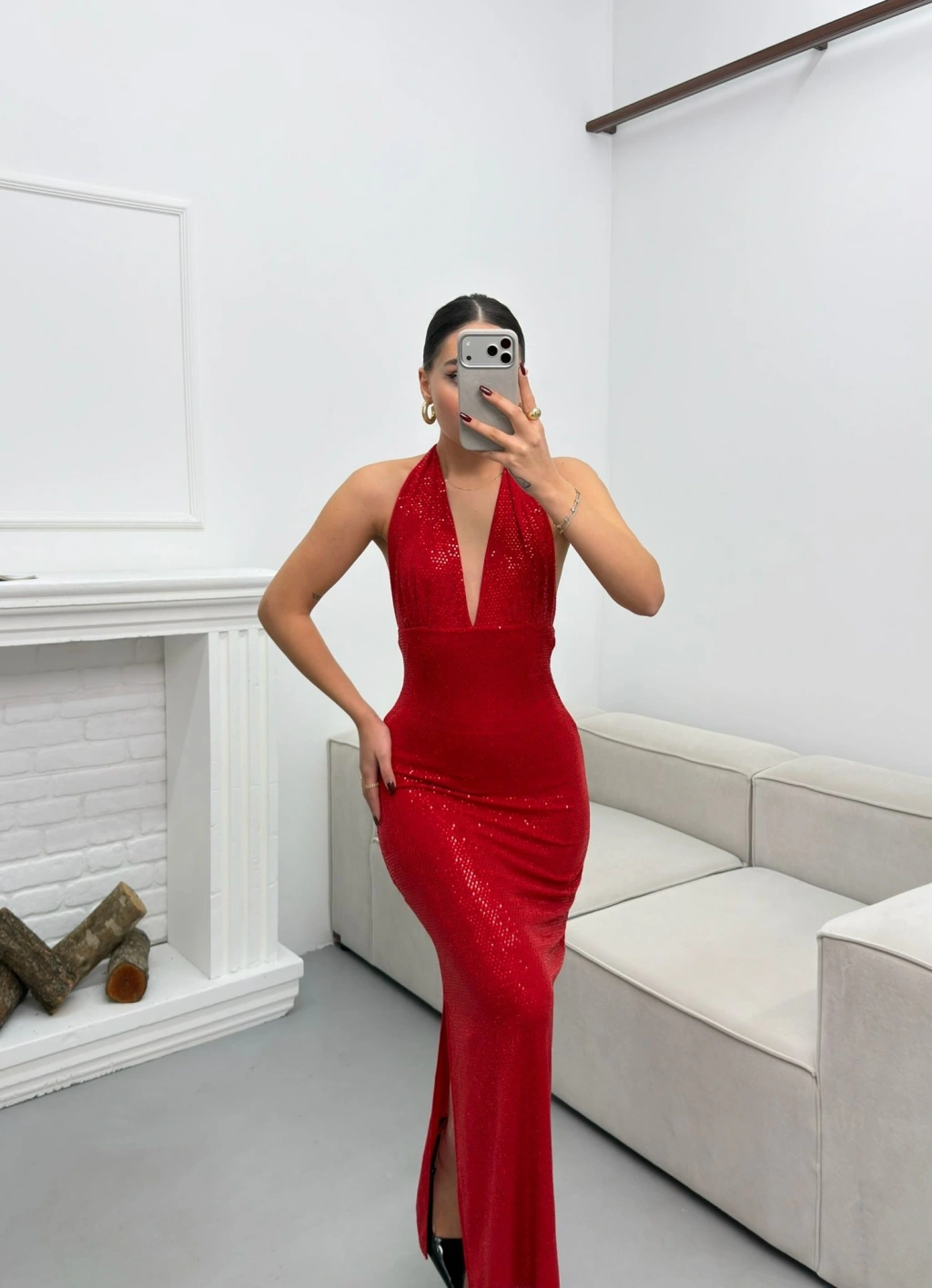 Pul Payetli Boyun Bağlamalı Elbise - KIRMIZI