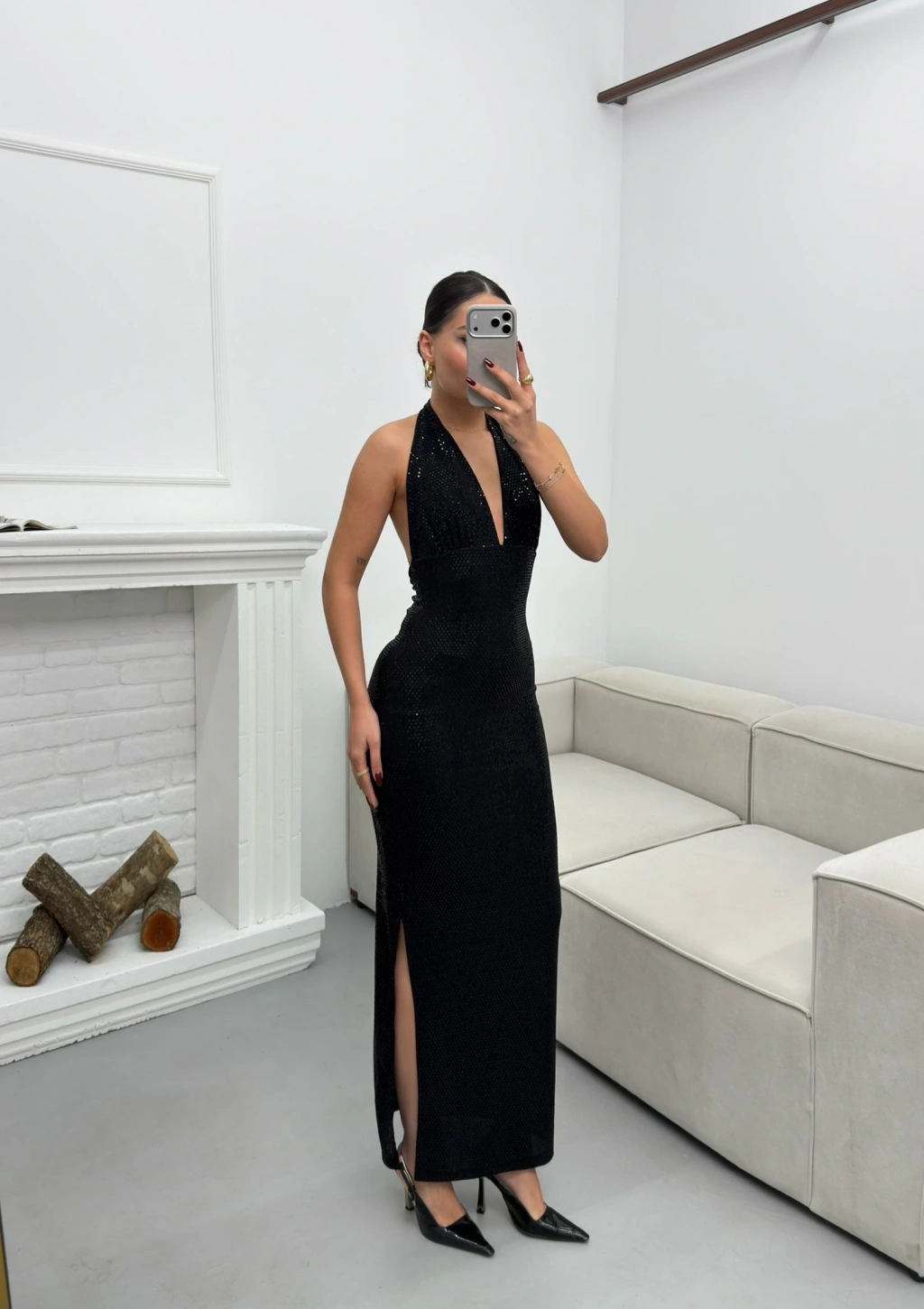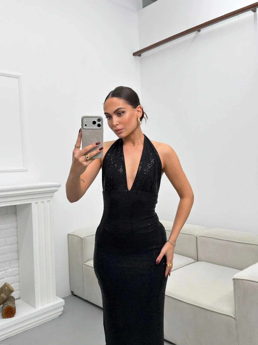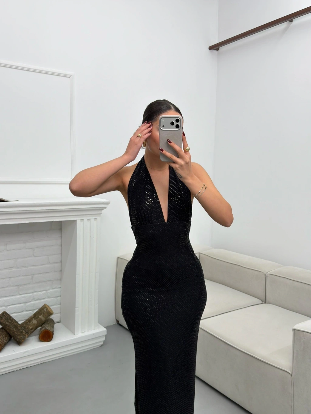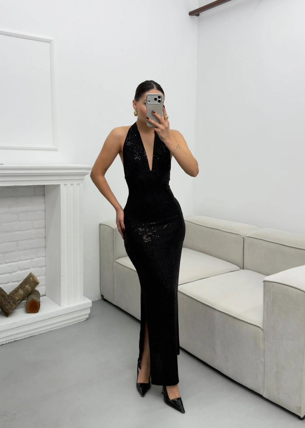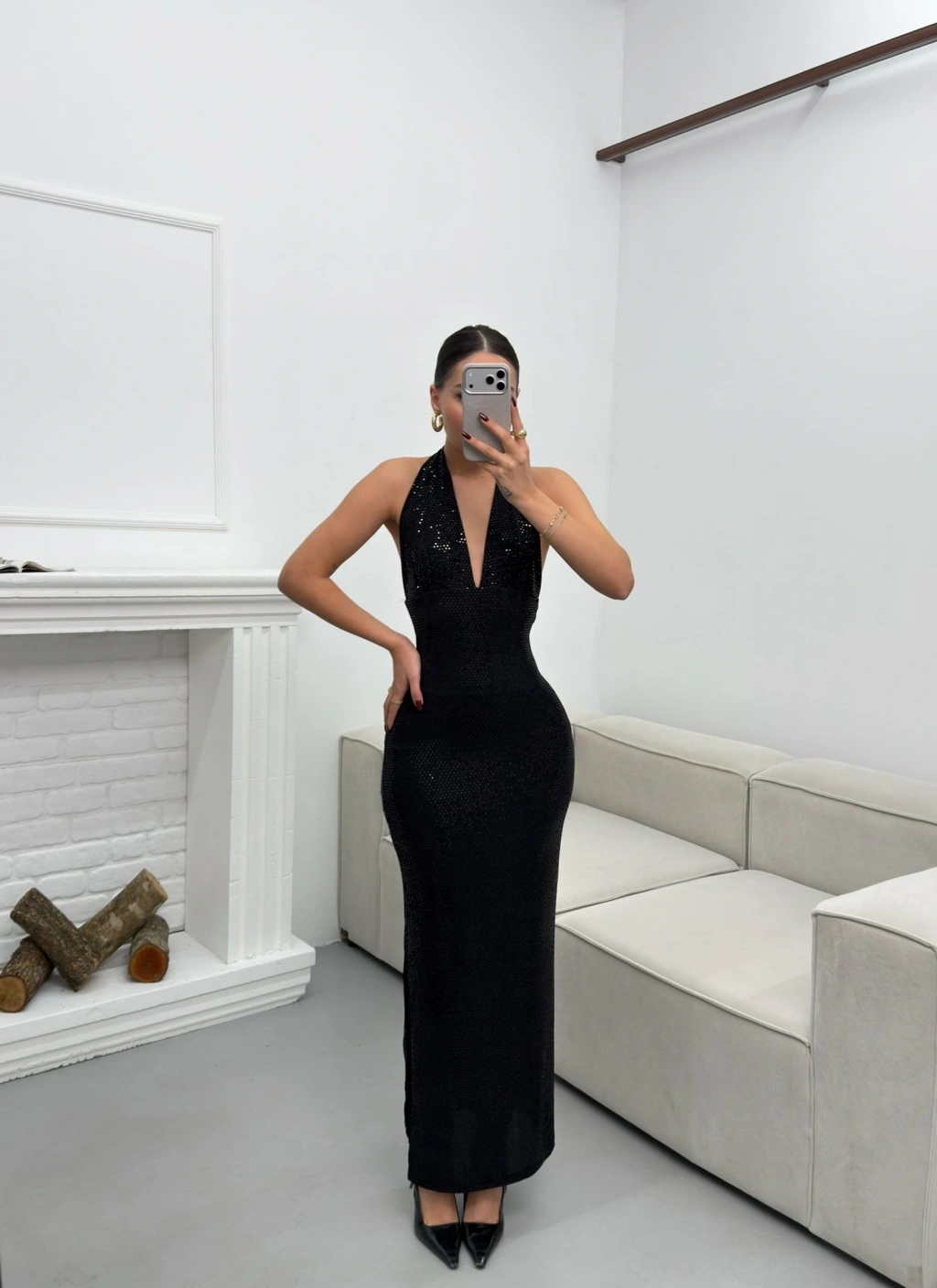Pul Payetli Boyun Bağlamalı Elbise - SİYAH