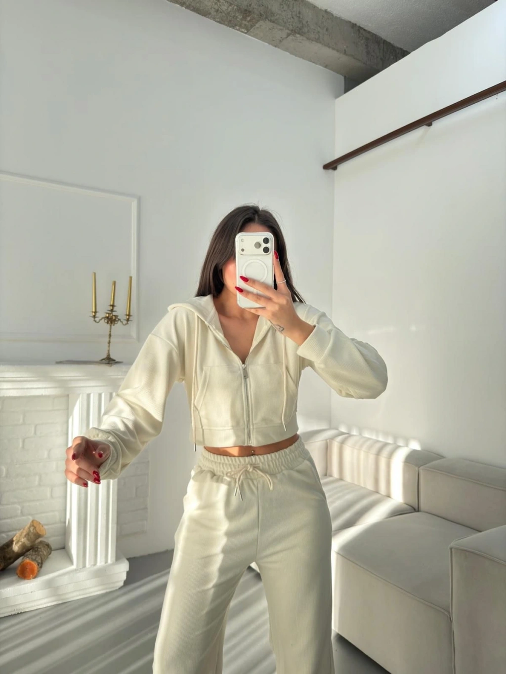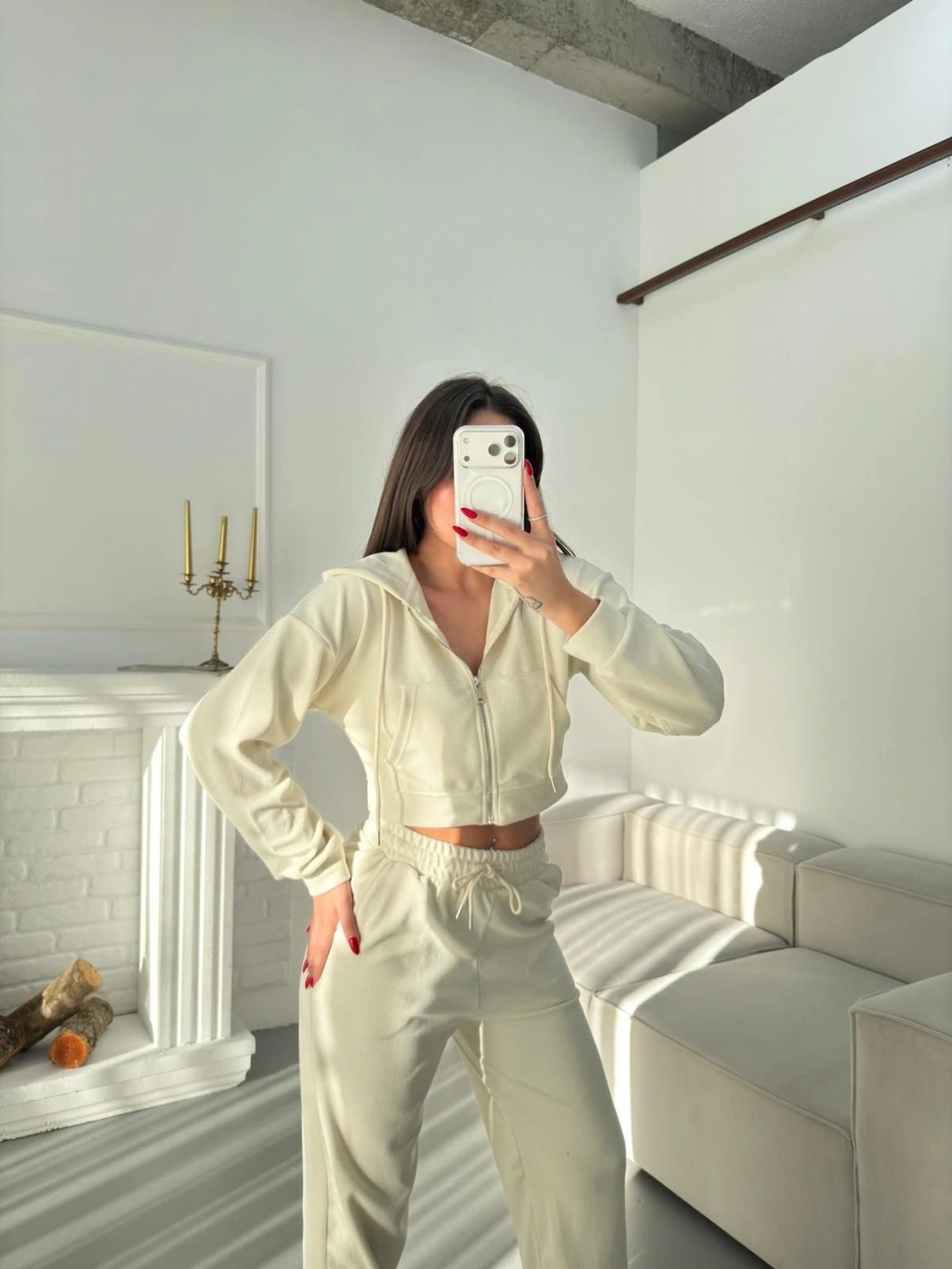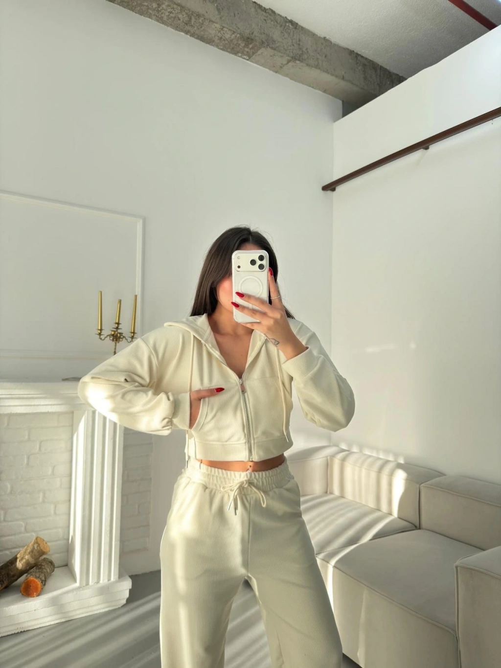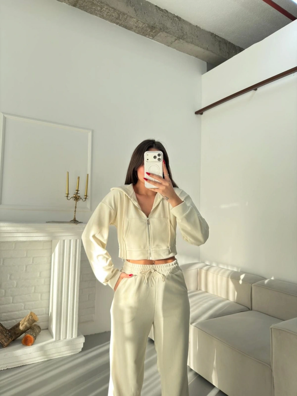 Selanik Crop Hırkalı Takım - EKRU