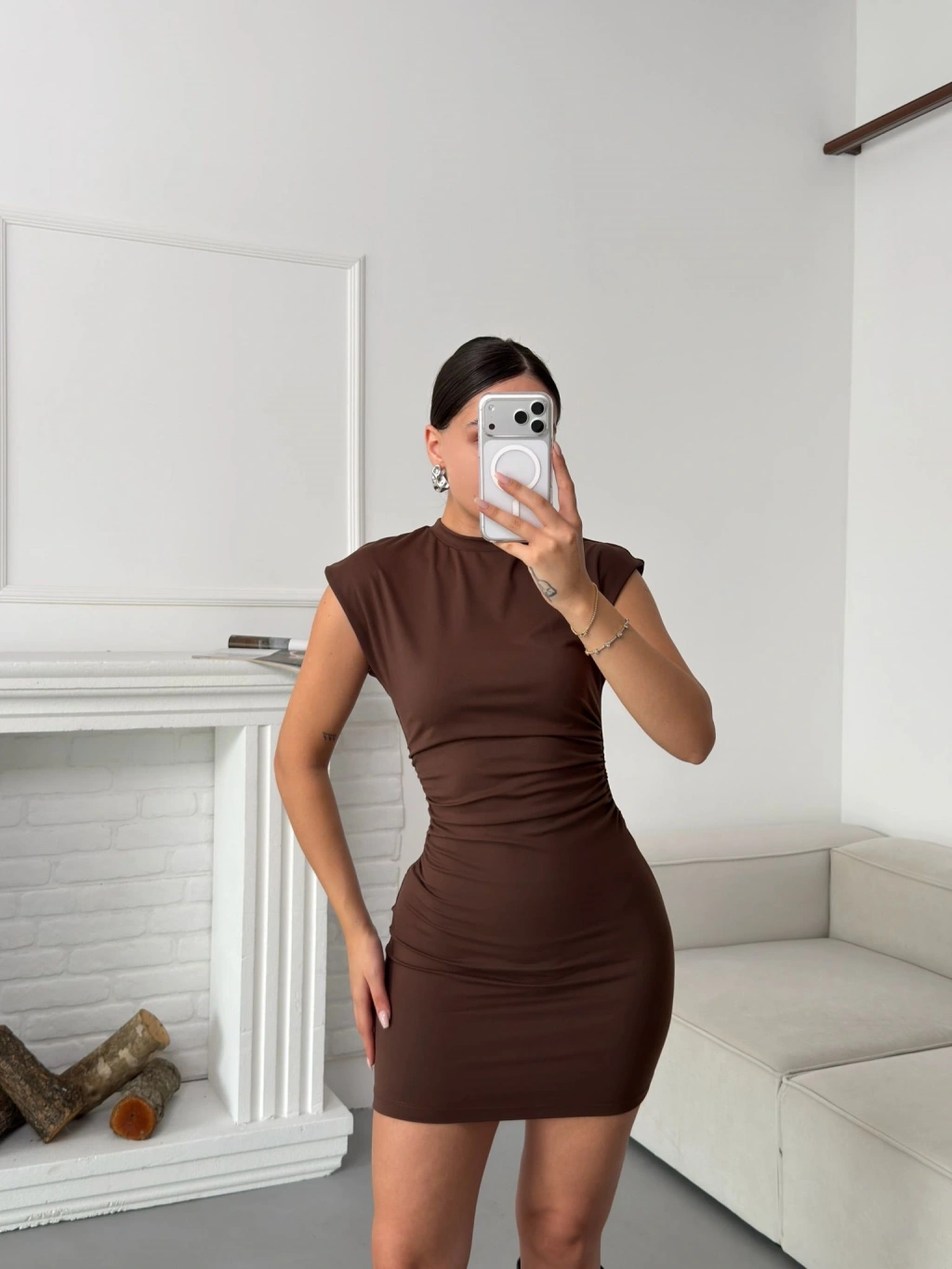 Sıfır Kol Büzgülü Elbise - KAHVE