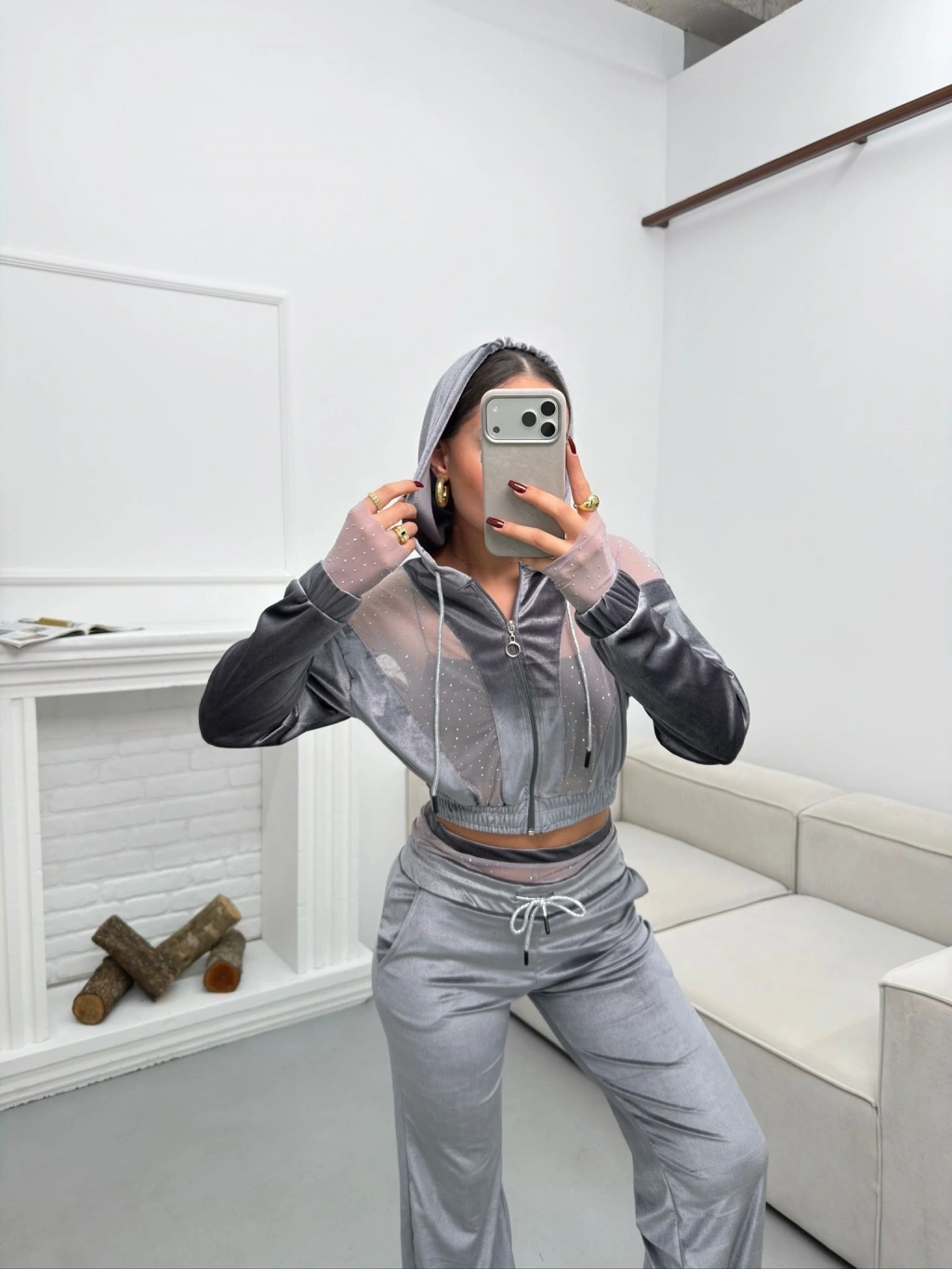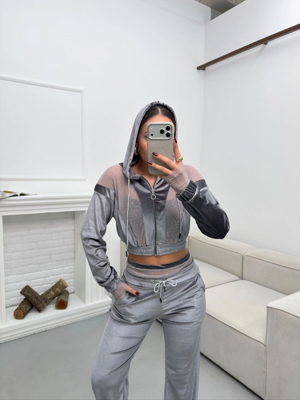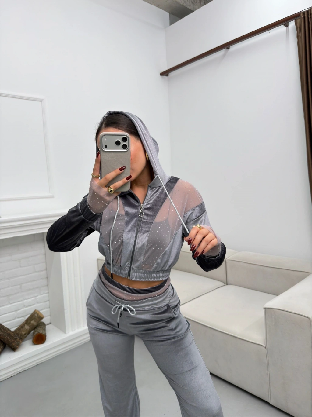 Şifon Detay Taşlı İkili Takım - GRİ