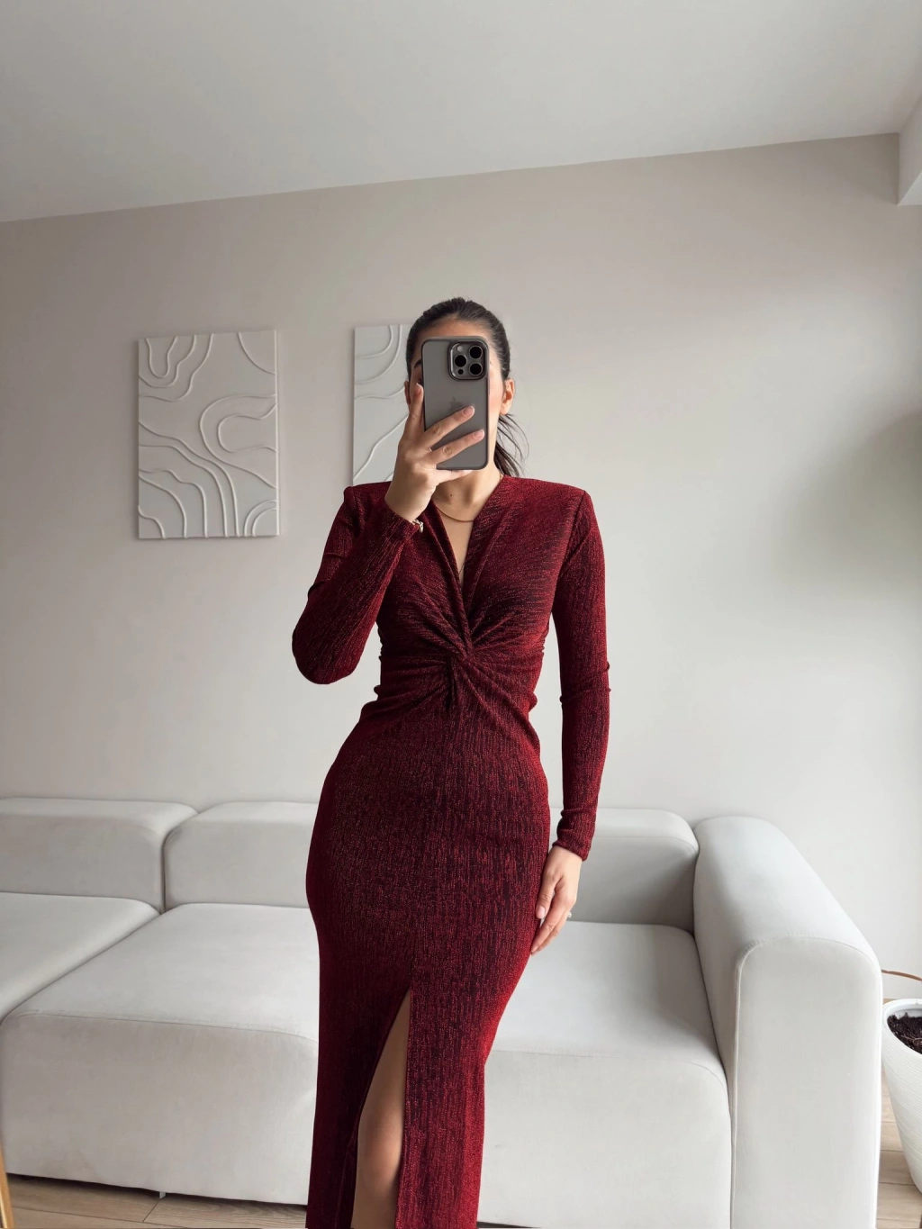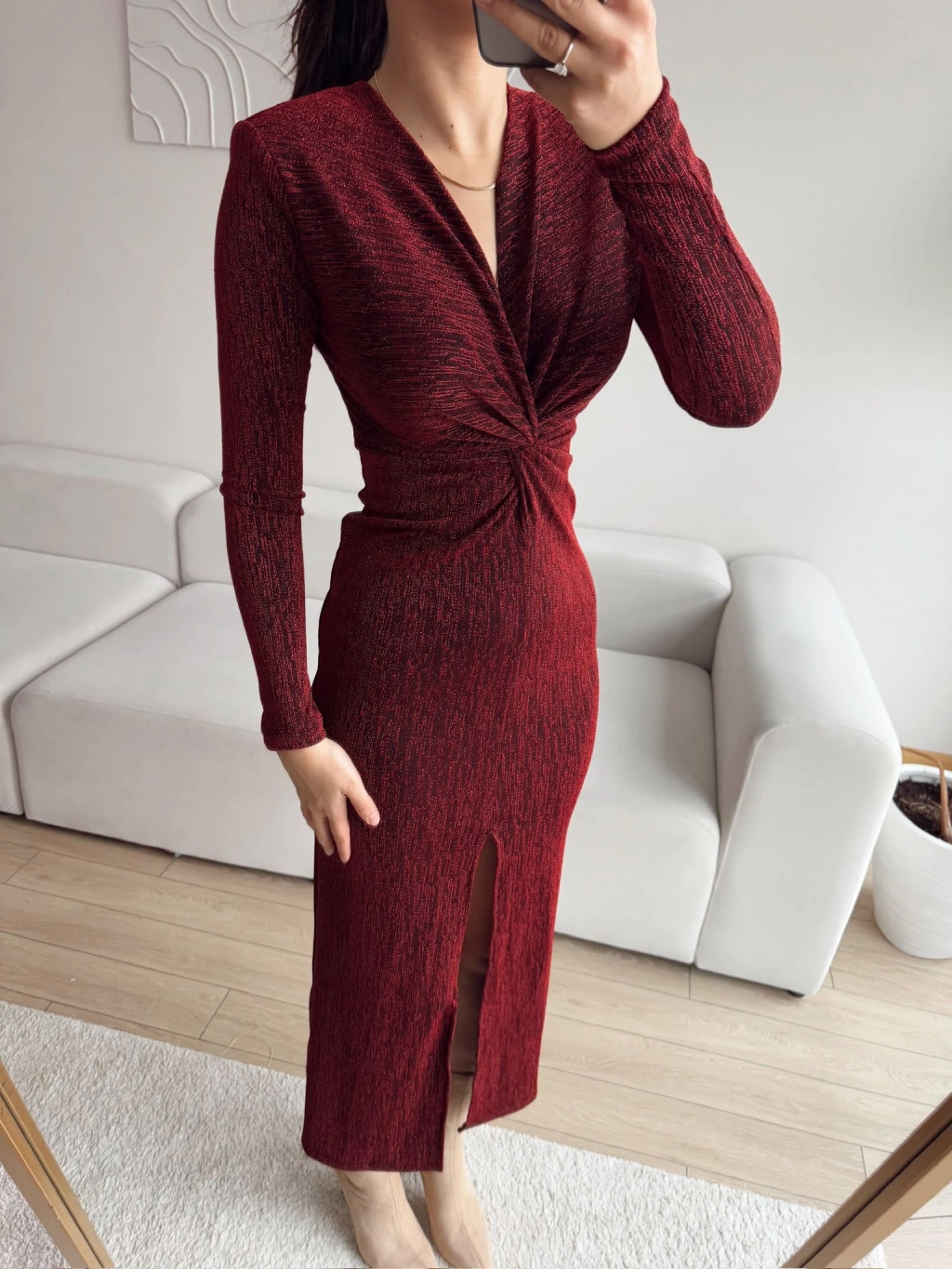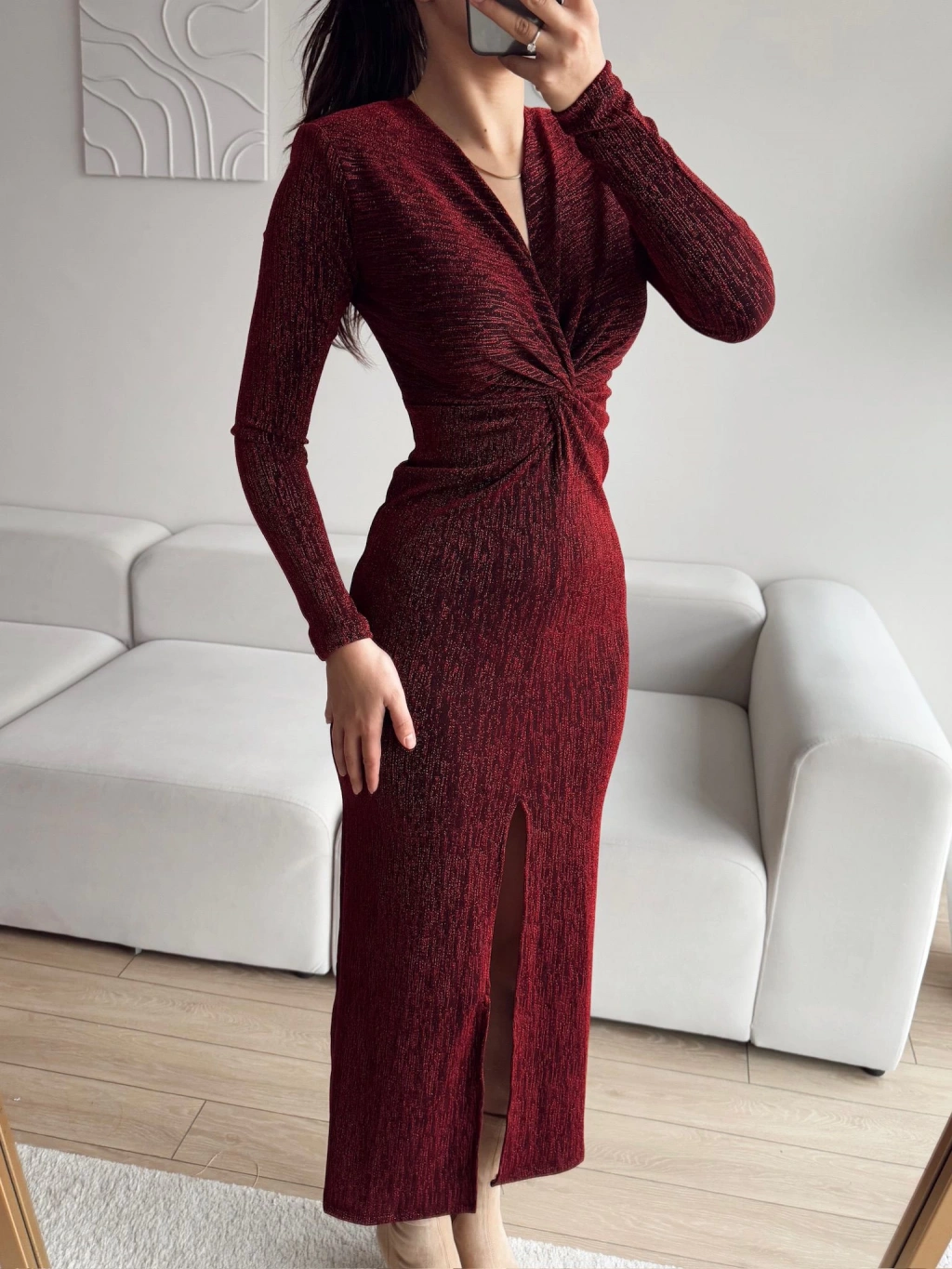 Bordo rengi ve simli dokusu ile zarif bir şıklık sunan bu kruvaze yaka büzgü elbise, sofistike ve şık bir görünüm arayanlar için mükemmel bir seçenek: