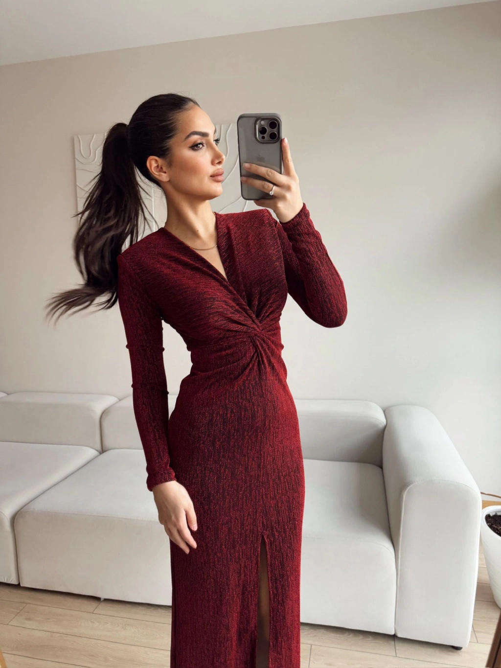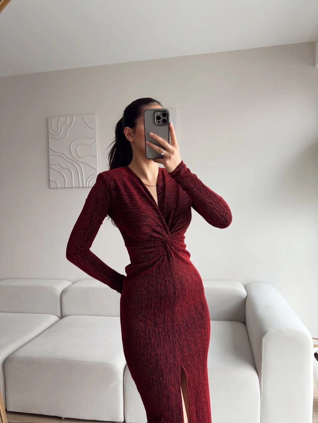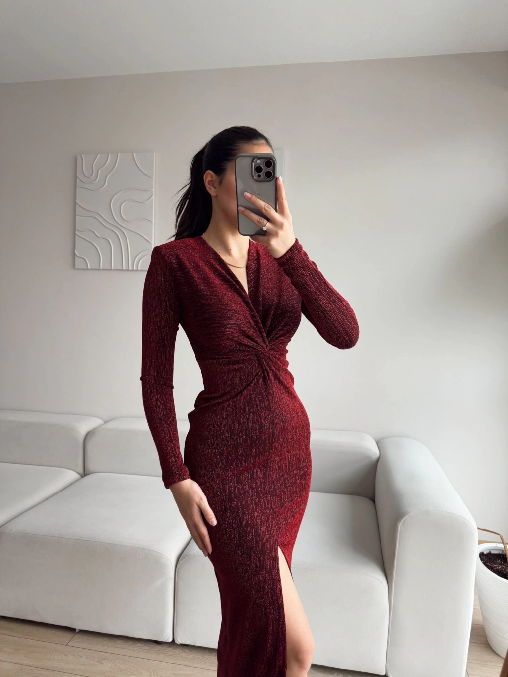 Bordo rengi ve simli dokusu ile zarif bir şıklık sunan bu kruvaze yaka büzgü elbise, sofistike ve şık bir görünüm arayanlar için mükemmel bir seçenek: