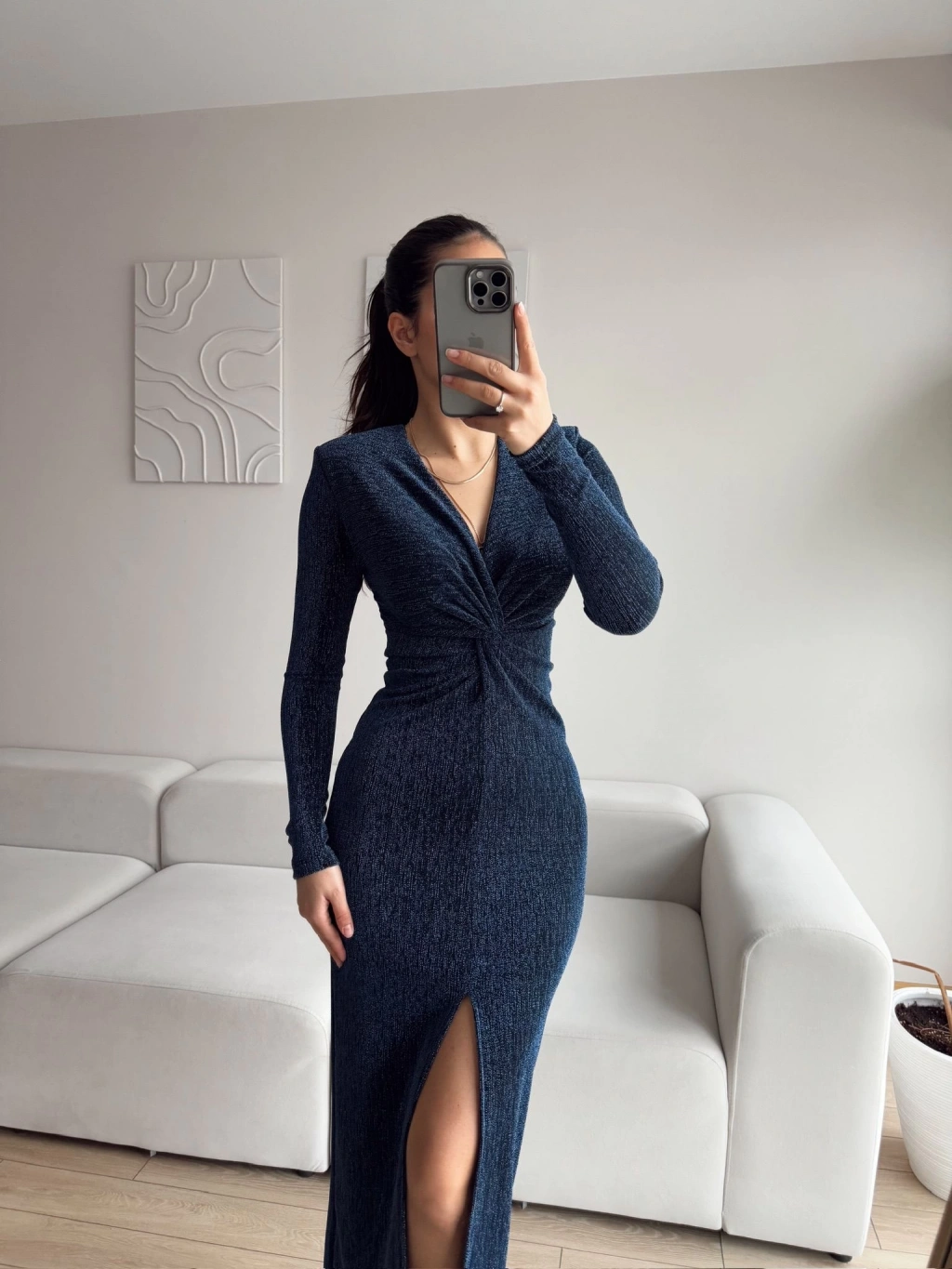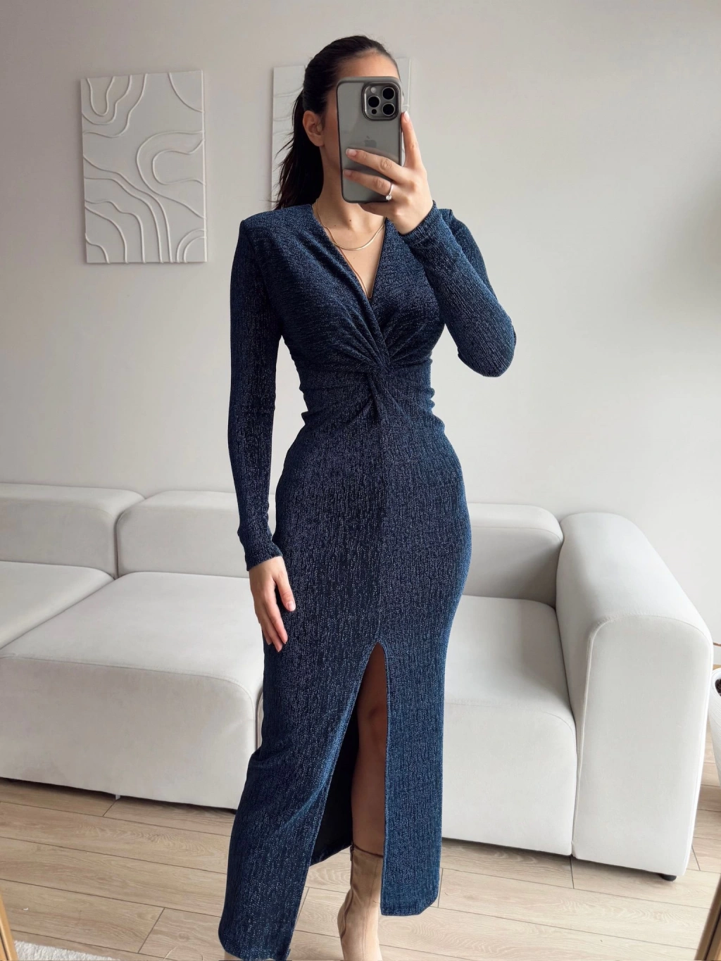 Simli dokusu ve zarif tasarımıyla dikkat çeken bu kruvaze yaka büzgü elbise, şıklığı ve rahatlığı bir arada sunarak özel anlarınızda parlamanızı sağlar: