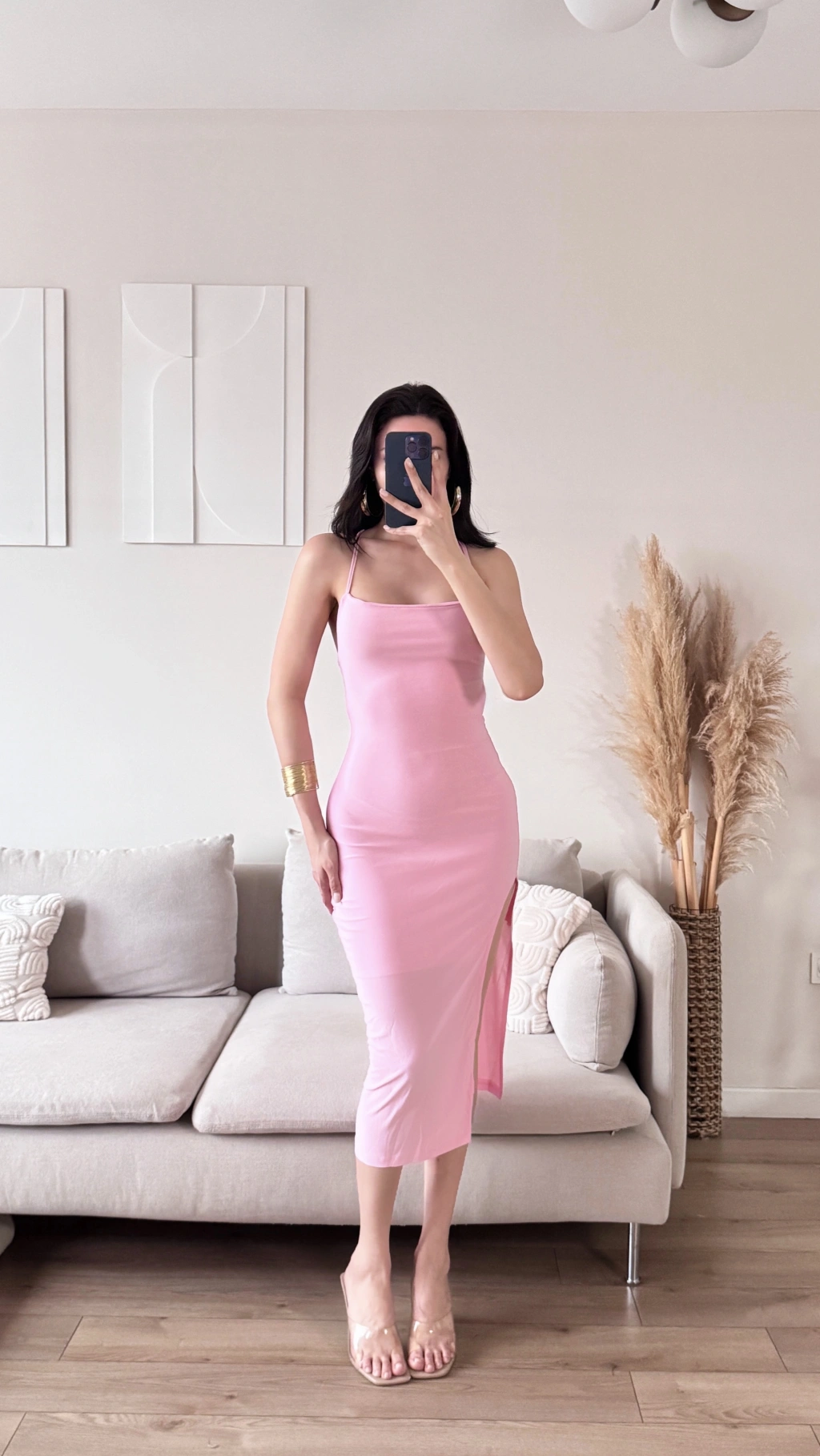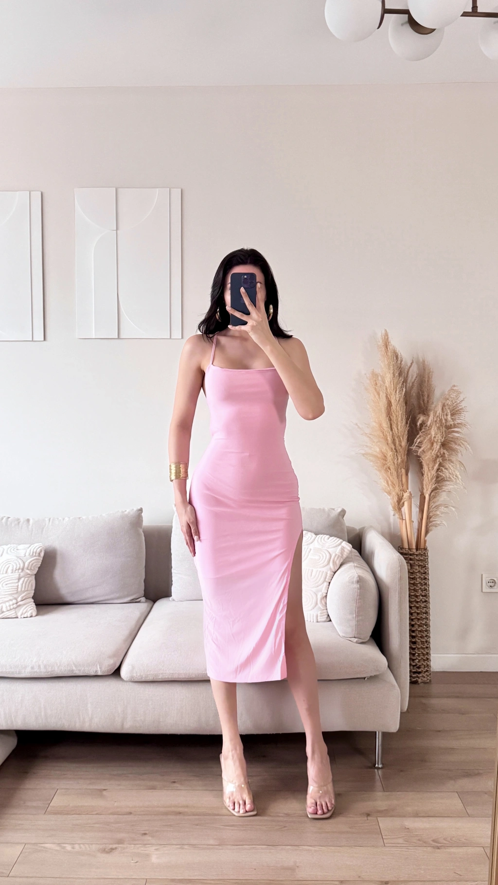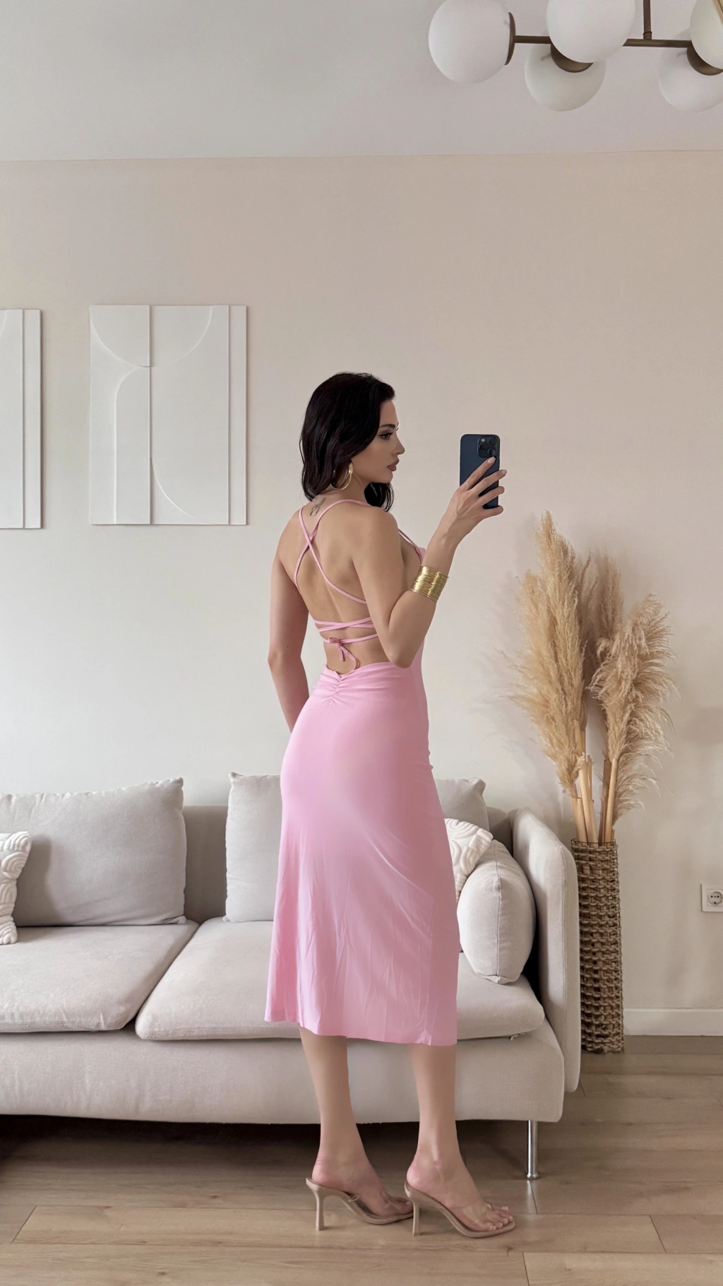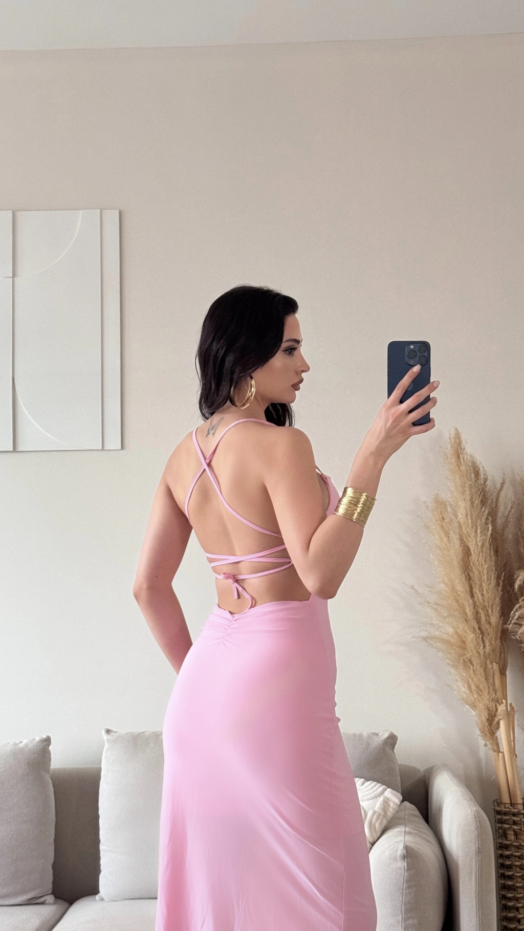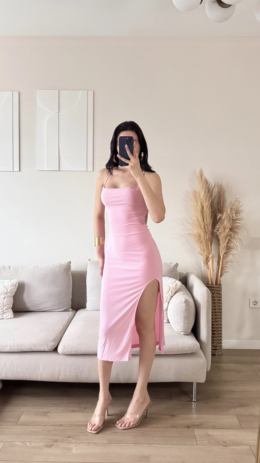 Sırt Dekolte Derin Yırtmaç Elbise - PEMBE