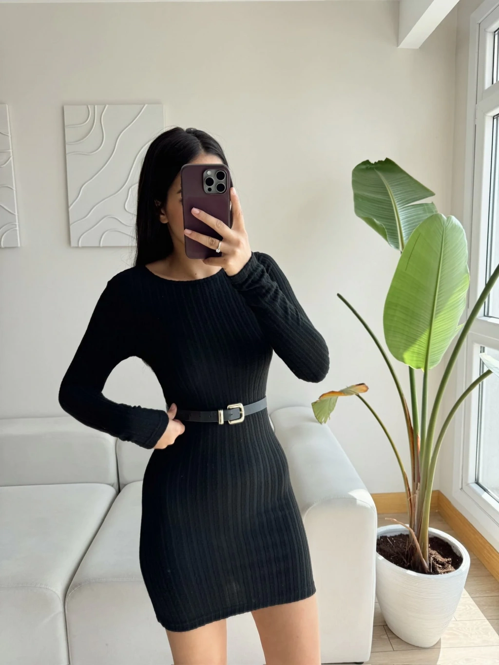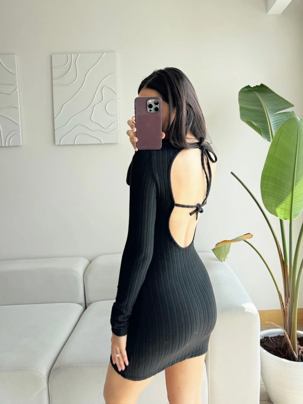 Sırt Dekolte Fitilli Elbise - SİYAH