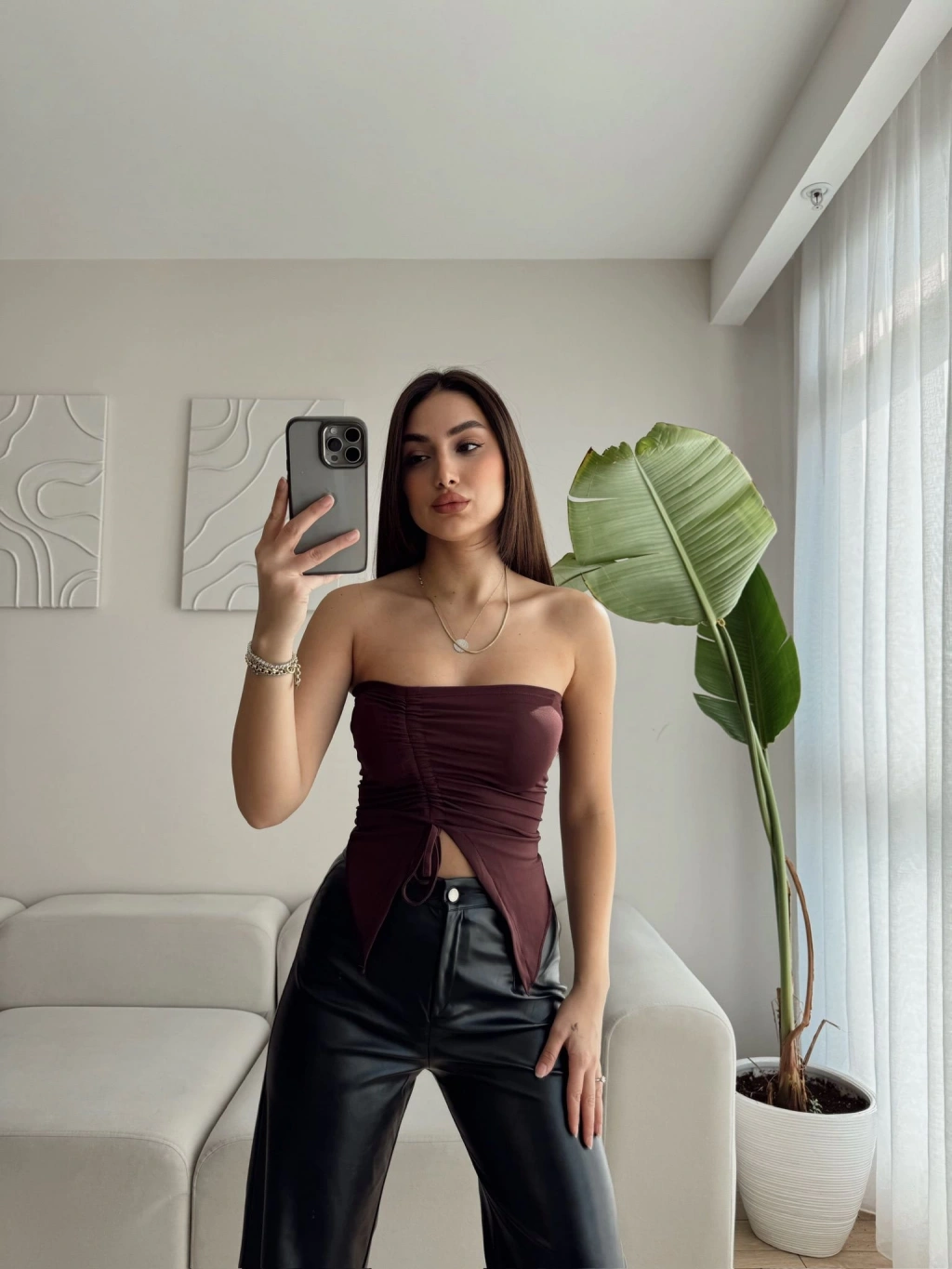 Straplez Büzgülü Crop - KAHVE