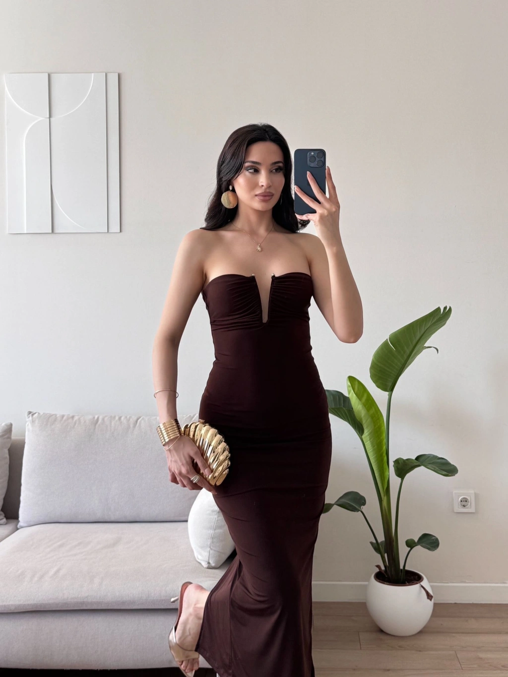 Straplez Kalp Yaka Yırtmaçlı Elbise - KAHVE