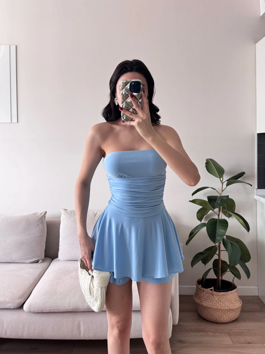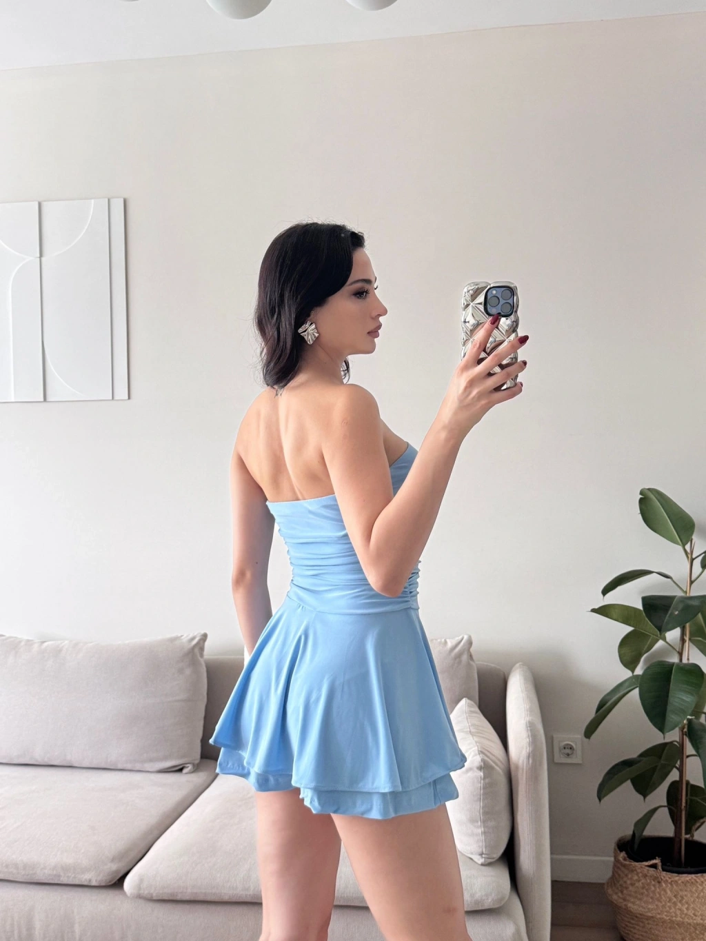 Straplez Volanlı Şortlu Elbise - MAVİ