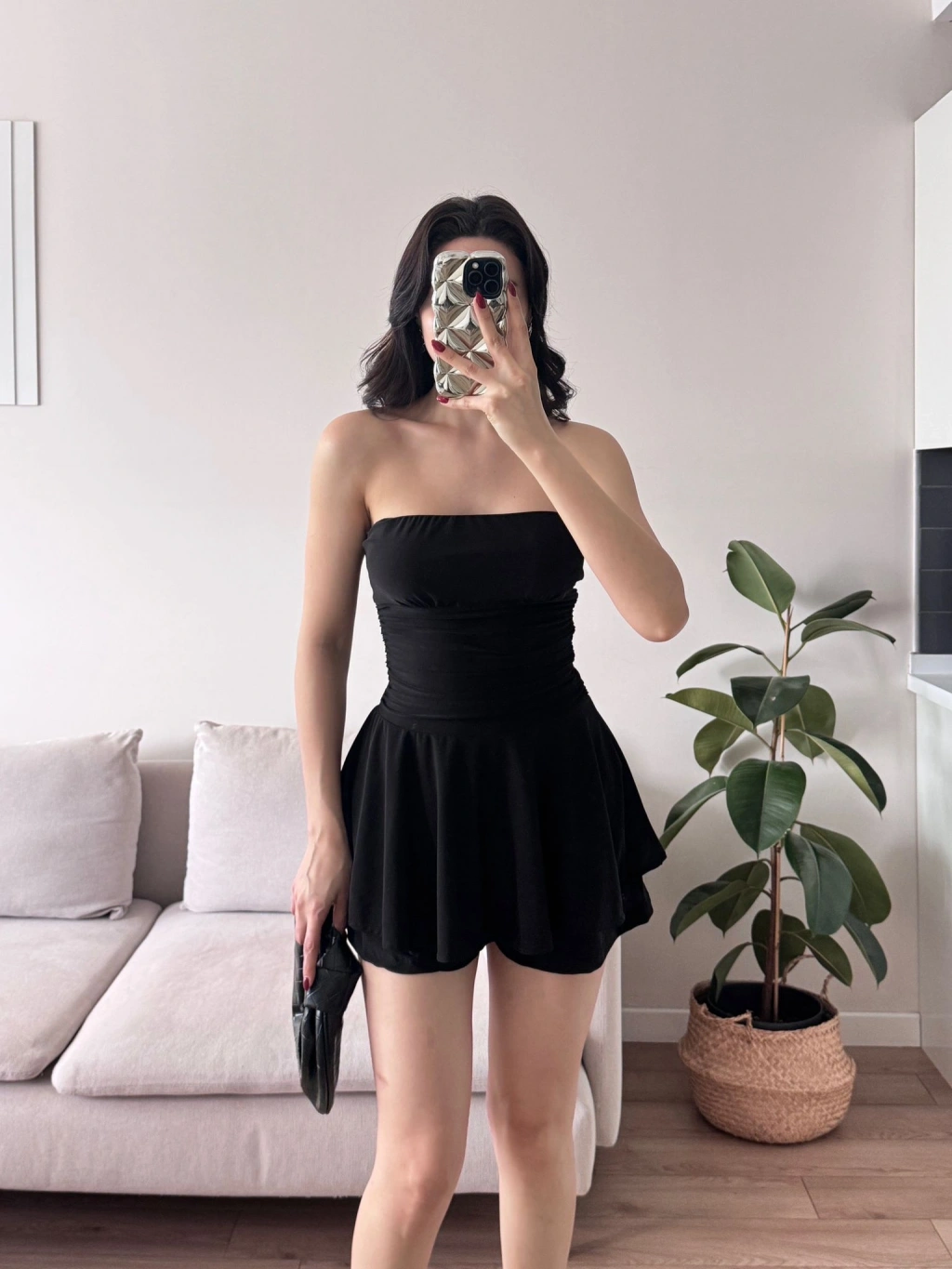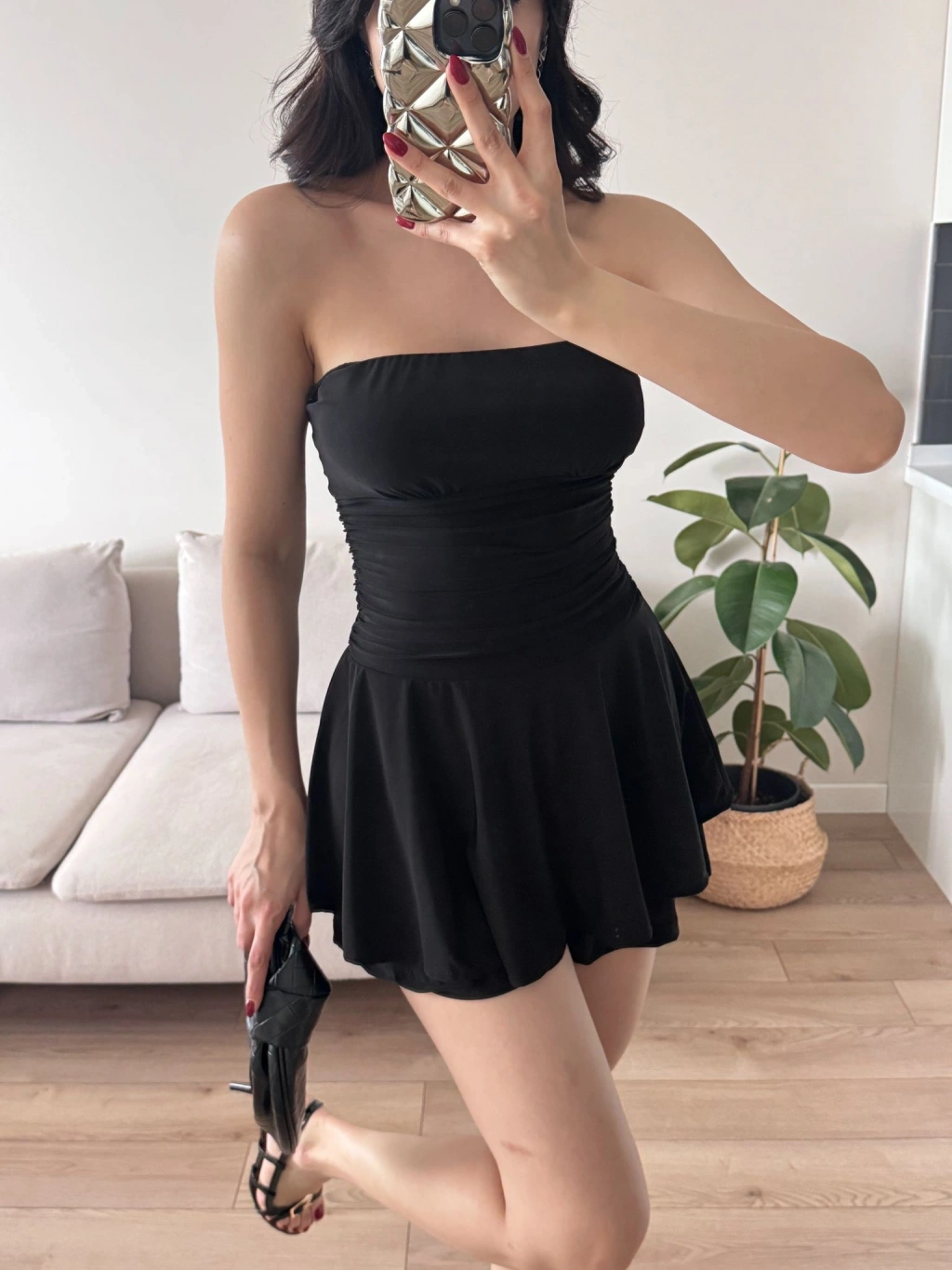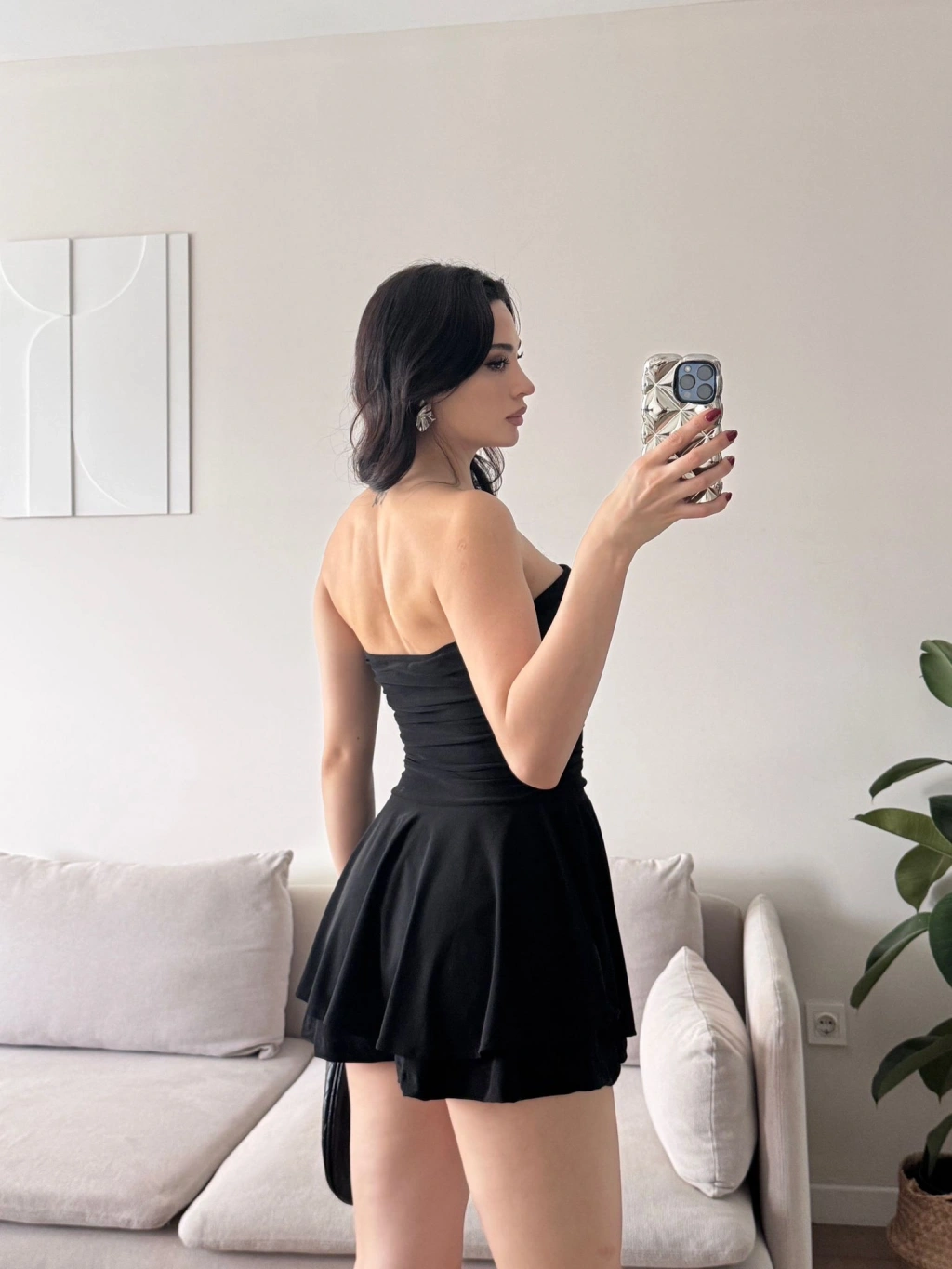 Straplez Volanlı Şortlu Elbise - SİYAH