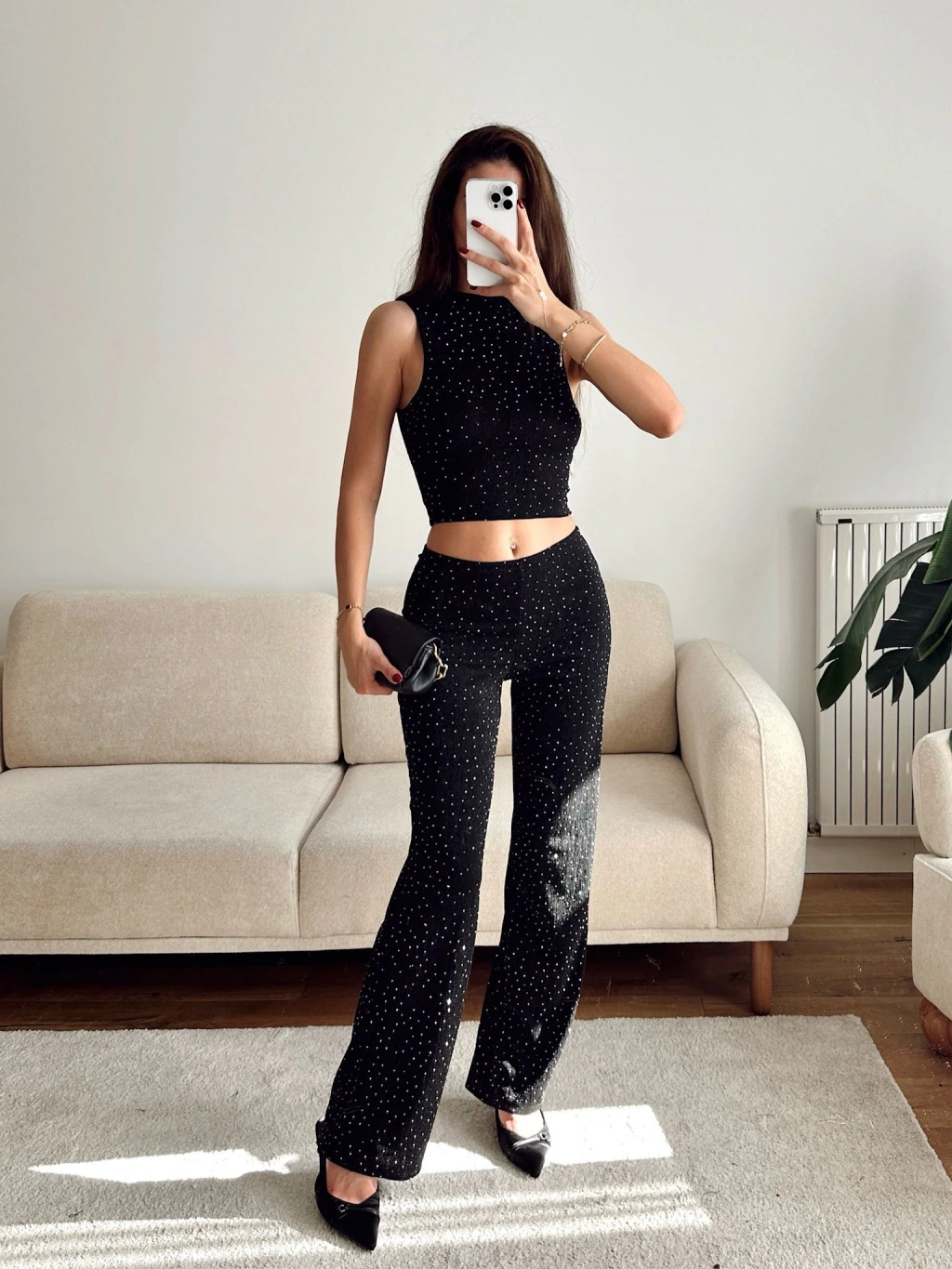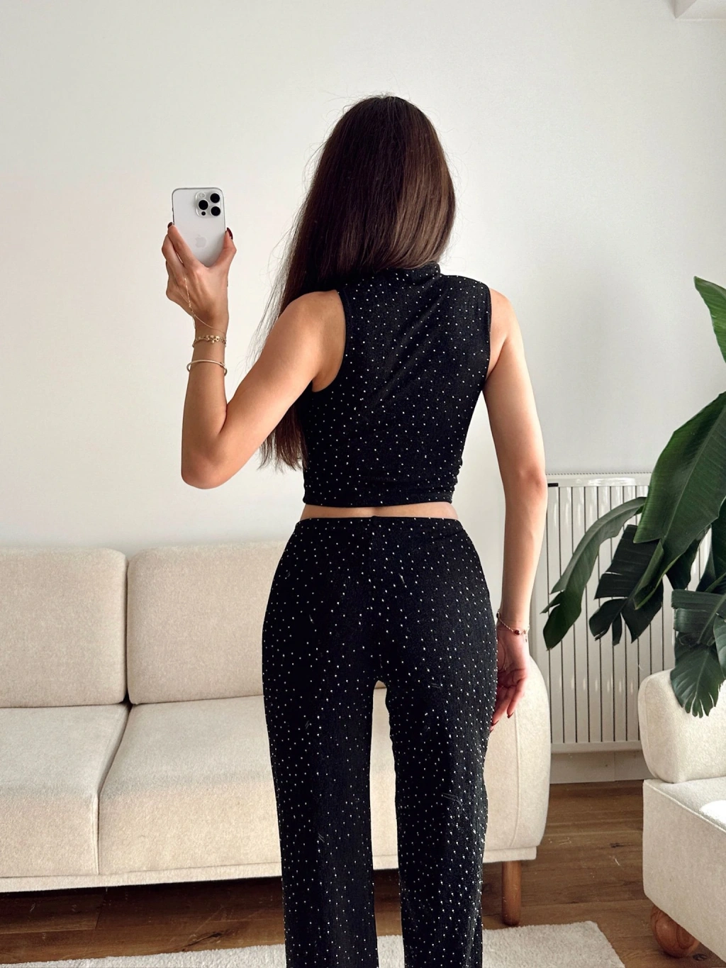 Taşlı Halter Crop & Pantolon Takım - SİYAH