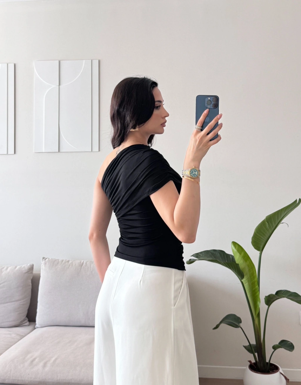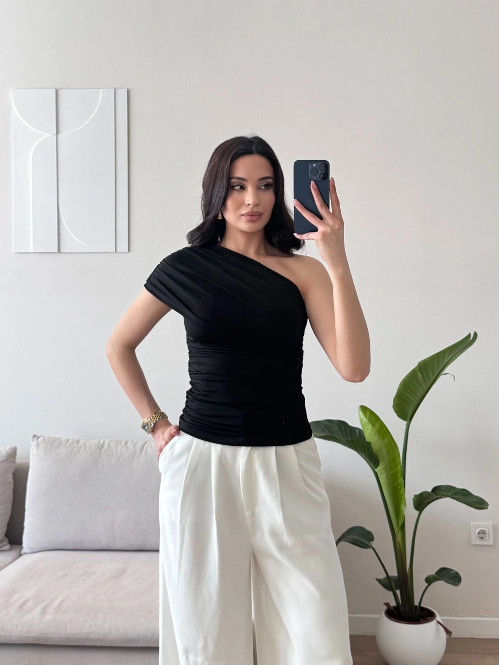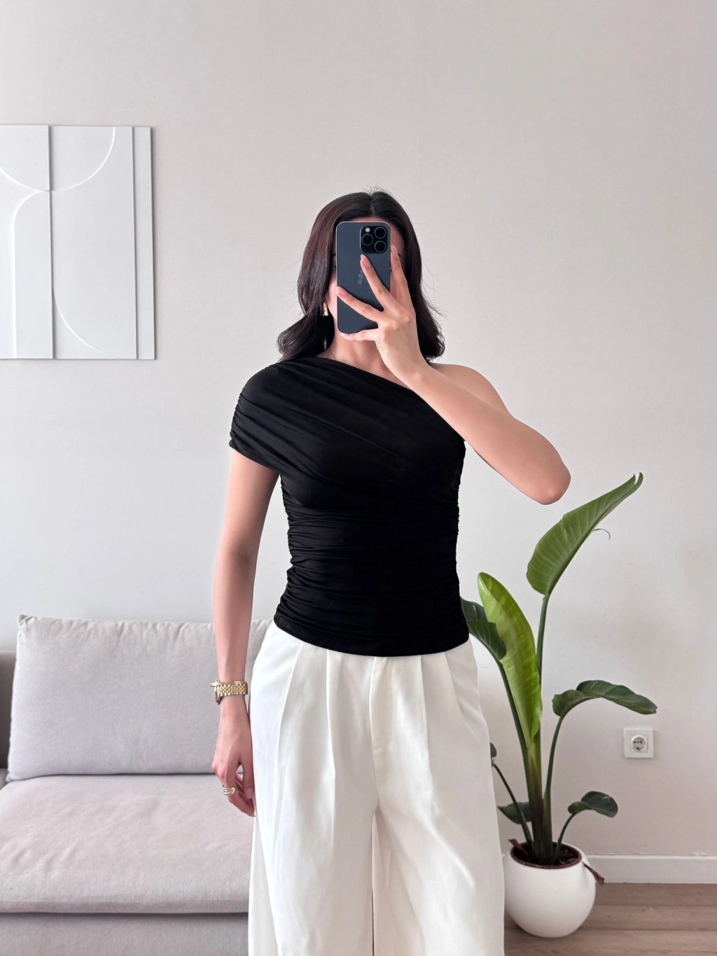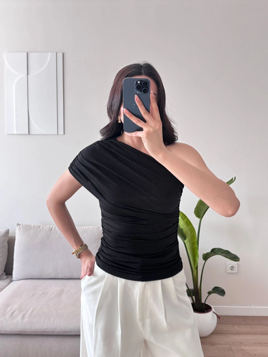 Tek Omuz Büzgülü Bluz - SİYAH