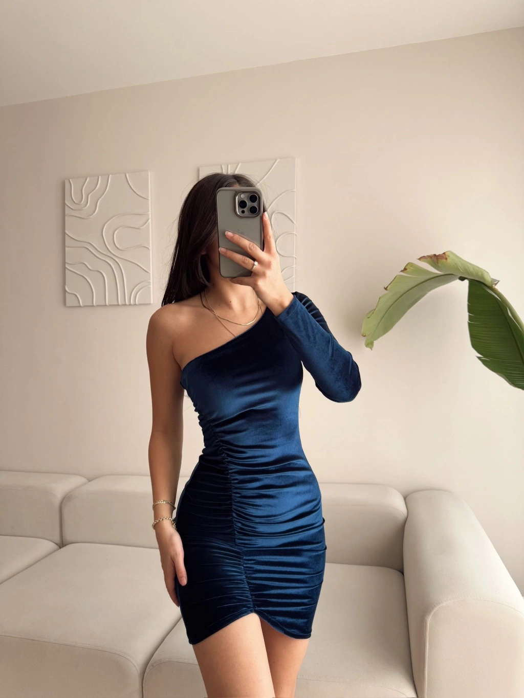 "Tek Omuz Büzgülü Kadife Elbise - Lacivert", zarafeti ve modern tasarımı bir arada sunan şık bir kıyafettir. İşte ürünün detaylı açıklaması: