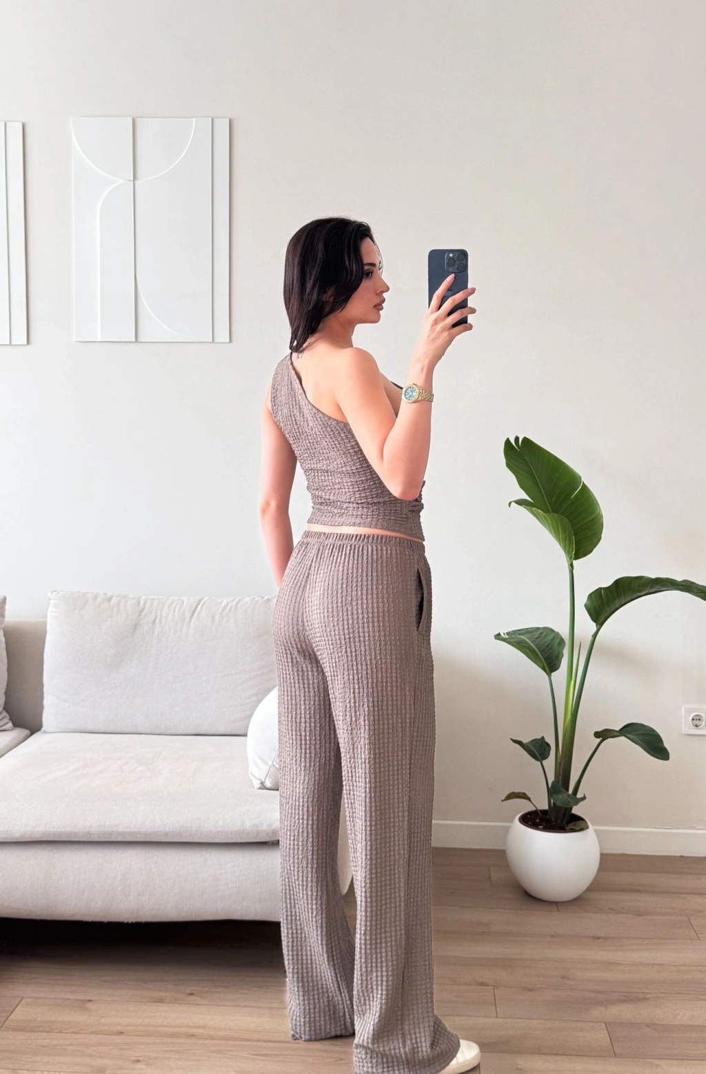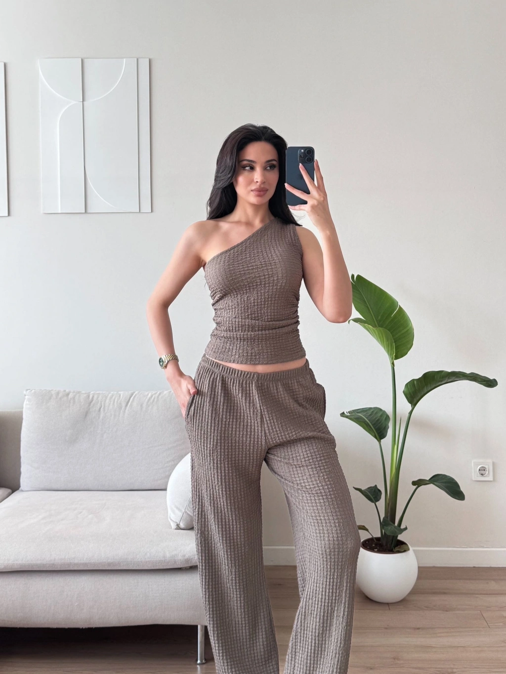 Tek Omuz Crop & Pantolon Takım - VİZON